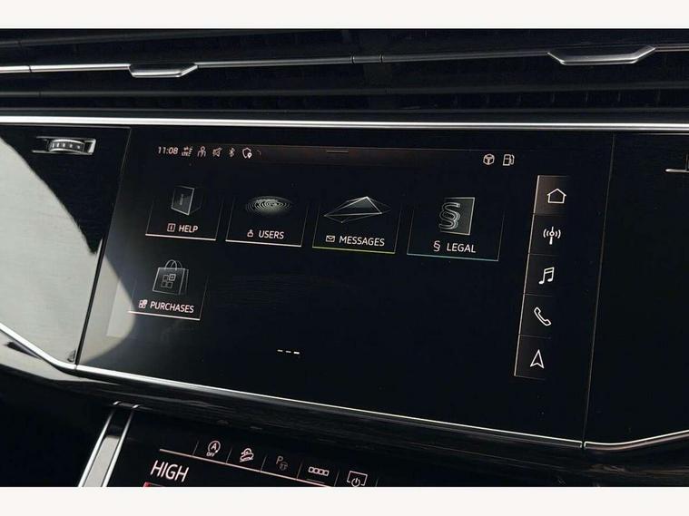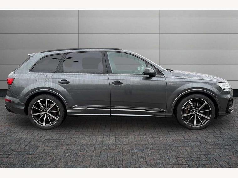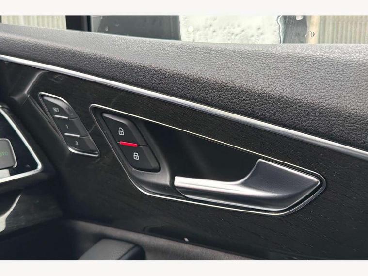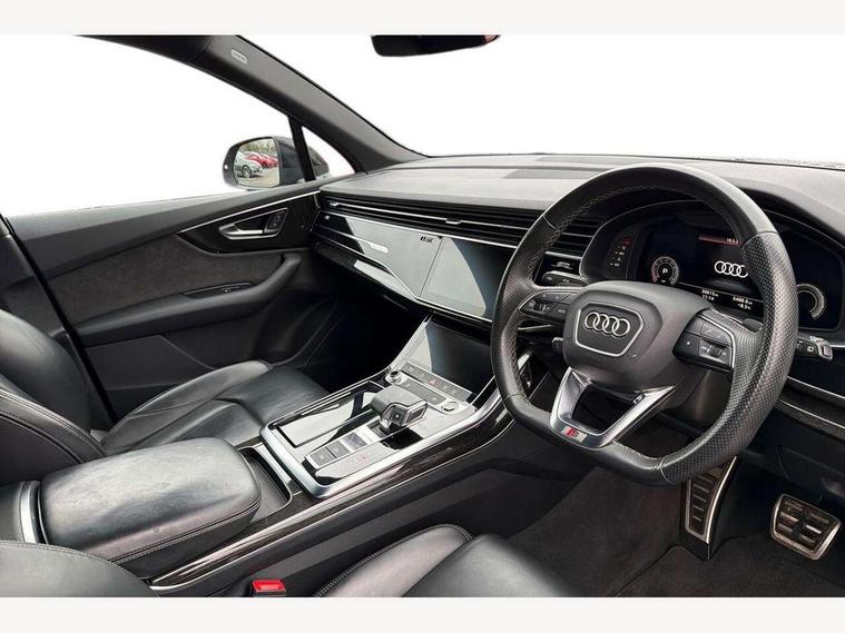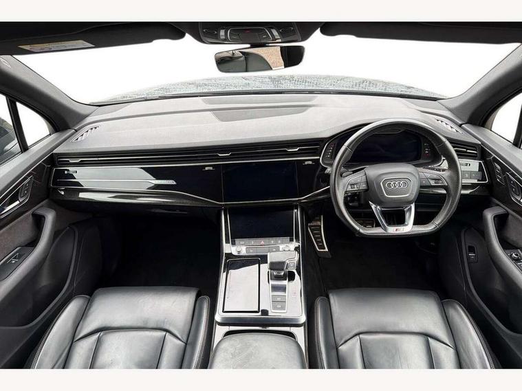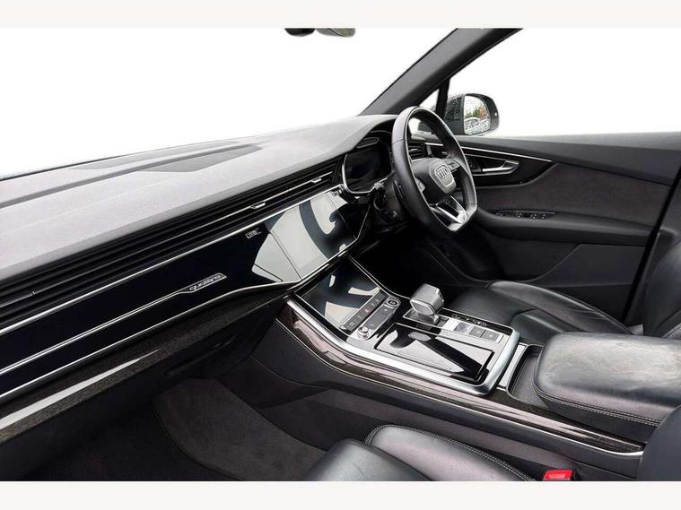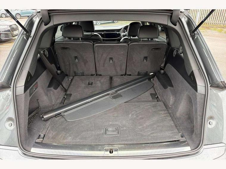 Audi connect safety and service (e-call), Audi connect with Amazon Alexa Integration, Audi drive select (Auto, Comfort, Dynamic, Efficiency, Individual, Off-road and All road), Bluetooth interface, Camera based traffic sign recognition, Electromechanical steering, MMI navigation plus with MMI touch screens includes 10.1" and 8.6" screens with haptic feedback, Natural voice recognition, Parking system plus with 360 degree display (front, rear and side sensors) - acoustic and visual park assist system, Power operated tailgate, Rear view camera, Smartphone interface includes wireless Apple carplay/Android Auto, Start/stop system, 48V Mild hybrid technology, 85 litre fuel tank, Adaptive air sports suspension, Quattro all wheel drive with self locking centre differential, Audi music interface - front 2 USB-C ports with charger and data functions, Audi sound system with 6 channel amplifier, 180 watt amplifying capacity and 10 loudspeakers including subwoofer, DAB digital radio module, 3rd brake light, Audi matrix LED headlights with dynamic front and rear indicators, Auto dimming frameless rear view mirror, Black roof rails, Bumpers in contrast paint scandium grey finish includes door trim and wheel arch trim strips, inlays in door strip contain quattro embossing, Electrically adj heated/folding + automatically dimming exterior mirrors with memory + automatic kerb side function for passenger side exterior mirror, Heat insulating glass in windshield, Integrated LED indications in door mirrors, LED daytime running lights, LED rear tail lights, Privacy glass - dark tinted rear and rear side windows from B-pillar backwards, Rear side wing doors, Rear wiper, 2 seat bench in 3rd row, 3 seat bench in 2nd row, 4 zone deluxe automatic climate control, 7 seat layout with ISOFIX points for the front passenger seat and rear passenger seat, Black cloth headlining, Comfort front centre armrest, Electric adjustable front seat with 4 way lumbar support, driver memory functionality, Folding rear seats, Front head restraints, Front/rear floor mats, Heated front seats, Illuminated door sill trims with S logo, LED interior ambient lighting, Luggage compartment cover, Luggage compartment sill protection in stainless steel, Rear head restraints, Single front passenger seat, Stainless steel pedals, Sunvisors with illuminated vanity mirrors, Titanium black styling pack - Q7/SQ7, 3 point seatbelts on all rear seats, Audi pre sense front, Child locks on rear doors, Driver and front passenger, front side and curtain airbags, Electromechanical parking brake, Electronic Stabilisation Control (ESC) including ABS, ASR and EDL, Extended pedestrian protection measures, Hill hold assist, Seatbelt monitoring, Tyre pressure loss indicator, Warning triangle and first aid kit, Anti theft alarm, Anti-theft wheel bolts and wheel loosening detection, Keyless Go, Remote central locking, Polished oak trim with grey finish inlay, Tool kit, Tyre repair kit,