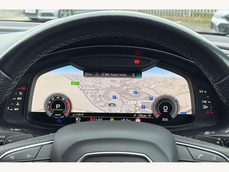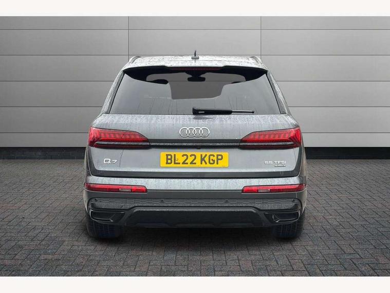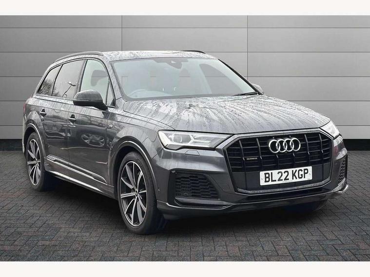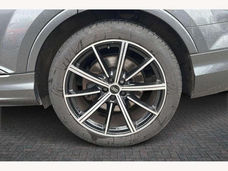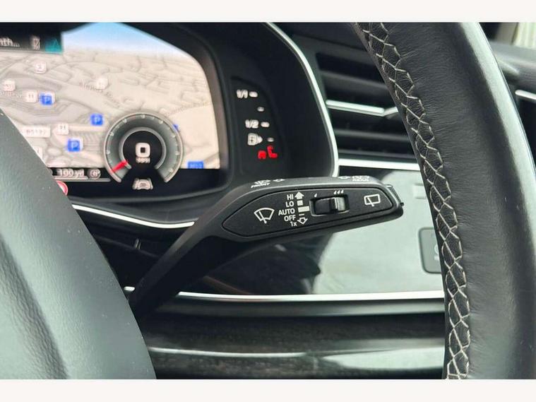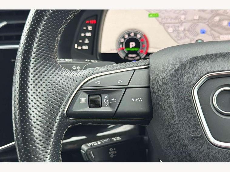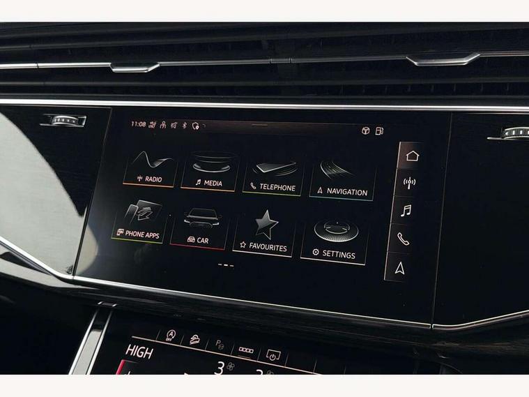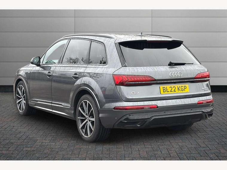 Audi connect safety and service (e-call), Audi connect with Amazon Alexa Integration, Audi drive select (Auto, Comfort, Dynamic, Efficiency, Individual, Off-road and All road), Bluetooth interface, Camera based traffic sign recognition, Electromechanical steering, MMI navigation plus with MMI touch screens includes 10.1" and 8.6" screens with haptic feedback, Natural voice recognition, Parking system plus with 360 degree display (front, rear and side sensors) - acoustic and visual park assist system, Power operated tailgate, Rear view camera, Smartphone interface includes wireless Apple carplay/Android Auto, Start/stop system, 48V Mild hybrid technology, 85 litre fuel tank, Adaptive air sports suspension, Quattro all wheel drive with self locking centre differential, Audi music interface - front 2 USB-C ports with charger and data functions, Audi sound system with 6 channel amplifier, 180 watt amplifying capacity and 10 loudspeakers including subwoofer, DAB digital radio module, 3rd brake light, Audi matrix LED headlights with dynamic front and rear indicators, Auto dimming frameless rear view mirror, Black roof rails, Bumpers in contrast paint scandium grey finish includes door trim and wheel arch trim strips, inlays in door strip contain quattro embossing, Electrically adj heated/folding + automatically dimming exterior mirrors with memory + automatic kerb side function for passenger side exterior mirror, Heat insulating glass in windshield, Integrated LED indications in door mirrors, LED daytime running lights, LED rear tail lights, Privacy glass - dark tinted rear and rear side windows from B-pillar backwards, Rear side wing doors, Rear wiper, 2 seat bench in 3rd row, 3 seat bench in 2nd row, 4 zone deluxe automatic climate control, 7 seat layout with ISOFIX points for the front passenger seat and rear passenger seat, Black cloth headlining, Comfort front centre armrest, Electric adjustable front seat with 4 way lumbar support, driver memory functionality, Folding rear seats, Front head restraints, Front/rear floor mats, Heated front seats, Illuminated door sill trims with S logo, LED interior ambient lighting, Luggage compartment cover, Luggage compartment sill protection in stainless steel, Rear head restraints, Single front passenger seat, Stainless steel pedals, Sunvisors with illuminated vanity mirrors, Titanium black styling pack - Q7/SQ7, 3 point seatbelts on all rear seats, Audi pre sense front, Child locks on rear doors, Driver and front passenger, front side and curtain airbags, Electromechanical parking brake, Electronic Stabilisation Control (ESC) including ABS, ASR and EDL, Extended pedestrian protection measures, Hill hold assist, Seatbelt monitoring, Tyre pressure loss indicator, Warning triangle and first aid kit, Anti theft alarm, Anti-theft wheel bolts and wheel loosening detection, Keyless Go, Remote central locking, Polished oak trim with grey finish inlay, Tool kit, Tyre repair kit,