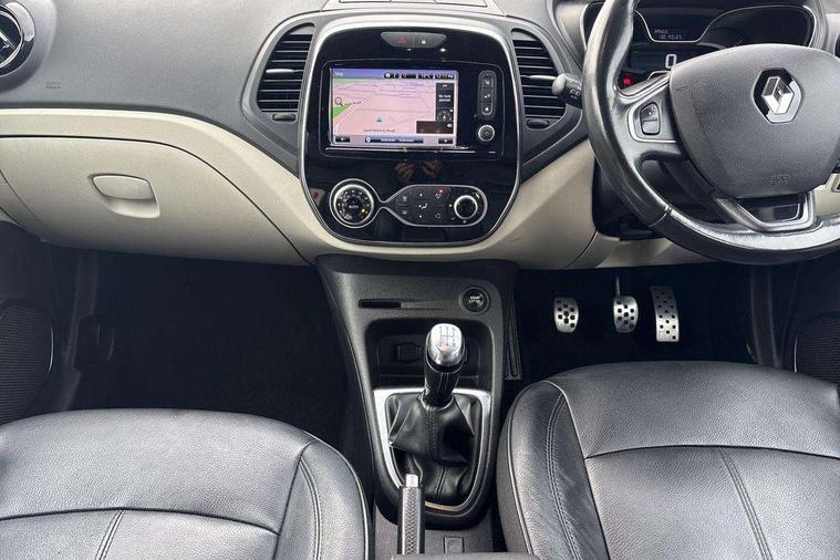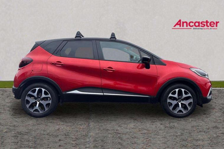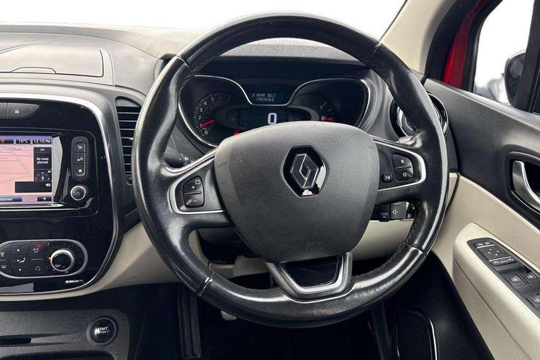 Cruise control + speed limiter, Eco mode, Handsfree parking with side moulding and blind spot warning, Trip computer, Variable PAS, Auxiliary input socket, Body colour door handles, Body coloured bumpers, Electric adjustable/heated/auto folding door mirrors, Electric front windows + one touch + anti-pinch, Electric rear windows, Extra tinted glass in rear windows and tailgate, Full LED headlamps, Grey front and rear skid plate, LED daytime running lights, LED front fog lights with static cornering light function, Rain sensitive wipers + automatic lighting, Rear wiper, Variable intermittent front wash/wipe, 12V Accessory socket, 3 rear headrests, 60/40 split folding rear seat bench, Automatic climate control with one touch demist function, Centre console storage tray, Compartment in glovebox, Front centre armrest, Front cupholder, Front seat backrest storage nets, Heated front seats, Heating system with pollen filter, Height adjustable driver's seat, Height adjustable SRP front headrests, Height/reach adjust steering wheel, ISOFIX on front passenger and rear outer seats, Leather steering wheel, Light harmony dashboard and door panels, Reversible boot floor, Storage area on top of dashboard, Storage between front seats, Storage compartments in doors, Storage space near handbrake, Synthetic leather/cloth upholstery, Variable boot floor, Exterior touch pack Chrome - Captur, Interior touch pack Chrome - Captur, Premium pack - Captur, Techno pack with front and rear parking sensors - Captur, 3 point seatbelts on all rear seats, ABS+EBA, Driver/Front Passenger airbags, ESC - Electronic Stability Control + traction control, Front disc brakes and rear drum brakes, Front passenger airbag deactivation, Front side airbags(head+thorax), Hill start assist, Rear door child safety locks, Seatbelt warning, Tyre pressure warning light, Automatic door locking, Deadlocking system, Hands free access with keycard and start button, RAID (Renault Anti-Intruder Device) with automatic door locking, Remote central locking, Thatcham Cat 2 engine immobiliser, 17" Emotion alloy wheels with black insert,