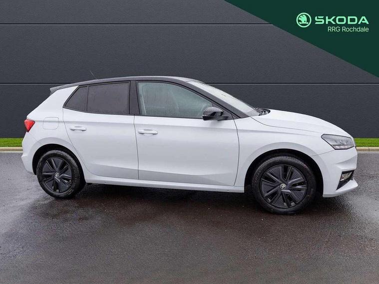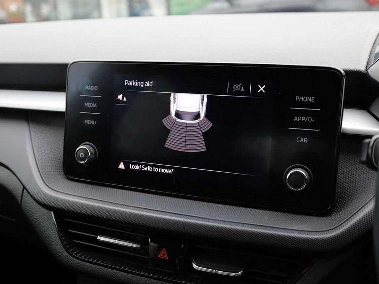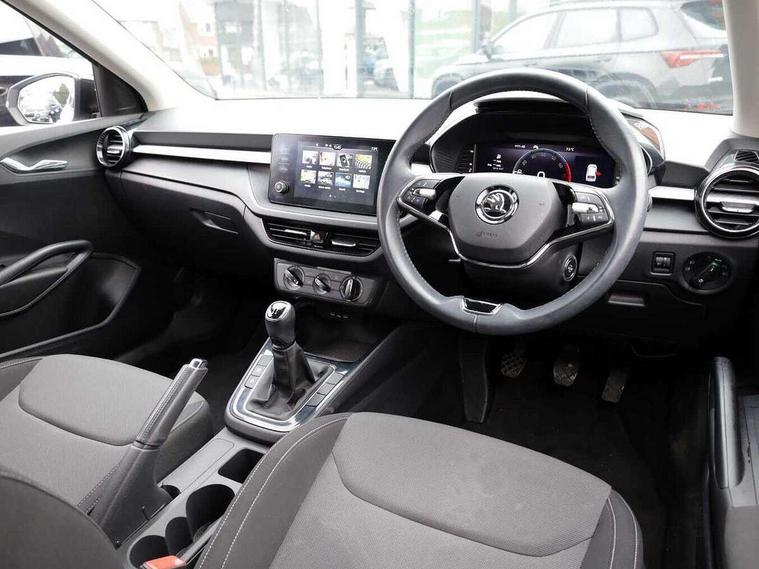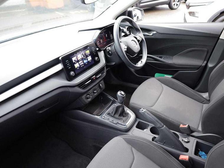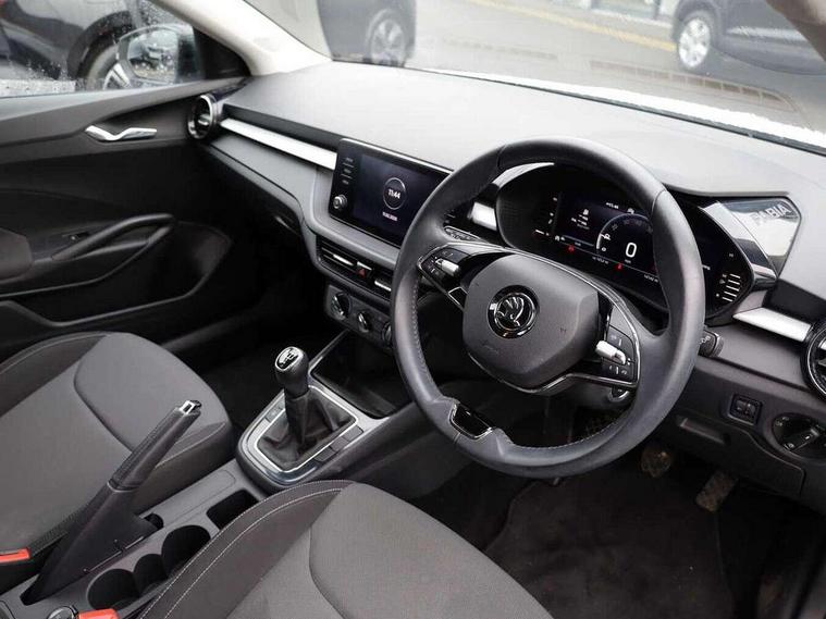 Bluetooth connection, Driver alert system - DAS, Electromechanical power steering, Exterior temperature gauge, Lane assist including road edge detection, Service interval indicator, Virtual cockpit with 10.25" colour display, 2x USB-C in the front (for data transmission and charging), 6 Speakers (4 in front and 2 in rear), Auxiliary socket for external MP3 player, Bolero radio with 8" colour display, DAB digital radio reception, Basic rear light, Body coloured bumpers, Dimming rear view mirror with black frame, Door mirror integrated indicators, Electrically adjustable and heated door mirrors, Electrically adjustable front windows with function auto up/down, Front window wiper intermittent control, Headlight range control - Automatic, Ice scraper in fuel cap, LED daytime running lights with coming and leaving home feature, Mechanical adjustable rear windows, Privacy glass, Rear LED fog light, Rear side wing doors, Rear window wiper with washing nozzles, Roof mounted spoiler, SKODA tailgate lettering in chrome, Third brake light, 3 rear headrests, Backrest split and folding, Central console with fixed cup holder and storage box, Chrome handbrake release button, Fabric upholstery, Gearshift knob/handle in leather, Grain satin black interior door handles, Hand brake lever handle in leather, Height adjustable front headrests, Height adjustable steering wheel, ISOFIX and TopTether anchorage points to the outer rear seats, ISOFIX and TopTether on the front passenger seat, Luggage compartment lighting, Pollen filter, Rear seat bench unsplit, Single front passenger seat, Storm grey headlining, Sun visors with mirror and airbag label on passenger side, Ticket holder, Umbrella in drivers door, 3-point height adjustable front seats belts with pretensioner and force limiter, Automatic warning lights in case of crash, Driver and passengers airbag with switch off function, e-Call+, ESC including ABS, MSR, ASR, EDS, HBA and XDS, Front and rear seat belt warning, FRONT ASSIST (AEB City and AEB Inter Urban), Front side airbags, Head airbags, One tone horn, Pedestrian protection, Three rear 3-points safety seat belts with pretensioner and force limiter including stop function for outer rear seat belts, Tyre pressure monitoring system, Anti-theft alarm system including immobiliser, interior monitoring, backup horn, and towing protection, Anodized cross line upper decorative trim, Colour Edition air vents, Grain satin black central console cover, Grain satin black lower decorative trim, Satin black door and side trim panel in front, Anti-theft wheel bolts protection, Super-low rolling resistance tyres,