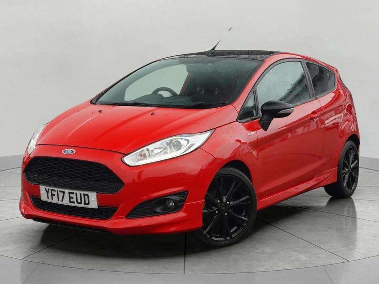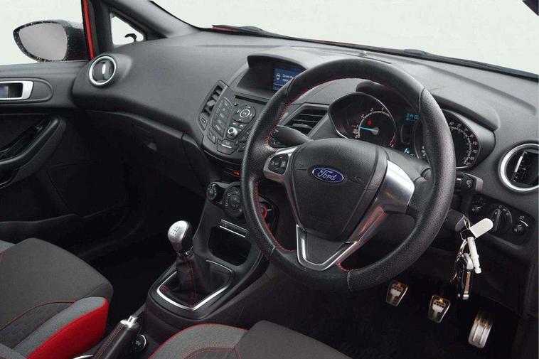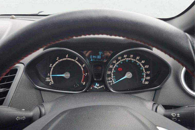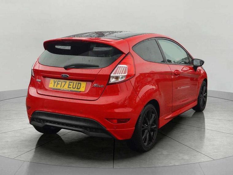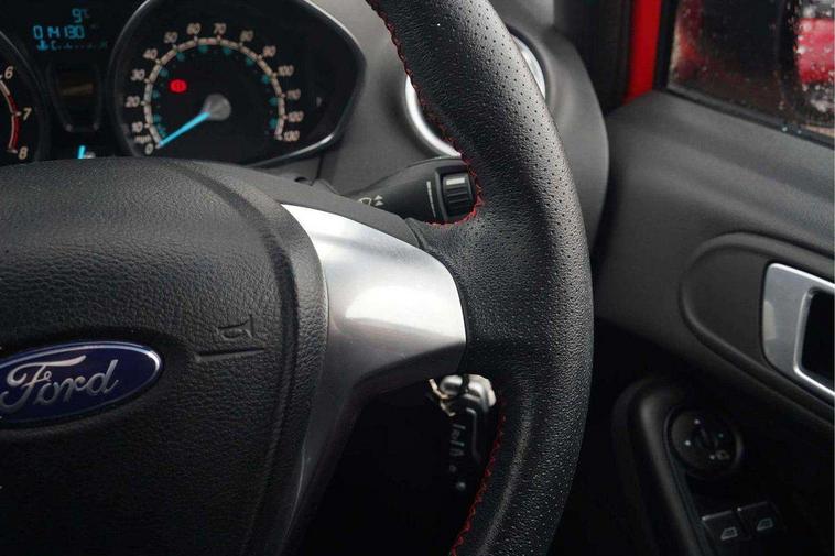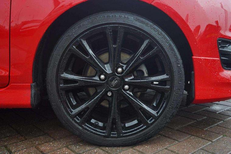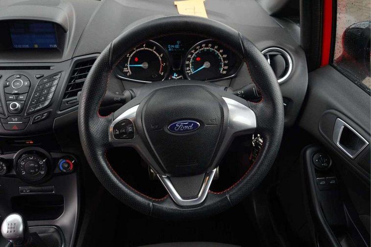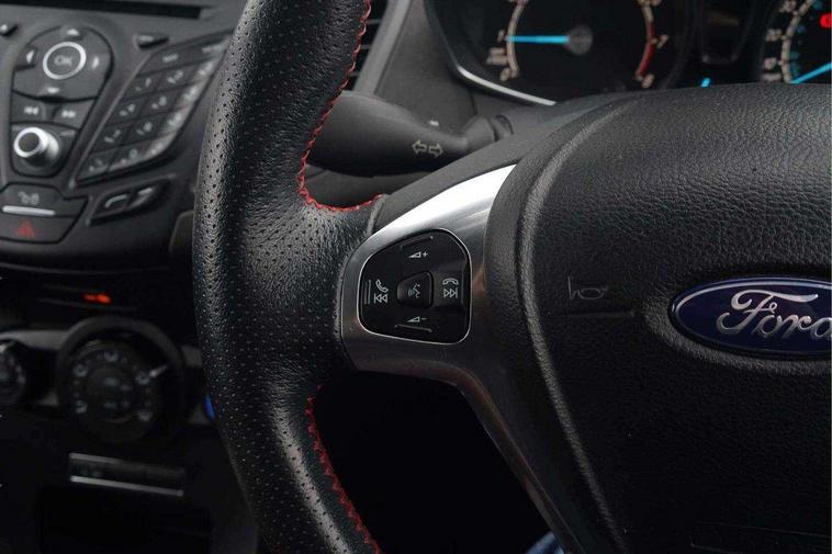 Electric power steering, SYNC Emergency Assistance, Trip computer, Sports suspension, 6 speakers, Auxiliary input socket, DAB radio/CD and Ford SYNC Bluetooth connection with voice control, Steering wheel mounted controls, USB connection, Black grille, Black roof and mirror caps, Body colour bumpers, Body colour door handles, Body colour large rear spoiler, Body colour side skirt, Body colour tailgate handle, Chrome beltline trim, Courtesy headlamp delay, Electric adjustable heated door mirrors, Electric front windows/one touch facility, Front fog lights, LED daytime running lights, LED rear lights, Quickclear heated windscreen, Rear wiper, Red grille surround, Solid paint, Tinted glass, 60/40 split folding rear seat, Adjustable head restraints, Black headlining, Boot carpet, Centre console with armrest, Cloth upholstery, Driver's lumbar support, Floor mats with red stitching, Front seat and rear pockets, Illuminated cup holders, Leather steering wheel and gearknob + red stitching, Leather trimmed handbrake handle, Load area light, Manual seat adjustment, Pollen filter, Rake/reach adjustable steering wheel, Sports front seats, Sports pedals, 3 point seatbelts on all rear seats, ABS+EBA, Curtain airbags, Driver and passenger airbags, Drivers knee airbag, ESP + traction control, Front passenger airbag deactivation, Front side airbags, Hill start assist, Tyre pressure monitoring system, Immobiliser, MyKey system, Perimeter alarm, Remote central locking, 17" 8 spoke black alloy wheels,