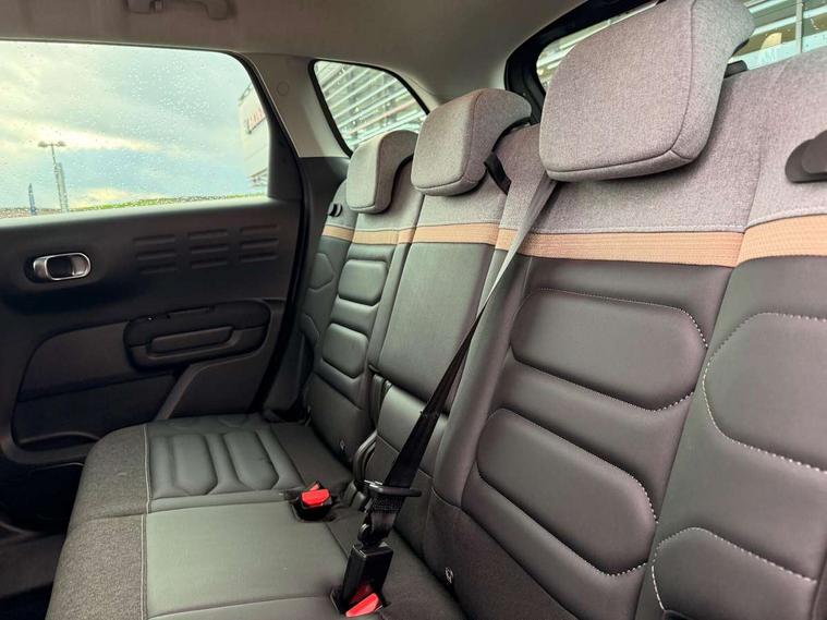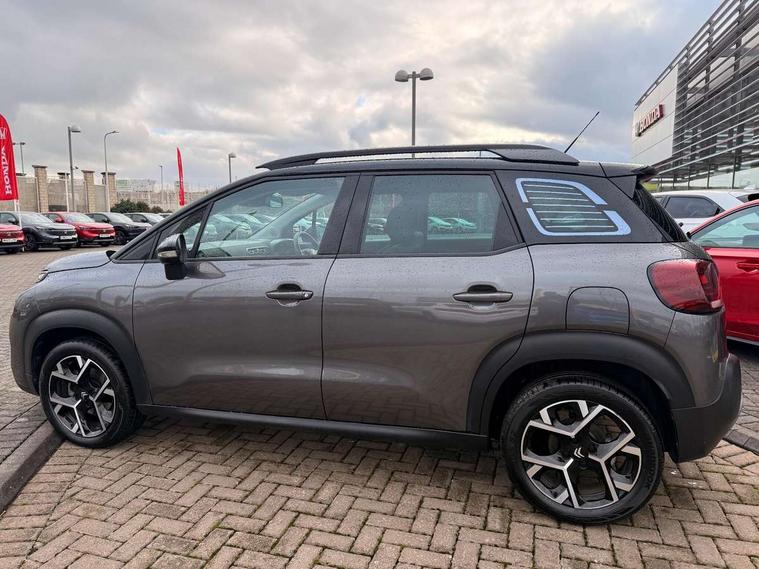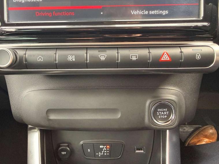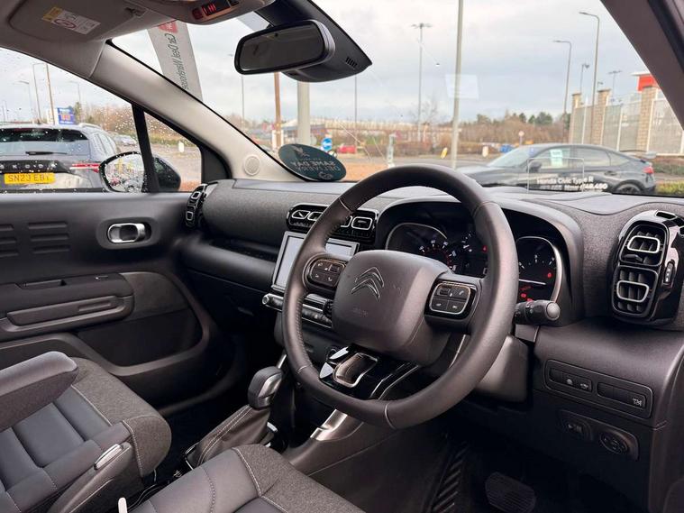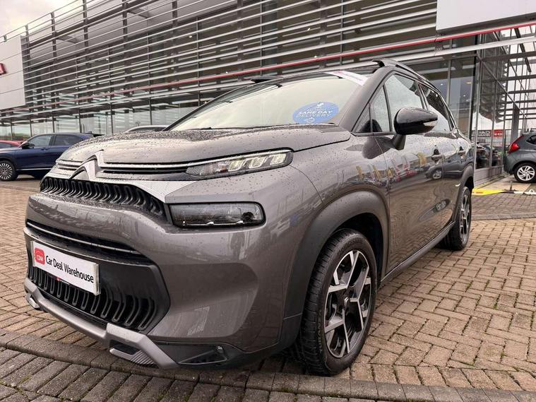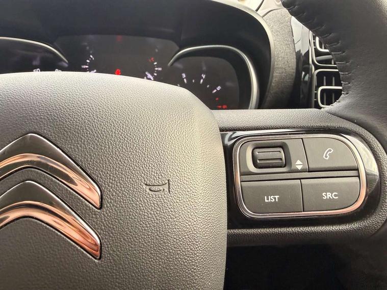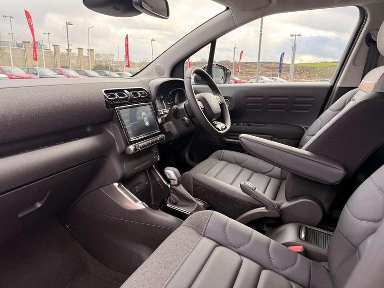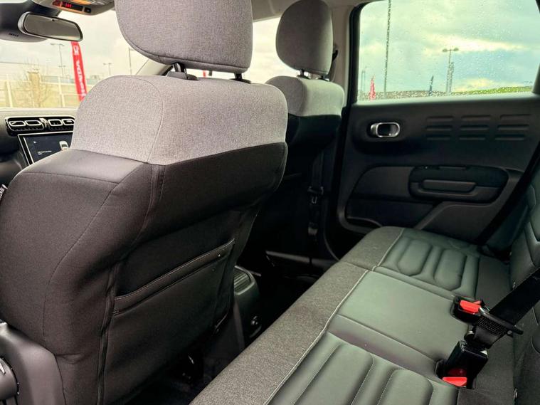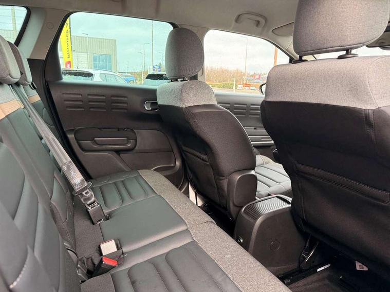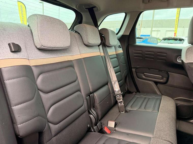 3.5" head up display, 9" Touchscreen display, Citroen connect box emergency and assistance system, Citroen Connect Nav with 3D navigation, Coffee Break Alert, Cruise control with speed limiter, Driver instrument cluster including trip computer and rev counter with white text LCD display and white needles and chrome decor, eCall emergency call system, Engine start button, Lane departure warning system, Mirror screen with Apple CarPlay and Android auto, Outside temperature sensor, Rear parking sensors, Tailgate, Top rear vision reversing camera, Traffic signs and speed limit recognition and recommendation, Variable assistance power steering, Voice recognition for radio, navigation and telephone features, Bluetooth hands free and media streaming with USB socket, Citroen connected DAB radio with 6 speakers, Steering wheel mounted controls for stereo and telephone, 3D effect LED rear lights, Automatic Eco LED headlights, Automatic lights and windscreen wipers, Black roof bars, Body colour painted door handles, Chrome chevrons front grille, Electric front windows + one touch + anti-pinch, Electric rear windows with one touch/anti-pinch, Electrically adjustable door mirrors, Electrically folding door mirrors, Electrochrome rear view mirror, Fog lights integrated into front bumper, Front and rear body coloured bumpers, Heated door mirrors, Integrated roof spoiler, LED daytime running lights, LED third brake light, Rear side wing doors, Rear wiper, Roof aerial, Tinted rear windows and rear quarterpanel glass, Variable front intermittent wipers, 12V socket in front, 12V socket in rear of vehicle, 60/40 split folding rear seats with sliding rear bench, centre armrest and ski flap, Automatic air conditioning, Boot light, Brasilia leather effect and flecked cloth upholstery with metropolitan graphite ambience, advanced comfort seats and wrapped dashboard, Central adjustable armrest on drivers seat, Centre console with closed storage and chrome insert, Driver and front passenger cup holders, Driver and passenger sunvisor with courtesy mirror, Flex load/Pull out boot floor, Front and rear courtesy reading lights, Front and rear door storage, Front head restraints, Front passengers seat flat folding, Glovebox with closable lid, Height adjustable driver's seat, Height and reach adjustable steering wheel, Leather steering wheel with satin chrome inserts and radio controls, Manual handbrake with chrome insert, Passenger compartment headlight adjustment, Rear isofix mounting points (outside seats) with top tether, Row 2 - Three seats with individually adjustable head rests, Satin chrome interior door handles, Single front passenger seat, Gloss black colour pack - C3 Aircross Max, 3 point, height adjustable, pre tensioned front seatbelts, ABS with Electronic brakeforce distribution and Emergency braking assistance, Active safety brake including Forward collision warning, Automatic illumination of hazard warning lights, Curtain airbags, Driver airbag, Drivers/passengers and rear seats unfastened seat belt warning, ESC (Electronic Stability Control), Front lateral airbags, Front passenger airbag, Front passenger airbag deactivation switch, Hill start assist function, Mono-tone horn, Rear door child safety locks, Three 3 point rear seatbelts, Tyre pressure monitor, Automatic door and boot locking when moving off with automatic unlocking in case of impact, Automatic locking of the vehicle (after 30 seconds if door or boot unopened), Immobiliser, Keyless entry and keyless start, Perimetric and volumetric anti theft alarm, Remote central locking + deadlocks, Vehicle locater function (headlights illuminate when button on key pressed), Gloss black centre console, Satin chrome air vent decors,