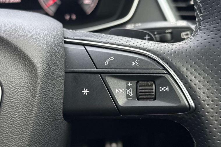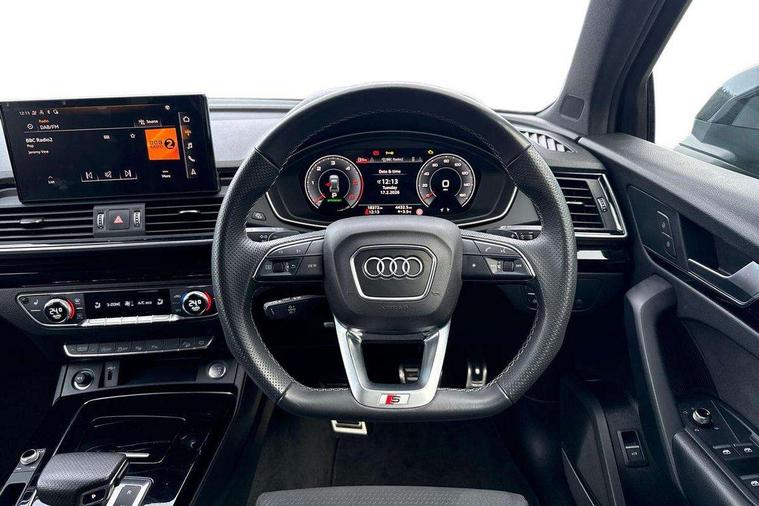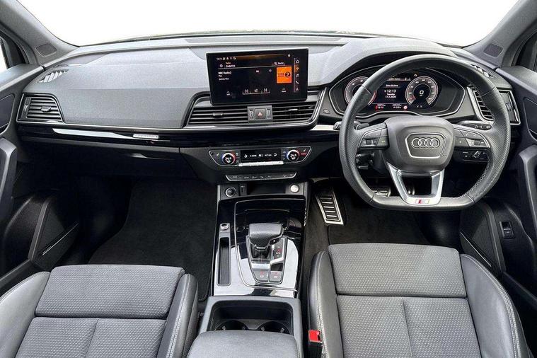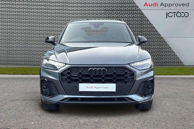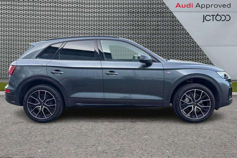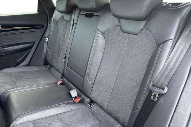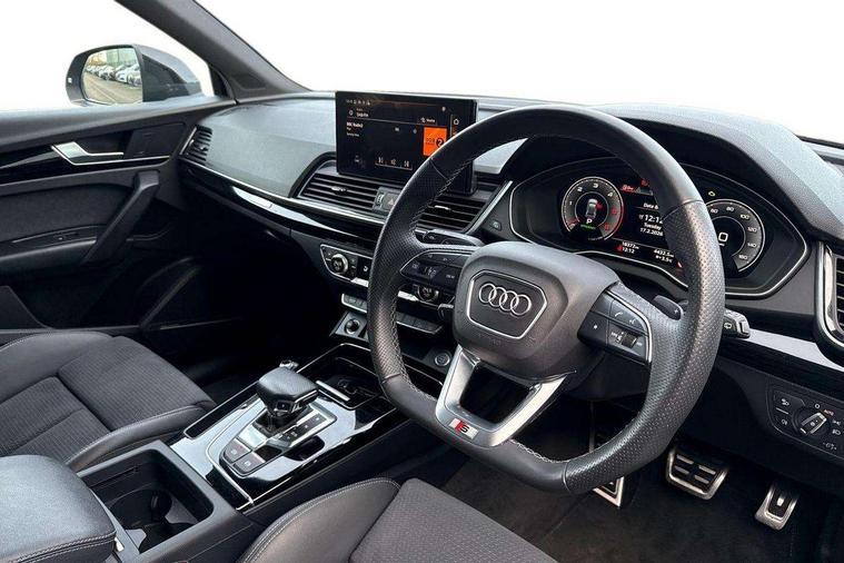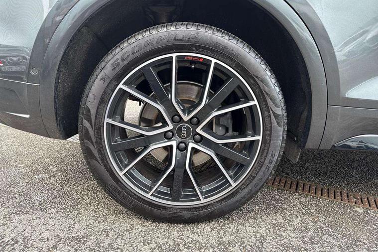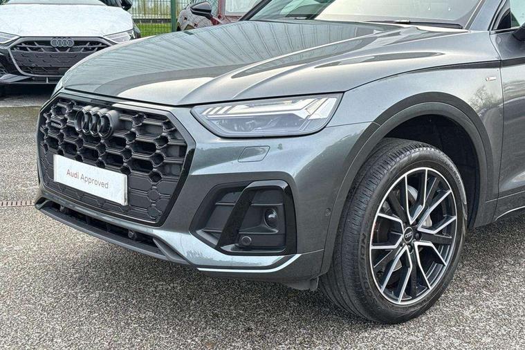 Acoustic front and rear parking sensor, Audi connect safety and service (e-call), Audi drive select, Audi virtual cockpit plus with 12.3" screen and three different layout designs, Audi wireless smartphone interface, Automatic start-stop system with coasting functionality and efficiency programme, Bluetooth interface, Camera based traffic sign recognition, Electro - mechanical power assisted steering, Lane departure warning, MMI navigation plus with 10.1" touch screen, Power tailgate, Reversing camera, Service interval indicator, Voice control system with Audi hotword activation "Hey Audi", Diesel particulate filter, Quattro on demand, S line sports suspension, 2 x USB charging port with aux input socket, 8 loudspeakers, DAB Digital radio, Acoustic windscreen, Auto dimming door mirrors, Auto dimming frameless rear view mirror, Automatic headlight adjustment, Automatic headlights and windscreen wipers, Black roof rails, Black styling with black rings, Body colour bumpers, Body colour rear diffuser with matt aluminium silver surrounds, Body colour underbody protection, Chrome plated exhaust trims, Daytime running lights, Door sills in Selenite silver, Electric adjustable/heated/folding door mirrors, Front air inlet surrounds in aluminium, Front and rear electric windows, Front radiator grille in honeycomb design, LED 3rd brake light, LED headlights and LED tail lights, Loading edge protection in stainless steel, Lower bumpers painted in contrast Manhattan grey, Rear chrome trim strip below lights, Rear privacy glass and rear side windows, Rear side wing doors, Rear wiper, Roof bars, S Line badges on the front wing panels, S Line front and rear bumpers, S Line rear spoiler, S Line side skirts, 3 rear headrests, Black cloth headlining, Comfort front centre armrest, Contrast stitching on seats, steering wheel and gear lever gaiter, Deluxe 3 zone electronic climate control, Front head restraints, Front sport seats with S embossed logo, Front/rear floor mats, Gear lever in black leather, Heated front seats, Height/reach adjustable steering column, Illuminated door sill trims with S logo, Luggage compartment cover, Manual seat adjustment with 4-way electric lumbar support, Single front passenger seat, Stainless steel pedals, Sunvisors with vanity mirrors, Top surface of the rear centre armrest in artificial leather, High gloss pack - Q5, LED interior light pack - Q5, 3 point seatbelts on all seats, 6 airbags - Driver, front passenger, curtain and side airbags, Attention and drowsiness assist, Electrically operated child locks on rear doors, Electromechanical parking brake, Electronic stabilisation control including ABS, ASR and EDL, First aid kit with warning triangle and vests, Front passenger airbag deactivation, Hill descent control, Hill hold assist, ISOFIX child seat mounting for front passenger seat and ISOFIX child seat mounting with Top Tether for outer rear seats, Multi collision brake assist, Pop-up bonnet for pedestrian protection, Pre sense city, Seatbelt monitoring, Tyre pressure warning, Anti theft alarm, Anti-theft wheel bolts, Remote central locking, Remote control key with SAFELOCK and keyless go, Air vents inserts and centre console in gloss black, Tool kit, Tyre repair kit,