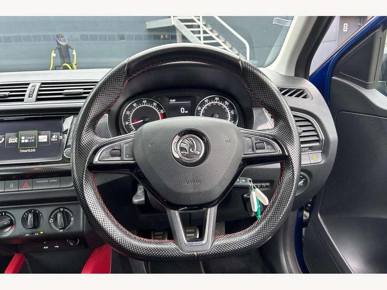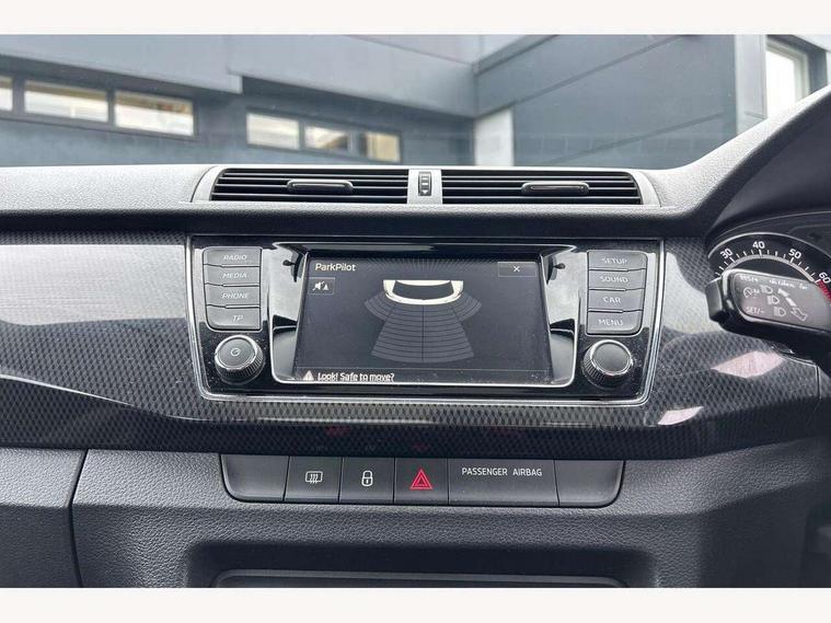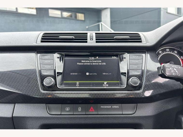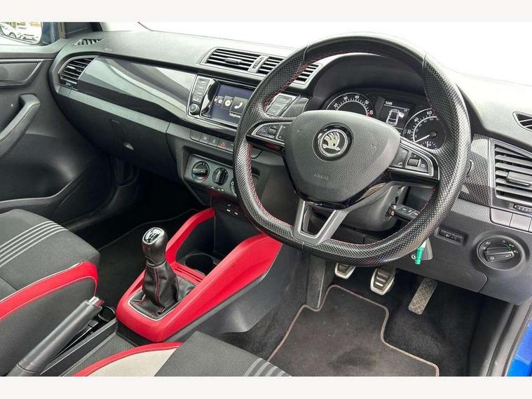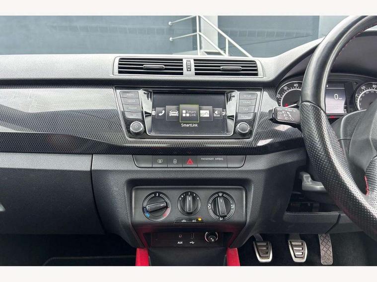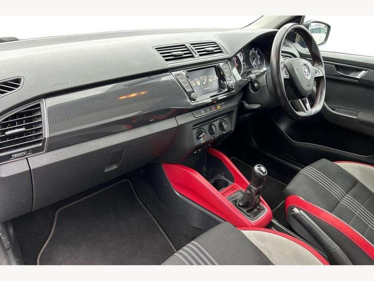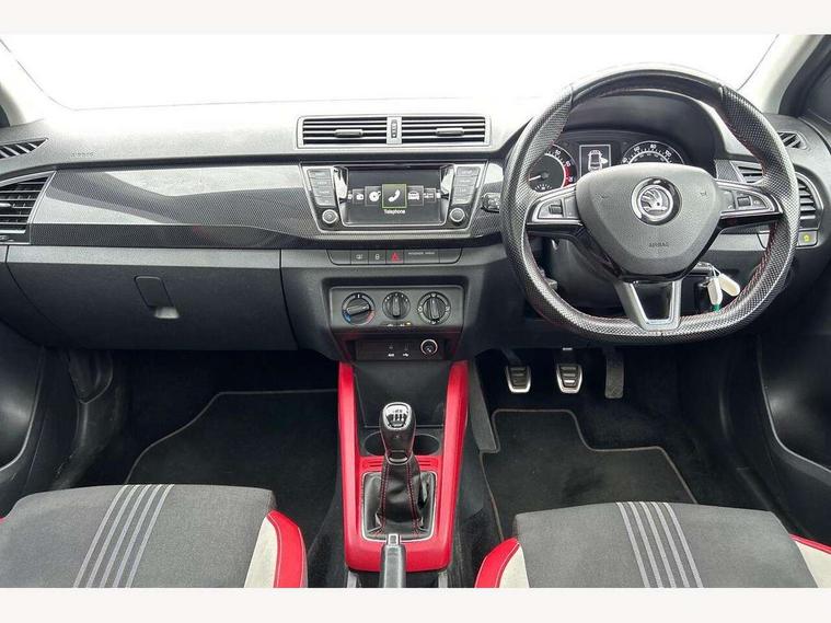 Bluetooth system, Exterior temperature gauge, Front assistant collision mitigation, Maxi dot trip computer, PAS, Service interval indicator, SmartLink, Auxiliary socket for external MP3 player, Bolero radio with telephone control, Mirror Link, USB and SD card, DAB Digital radio, Black door mirrors, Black radiator grille, Body colour bumpers, Body colour door handles, Body coloured rear spoiler, Electric front windows, Electrically adjustable and heated door mirrors, Heated rear window, Height adjustable headlamps, Illuminated door sill inserts, Intermittent rear wash/wipe, LED daytime running lights, Panoramic sunroof, Sunset glass from b-pillar back, Tinted rear windows, Tinted windscreen, 1.5L bottle holder in front door panels, 2 height adjustable rear headrests, 3 spoke leather multifunction sports steering wheel with red stitching, 60/40 split folding rear seat, Boot stowage box, Cargo area storage tray, Cloth upholstery, Driver + passenger vanity mirrors, Floor mats with red stitching, Folding grab handles, Front reading lights, Front sports seats, Height adjustable driver's seat, Height adjustable front headrests, Height adjustable passenger seat, Height/reach adjust steering wheel, Interior light with delay, Leather gearshift, Leather handbrake, Lower glovebox cover, Luggage load hooks, Parcel shelf, Pearl grey carpets, Pearl grey headlining, Pollen filter, Rear courtesy light, Rear storage trays, Storage compartment under front seats, Ticket holder, Two rear outer seat isofix location points, Arkamys surround sound pack - Fabia, Chrome Pack - Fabia, 3x3 point rear seatbelts, ABS, Curtain airbags, Driver and passenger airbags, Driver and passenger side airbags, EDS, ESC with ASR, Front seatbelt pretensioners, Hydraulic Brake Assist (HBA), Passenger airbag deactivate switch, Seatbelt warning, Tyre pressure monitor, Alarm with interior monitoring, Immobiliser, Locking wheel bolts, Remote central locking, Black cube decorative insert,