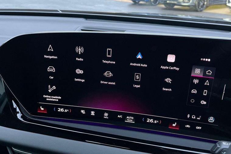 Adaptive cruise control, Attention and drowsiness detection with driver observation, Audi application store, Audi assistant, Audi connect emergency call and service, Audi drive select, Audi virtual cockpit plus with 11.9" OLED colour display, Automatic start/stop system with coasting functionality, Camera based traffic sign recognition, Convenience key, Intersection assist, Lane departure warning, MMI navigation plus with high resolution 14.5" OLED touchscreen colour display, Park assist plus, Parking system plus with 360 display, Progressive steering with servotronic, Rear view camera, Side assist and exit warning, rear cross-traffic assist and rear turn assist, Smartphone interface, Swerve assist and turn assist, Traffic sign based speed limiter, Comfort suspension, Audi sound system impressive sound with 8 loudspeakers including centre speaker and subwoofer, 6-channel amplifier with a total output of 180 watts, DAB digital radio reception, Smartphone compartment with wireless charging, Aluminium window trims, Auto dimming rear view mirror, Body colour door handles, Body colour door mirrors, Clear glass windows, Door mirrors - electrically adjustable, heated, folding and auto dimming on both sides, Front and rear electric windows, Front door sill trims with aluminium inlays, High beam assist, LED headlights Plus incl. digital daytime running lights, turning light, all-weather light, motorway light, manouevring light and intersection light, LED rear lights pro incl. dynamic rear indicators and illuminated light strip with animated coming and leaving home function, LED third brake light, Rear and side windows with heat insulating glass, Rear boot, Rear side wing doors, Sport bumpers, radiator grille and diffuser in scandium grey and diffuser insert in matt selenite silver, White rhombus logo projection light in exterior mirrors, Windscreen with acoustic glazing, 3 rear headrests, 3 seat rear bench, 3-zone automatic climate control, 40:20:40 split folding rear seat bench with centre armrest and cup holders, Comfort front centre armrest, Expedition cloth upholstery, Front and rear floor mats, Front seats with manual adjustment for position and 4-way electric lumbar support, Front sport seats with integrated head restraints, Heated front seats, i-Size child seat mounting on the front passenger side and outer rear seats, i-Size and top tether on the outer rear seats, Increased charging capacity for USB ports 2X100 Watts in rear, 2X60 Watts in front, Luggage compartment lid, electrically opening and closing, Manual steering column height and depth adjustment, Rock grey cloth headlining, Single front passenger seat, Twin spoke leather steering wheel with multi-function buttons with touch control, shift paddles and trim in chrome look, Interior lighting in white package pro - A5, 3x3 point rear seat belts, Driver airbag, Electric child safety locks, First aid kit with warning triangle and vests, Front emergency brake assist, Front passenger airbag, Front passenger airbag deactivation, Front side airbags with head airbag system and front interaction airbag, Hill hold assist, Seat belt monitoring with rear seat occupant reminder, Tyre pressure loss indicator, Anti theft alarm, Anti-theft wheel bolts, Digital key, Keyless Go, Accent surfaces and control buttons in matt black, Black dashboard with contrast stitching, Inlays in laser structure, black, Softwrap in impressum cloth, Tyre repair kit,
