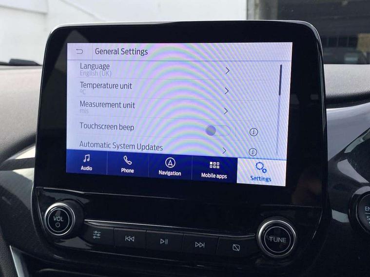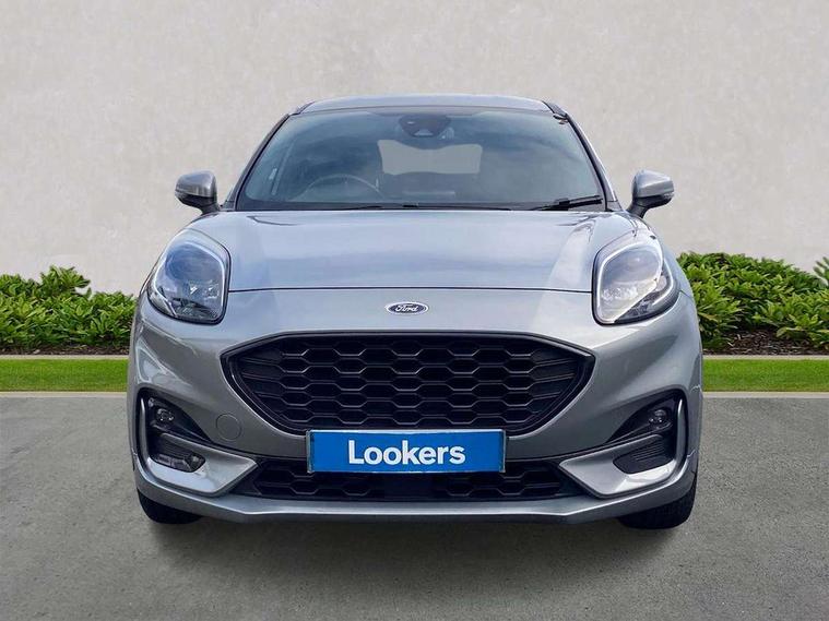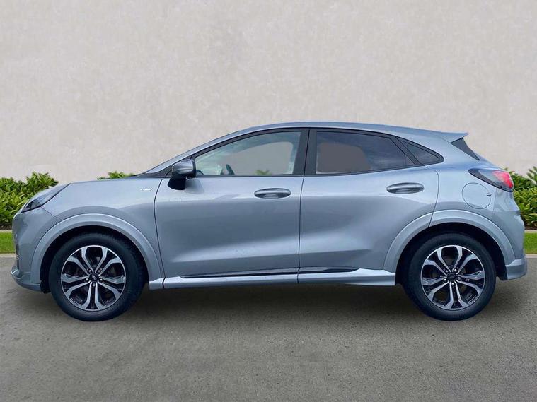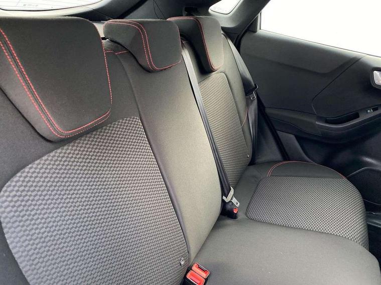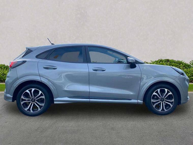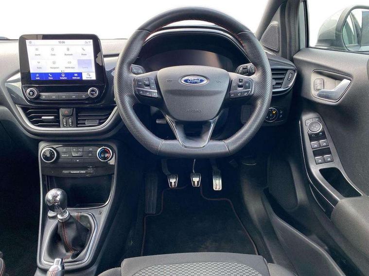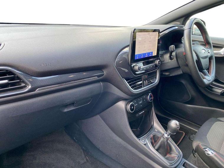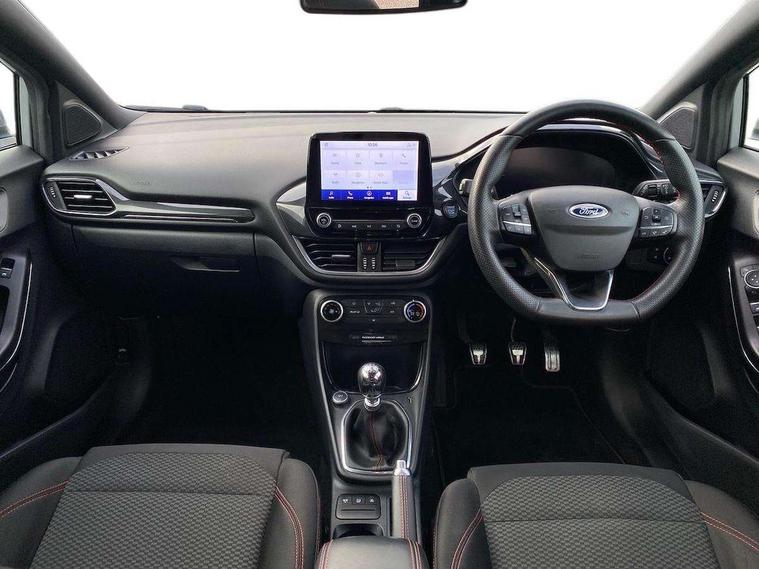 Ford easy fuel, Full digital 12.3" instrument cluster, Lane keeping aid with lane departure warning, Power assist steering, Rear parking sensor, Selectable drive modes(Normal, Eco, Sport, Slippery and Trail), Automatic headlights with rain sensing wipers and auto high beam, Body coloured door mirrors, Front fog lights with cornering lights and LED rear lamps, Power foldable heated door mirrors with puddle lamps, Quickclear heated windscreen, Rear wiper, ST-Line body kit with large rear spoiler wth sports suspension, Alloy sports pedals, Centre console with armrest and stowage, Cloth upholstery, Driver seat height/lumbar adjust, Ford megabox extended bootspace, Front and rear floor mats, Front and rear head restraints, Manual air conditioning, ST-Line flat bottomed sensico leather steering wheel with leather handbrake and aluminium gear knob, 3 rear seatbelts, Electronic stability control (ESC) and hill start assist, Pre-collision assist with autonomous emergency braking, pedestrian/cyclist detection & post-collision braking, Tyre pressure monitoring system (TPMS), Thatcham alarm,