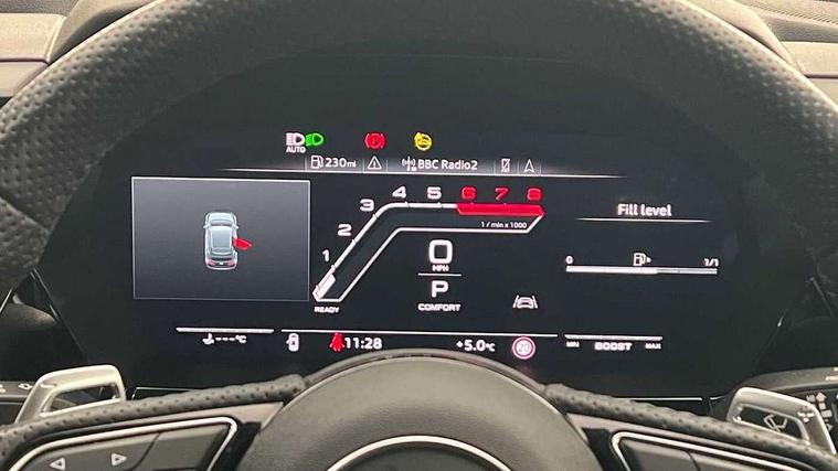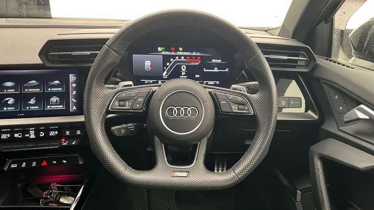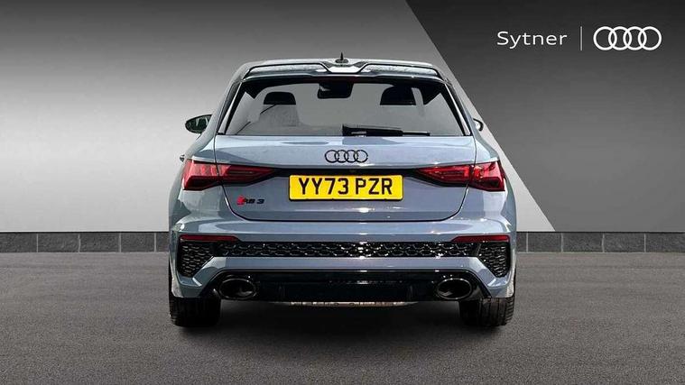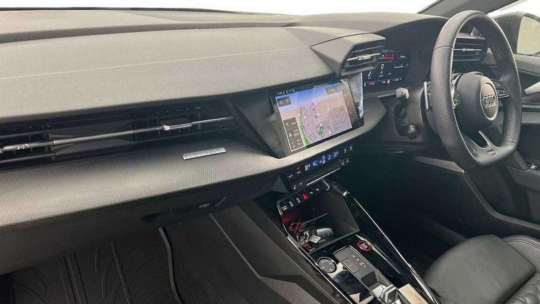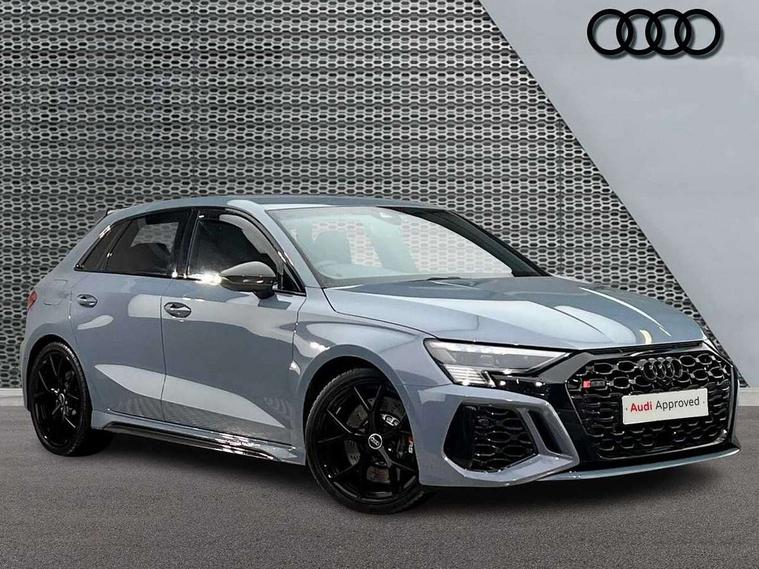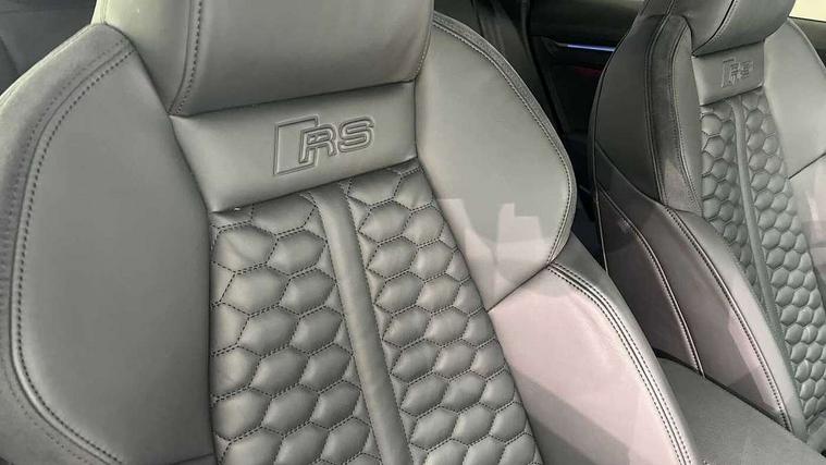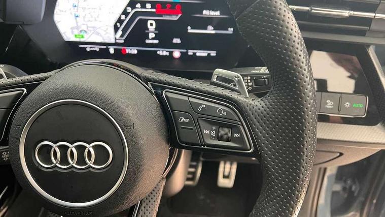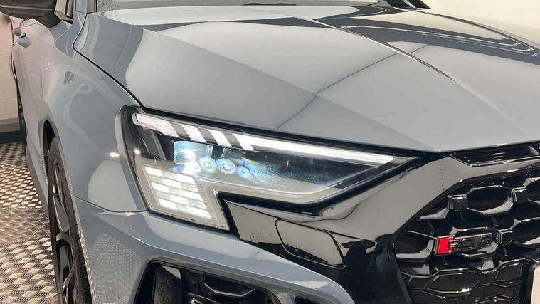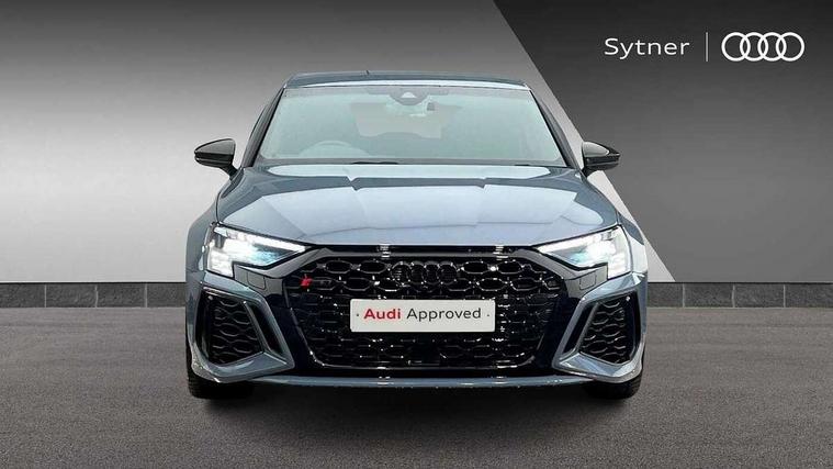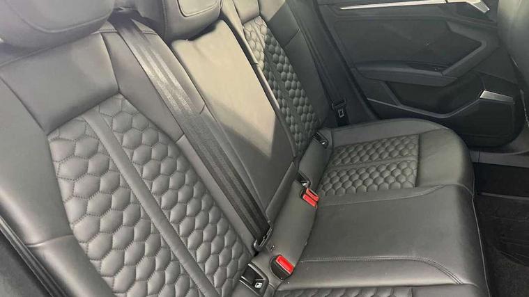 Audi smartphone interface, Audi virtual cockpit with RS specific display 12.3" full colour digital instrument cluster, Automatic start/stop system with recuperation, Bluetooth interface, Collision avoidance assistant, Emergency e-call, Lane departure warning system, Legal emergency call, Manual boot opening, Parking assist with parking system plus, Progressive power assisted steering, Quattro permanent four wheel drive, Rear suspension, DAB Digital radio, 3rd brake light, Acoustic glass windscreen, Audi beam uses LEDs to project the Audi sport logo onto the ground as you exit your RS 3, Audi matrix LED headlights, LED rear lights, dynamic front and rear indicators and headlight cleaning system, Auto dimming rear view mirror, Body colour roof, Carbon exterior door mirror, Carbon fibre engine cover, Carbon roof spoiler, Daytime running lights, Door mirrors - electrically adjustable, heated, folding and auto dimming on both sides, Headlight washers, Light and rain sensors, Privacy glass - dark tinted rear and rear side windows from B-pillar backwards, Rear side wing doors, Rear window wiper and washer system, RS exterior features in gloss black, RS sports exhaust system, Side skirt in carbon inlay, 3 seat bench in 2nd row, 40/20/40 split folding rear seat bench, Black cloth headlining, Dual zone electronic climate control, Front and rear headrests, Front centre armrest, Front sports seats RS embossed logo, Front/rear floor mats, Heated front seats, Honeycomb stitching and RS embossing, Illuminated door sill trims inlays in aluminium with RS 3 logo, Illuminated vanity mirror, Manually adjustable front seats, RS emblems, Single front passenger seat, Stainless steel pedals and front footrest in black, Tool kit, Aluminium interior elements pack - RS3, Ambient lighting pack - RS3, MMI navigation plus with MMI touch - RS3, RS bodystyling - RS3, Storage Pack - RS3, 3x3 point rear seat belts, ABS/EBD, ASR, Audi pre sense front, Driver/Front Passenger airbags, EDL, ESC - Electronic Stability Control + traction control, Front passenger airbag deactivation, Front side airbags with head airbags and interaction airbag, Hill hold assist, Seat belt reminder with passenger presence detection in rear, Tyre pressure loss indicator, Warning triangle and first aid kit, Anti theft alarm, Anti-theft wheel bolts, Electronically operated child lock, Remote control central locking, Carbon inlays, accent surfaces in the dashboard and centre console in platinum grey silk effect paint finish, Full decorative carbon trim, 19" 5 Y spoke matt black alloy wheels, Tyre repair kit,