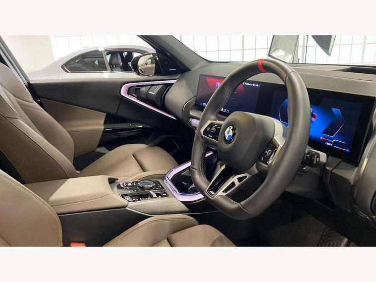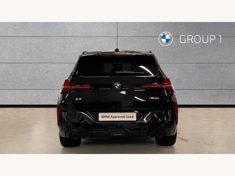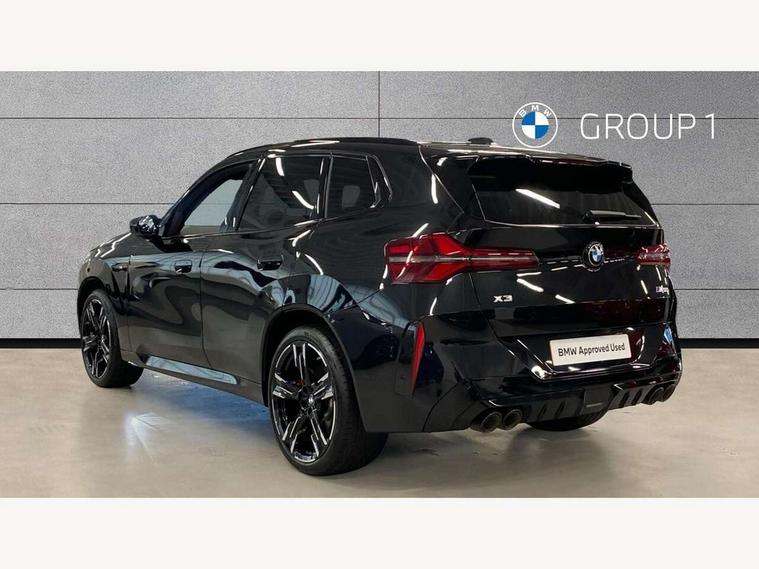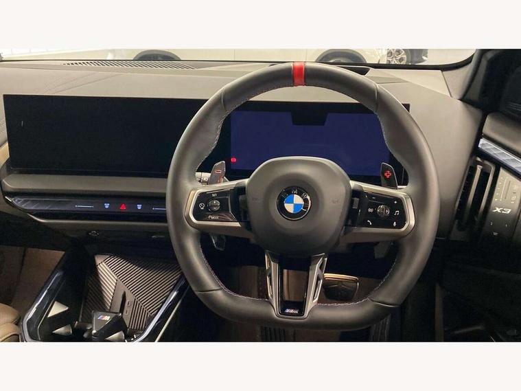 Active guard professional, Attentiveness assist, Automatic operation of tailgate, BMW ConnectedDrive online services, BMW iDrive, BMW Online services, BMW Teleservices, Brake pad wear indicator, Condition based service, Cruise control with brake function + speed limiter, Drive off assistant, Driving Assistant Plus Preparation, Flat tyre monitor, Language version English, My Mode - Personal, Efficient, Sport, Relax, Expressive, Reversing assist camera, Servotronic system, Variable sport steering, Dynamic stability control, Multiple control arm rear axle, Steptronic transmission with gearshift paddles, Two-joint strut-type front axle with tension strut, DAB tuner, Personal eSim, 4 tailpipe tips, Adaptive LED Headlights, B-pillar trim panel in black high-gloss, BMW badge on front and rear, BMW M-specific front/rear bumpers and side sills, BMW M-specific radiator grille with horizontal bars in Dark Silver and M logo, Daytime running lights, Door handles flush to the surface with lock barrel on driver's side is illuminated and in vehicle colour, Dynamic brake lights, Electric adjustable and heated door mirrors, Electric window trap release and convenient opening/closing feature, Headlight beam throw control, Heated rear window, Heated windscreen washer jets, High beam assistant, LED 3rd brake light, LED rear lights, LED tail lights, Locking of the doors, M-specific Exterior mirrors, Mirror base and mirror blade in black high-gloss, Mirror triangle in black high-gloss, Rain sensor with automatic headlight activation, Rear side wing doors, Rear wiper, Reversing light, Side window frame in black high-gloss, Sun protection glass, Windscreen wipers, 12v power socket in front centre console and luggage compartment, 2 x USB Type C ports for charging and data transmission (front centre console) and 2 x USB Type C ports for charging (rear centre console), 3 rear headrests, 3 seat bench in 2nd row, 3 zone automatic air conditioning, 40:20:40 split folding rear seat with loading system, Ambient lighting, Anthracite headlining, Electric adjustable seats with memory function, Floor mats in velour, Footrest and pedals in black plastic, Four grab handles integrated in roof lining, Front armrest with integrated control panel, Front centre console trim in black high-gloss, Front head restraints, Front passenger seat, Front sports seats, Glove compartment, i-Size / ISOFIX attachment points on both outer rear seats, with covers in black, Luggage compartment separating net, M sport leather steering wheel, Multifunction steering wheel, Rear side armrests integrated into door trim, Selector lever with toggle operation, Steering column adjustment, Sun visors with illuminated vanity mirrors, Three upper retaining strap clips integrated into the rear panels of the seat backrests, Through loading system, Two front cupholders and two in the rear center armrest, Wireless charging tray, BMW Iconic Glow exterior package - X3, Connected pro package - X3, Interior and exterior mirror package - X3, M Sport pro pack - X3, 3 point seatbelts, Airbag deployment is controlled with respect to the intensity and scope, Anti-lock braking system (ABS), Automatic hold function, BMW emergency call, Brake assist, Brake drying, Brake energy regeneration, Braking readiness, Central airbag, Child locks on rear doors, Cornering brake control (CBC), Crash Sensor - activation of central locking release, hazard warning light and interior lighting, Driver and front passenger front and side airbags, Dynamic brake control, Electromechanical parking brake, Front and rear disc brakes, Head airbags, Integrated braking system, M sport seatbelt, Post Crash Collision Warning with braking function, Trailer stability control, Tyre pressure sensor, Warning triangle, Alarm system, Closing system with central locking, Comfort access system, Locking wheel bolts, Start/stop button with keyless motor start with acoustic drive, Tyre repair kit,