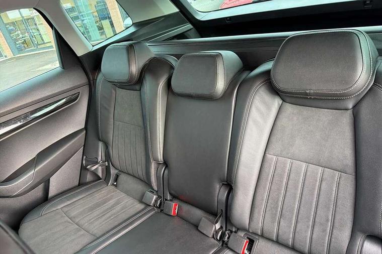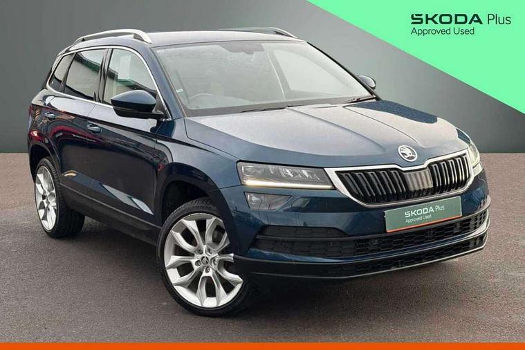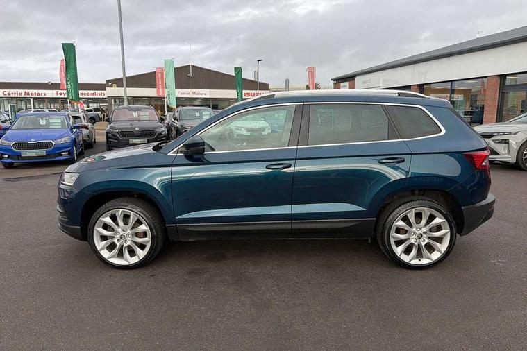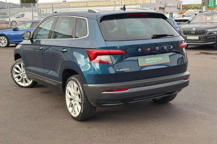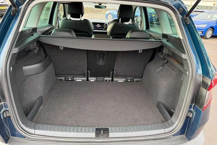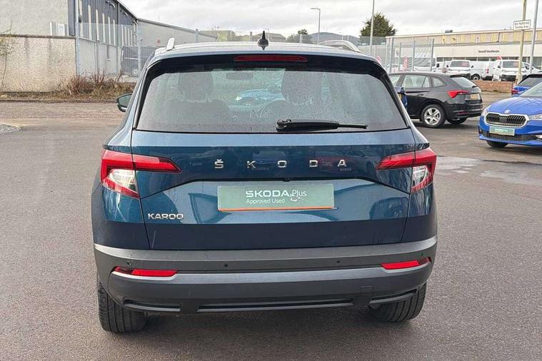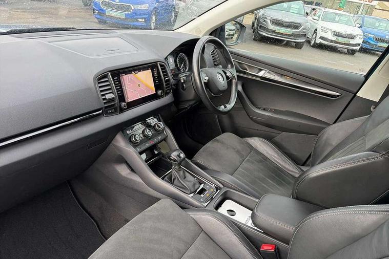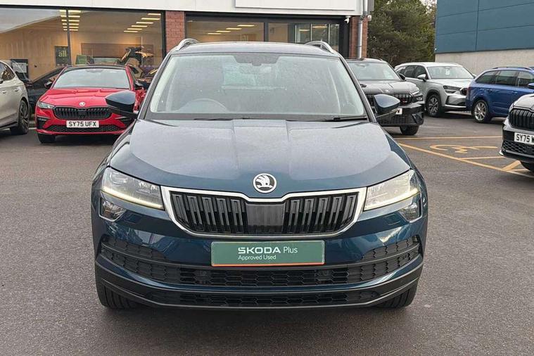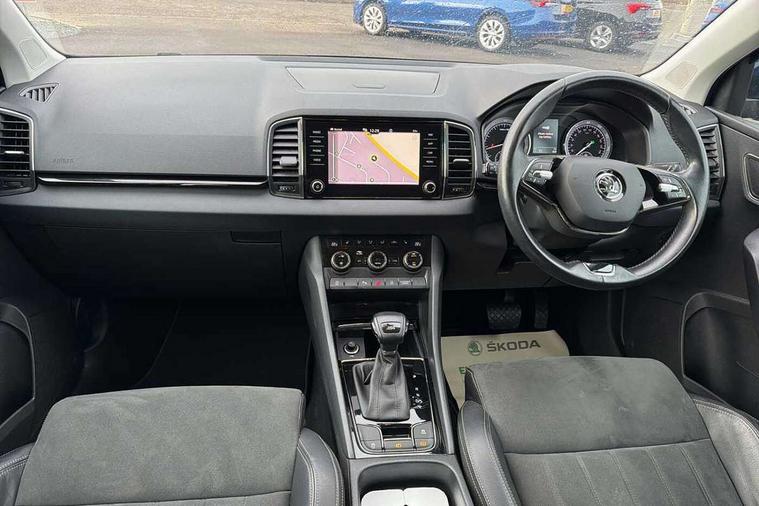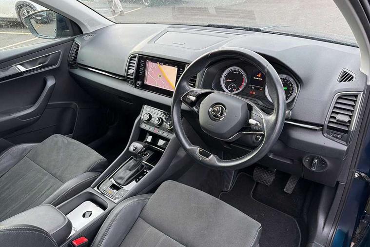 Care connect, Drive mode selector, Driver alert system, Driver fatigue sensor, Driver profile selection, Multifunction colour trip computer, Outside temperature gauge, Rear view camera, Service interval indicator, SmartLink + wireless for Apple and wired for Android, Start/stop system with regenerative braking, USB C Port x 2 in front centre console, DAB radio with Bluetooth, SD card slot, USB connection, Acoustic glass, Aero front windscreen wipers with intermittent function, Automatic headlight control system, Black electric window control buttons, Body colour door mirrors and handles, Body coloured bumpers, Electric front and rear windows with child proof lock, Full LED headlights + adaptive front light system + LED daytime running lights and front cornering fog lights, Headlight washers, Heated rear windscreen, LED rear lights with high functionality, Light assistant (coming/leaving home/tunnel light), Privacy glass, Safety reflectors on front doors, Third brake light, 1.5 litre bottle holders in driver and front passenger door panels, 12V socket in boot, 12v socket in front centre armrest with storage compartment and rear air vents, 2 Folding hooks and nets in boot, 2 Front readings lights for driver and passenger, 3 rear height adjustable headrests, 4 foldable roof handles with rear coat hooks, 4 lashing points on luggage floor, Backrest release, Cargo elements in boot, Chrome inner door handles, Folding tables on the front seat backrests, Front head restraints, Front seat and rear pockets, Height adjustable front three point seats belts with tensioners, Height adjustable passenger seat, Height/reach adjust steering wheel, Ice scraper, Illuminated and cooled glovebox, Illuminated luggage compartment, Isofix child seat preparation outer rear, Net programme in boot, Pen holder, Pollen filter, Rear boot cover, Rear reading lights, Rear seats fixed folding and divided 60:40, Retractable parcel shelf attachable to tailgate, Safety vest holder, Storage box in upper central dashboard closed, Storage compartment below the passenger seat, Sunvisors with illuminated vanity mirrors, Textile floor mats, Umbrella under passenger seat, VarioFlex seats with retractable parcel shelf, Chrome roof rails + chrome pack - Karoq, Airbags - Front side, head, knee and curtain, Automatic door unlocking in case of crash, Automatic fuel cut off in case of crash, Driver airbag, Electronic parking brake with auto hold function, Emergency rear braking signal, ESC including ABS, MSR, ASR, EDS, HBA, DSR, RBS, MKB and traction control, Front assist radar scanning of the space in front of the car with automatic braking, Hill hold control, Passenger airbag with switch-off function, Pedestrian monitor, Seatbelt reminder signalisation and pretensioner for all seats, Three point seatbelts rear, Two tone horn, Tyre pressure display, Tyre pressure monitor, Alarm with interior monitoring, back up horn and tilt sensor with safe function, Electronic engine immobiliser, Keyless entry and keyless start with safe system, Remote central locking with 2 remote folding keys, Chrome framed air vents, 19" Crater alloy wheels with anti theft wheel bolts, Storage on wheel cover,