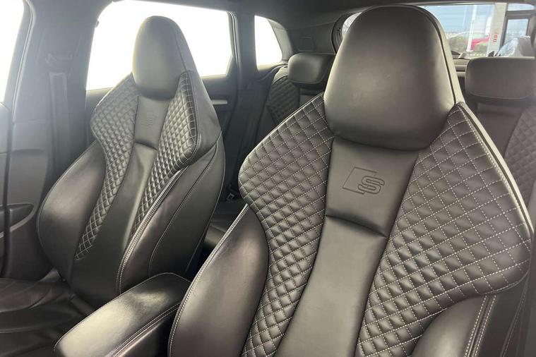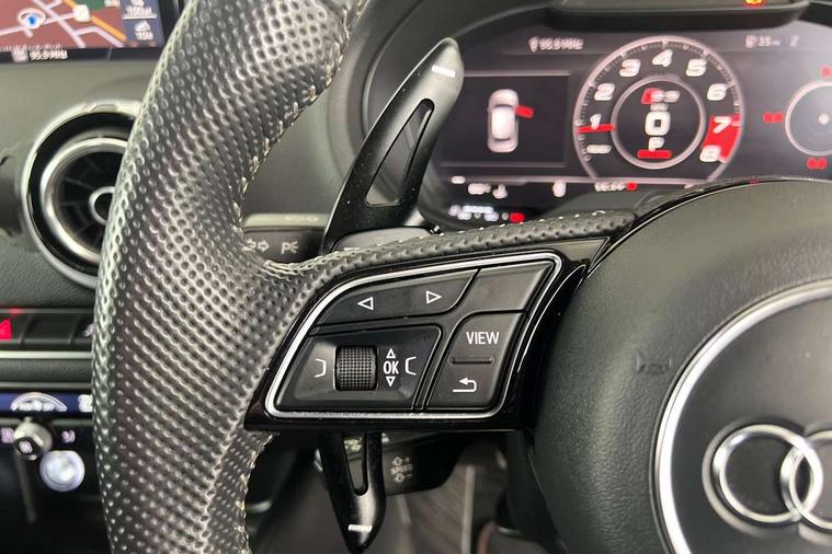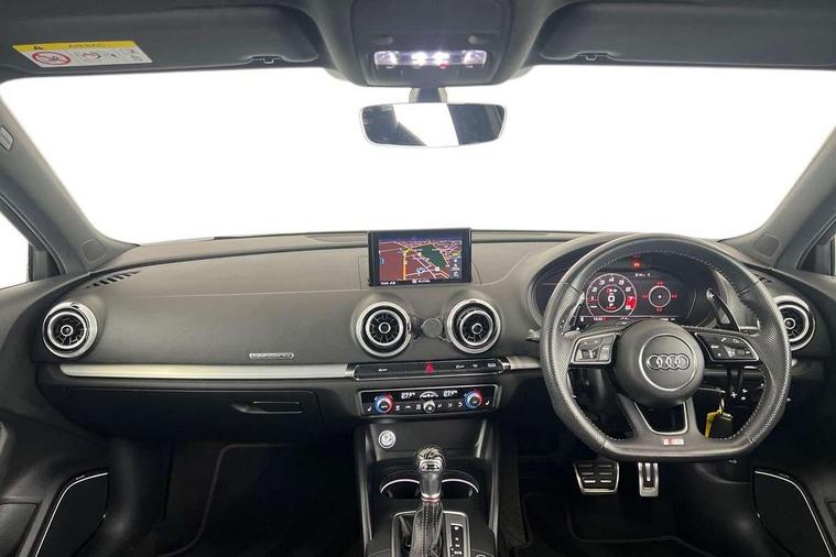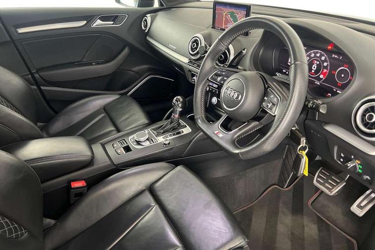 Audi drive select, Audi smartphone interface, Automatic start/stop system, Colour driver's information system display, Instrument dials with S3 logo, Mobile telephone preparation - bluetooth interface, Progressive power assisted steering, SD card based MMI navigation, Service interval indicator, Speed limit display, Voice control system, Voice recognition for navigation system, S sports suspension, 2 USB interfaces and Aux-In jack, Audi music interface, Bang and Olufsen sound system, CD player, DAB Digital radio, MMI radio plus with 7" colour MMI screen and MMI controller, Online entertainment, Audi Beam uses LEDs to project the Audi Sport logo, Auto dimming interior rear view mirror, Body colour roof spoiler with aerodynamic inserts in high gloss black, Electric front windows, Electric rear windows, Electrically adjustable and heated door mirrors with integrated LED side indicators, Headlight washers, Heated windscreen washer jets, LED daytime running lights, Light and rain sensors, Privacy glass - dark tinted rear and rear side windows from B-pillar backwards, Rear wiper, Sport specific side air inlet grille and diffuser insert, Twin oval chrome trimmed exhaust tailpipes, 3 adjustable rear headrests, 3 spoke leather multifunction sports steering wheel with paddle shift gear change controls, 60/40 split folding rear seat, Adjustable front centre armrest, Black cloth headlining, Dual zone electronic climate control, Front and rear interior lights with delay, Front/rear floor mats, Heated front seats, Height and reach adjustable steering wheel, Illuminated door sill trims with S logo, Isofix child seat preparation for front passenger/outer rear seats inc passenger airbag deactivation including top tether, Lashing point in luggage compartment, Manual height adjustable front seats, Stainless steel pedals, Storage compartments in doors side trims, centre console and under front drivers seat, Black styling pack - A3/S3, LED interior light pack - A3/RS3, Non smoking pack - A3, Storage and luggage pack - A3/RS3, 3 point seatbelts on all seats, ABS/EBD, Active bonnet, Active front headrests, Airbags - front driver/passenger, front & rear side, curtain, drivers knee, ASR, EDL, Electromechanical parking brake, ESC - Electronic Stability Control + traction control, Front passenger airbag deactivation, Hill hold assist, Manual rear child locks, Multi-Collision braking, Seatbelt warning, Tyre pressure warning, Warning triangle and first aid kit, Anti theft alarm, Anti-theft wheel bolts, Remote control central locking, Thatcham category 1 alarm + immobiliser, Aluminium air vent surrounds, Aluminium trim elements, Matt brushed aluminium inlays, Tool kit, Tyre repair kit,