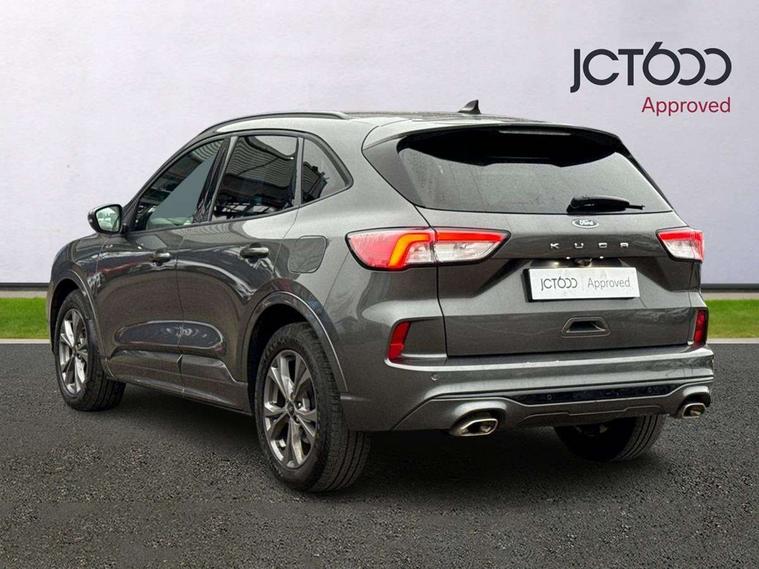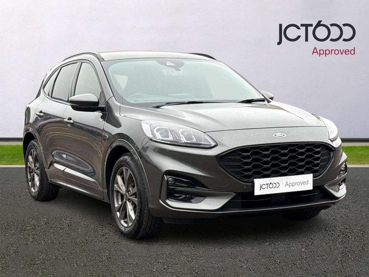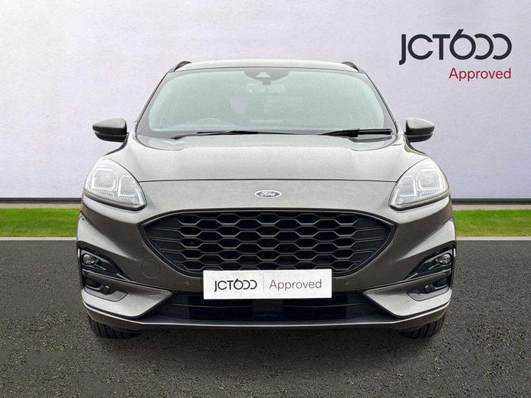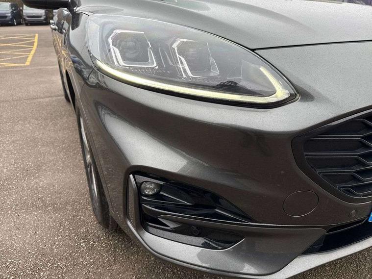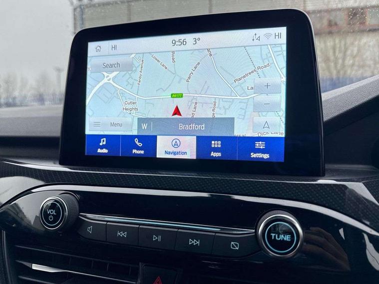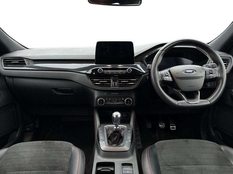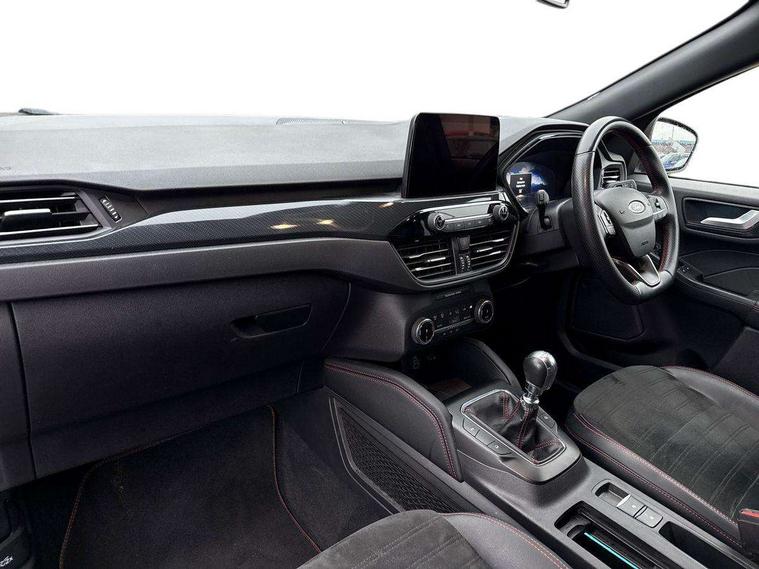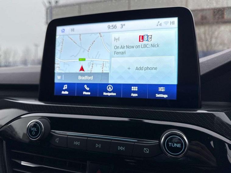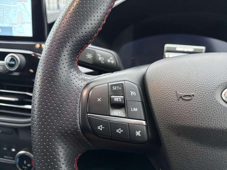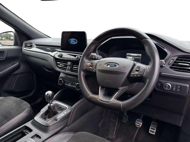 12.3" digital colour instrument cluster, Ford easy fuel, Ford SYNC 3 with 8" TFT LCD touchscreen, App Link, andriod auto/apple carPlay, emergency assistance and navigation with Ford pass connect, Front and rear parking sensors, Hands free power tailgate, Lane keeping aid with lane departure warning, Power assist steering, Rear view camera, Selectable drive modes, Service interval indicator, Sports suspension, Twist beam rear suspension, B&O premium audio system with 10 speakers and subwoofer, 2 USB ports, DAB radio/CD, Auto headlamps with high and low beam, Black roof rails, Body colour bumpers, Day/night rear view mirror, Front LED fog lamps, Large rear roof spoiler, LED daytime running lights, LED rear lights, Power folding, electrically adjustable and heated door mirrors with puddle lights, Power front/rear windows with global close, Quickclear heated windscreen, Rain sensing wipers, Rear privacy glass, Rear side wing doors, Rear wiper, ST Line body styling kit with unique front and rear fascia and bumper, rear painted diffuser, front painted skid plates, dark mesh upper grille, ST Line front scuff plates, Third brake light, Twin exhausts, 2nd row sliding seats with 60:40 split, Alloy pedals, Centre console with electronic parking brake, Dark headlining and pillars, Electronic automatic temperature control (EATC), Flat bottomed leather steering wheel in sensico with red stitching, Front and rear head restraints, Partial premium touch Sensico with black cloth inserts and red stitching, Rear centre head restraint, Single front passenger seat, Sports seats, ST Line front and rear floor mats, ST Line gear knob, 3x3 point rear seatbelts, Airbags - front driver/passenger, front and rear curtain, Drivers knee airbag, Electronic stability control (ESC) and ABS, Ford MyKey Gen 2 safety system, Manual child proof rear door locks, Post collision braking, Pre collision assist with autonomous emergency braking, Rear seat Occupancy alert, Red brake calipers, Tyre pressure monitoring system, Engine immobiliser, Keyless entry and Ford power start button (Keyless start), Locking wheel nuts, Remote powered central double locking doors, Thatcham category 1 alarm,