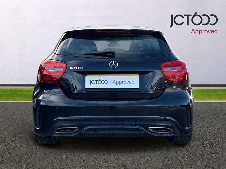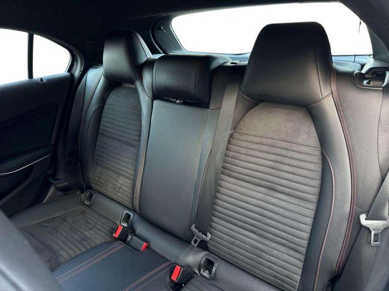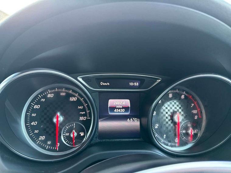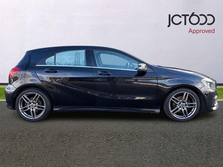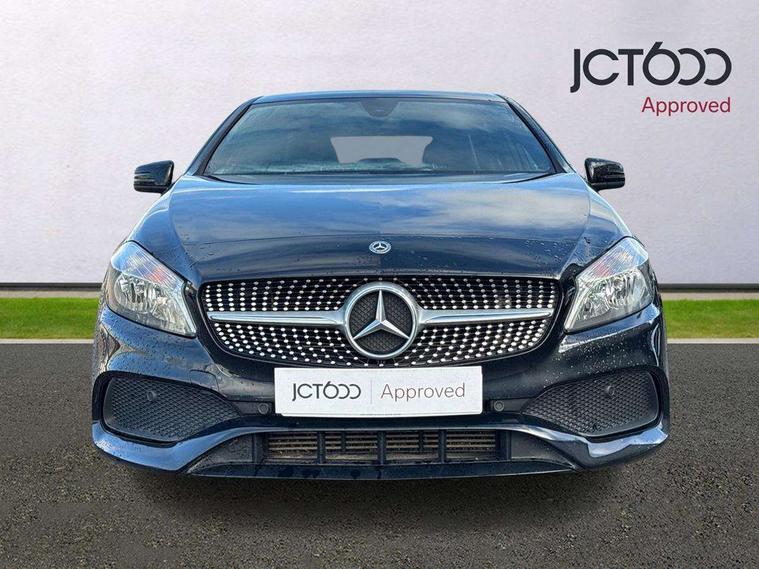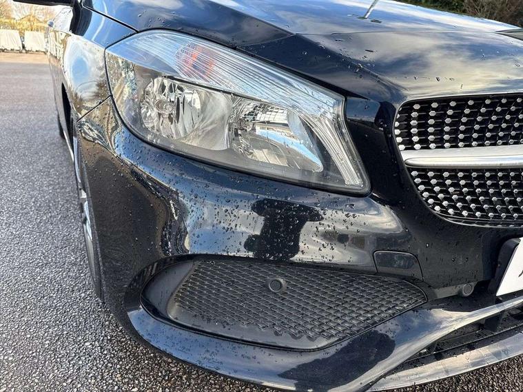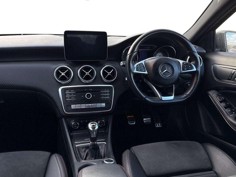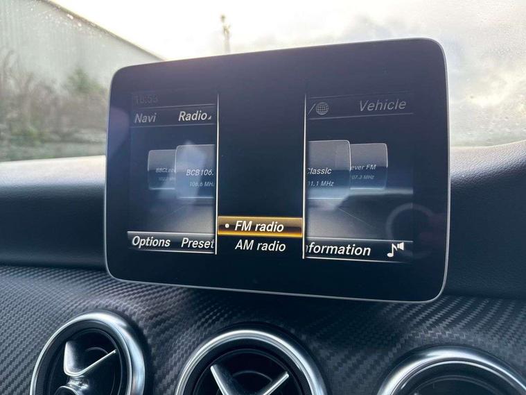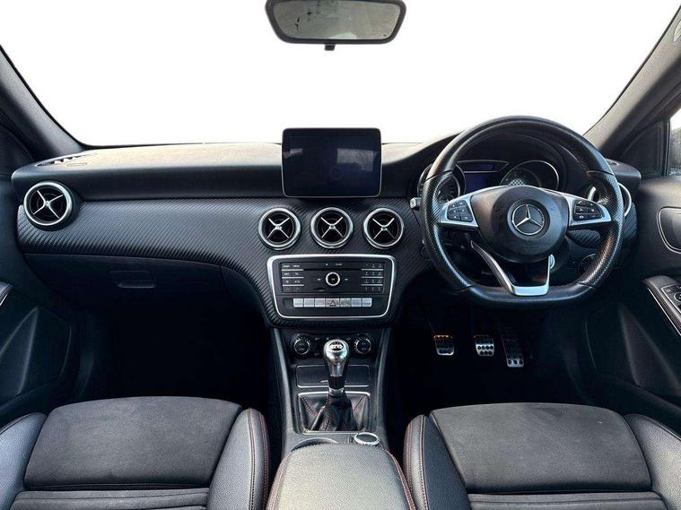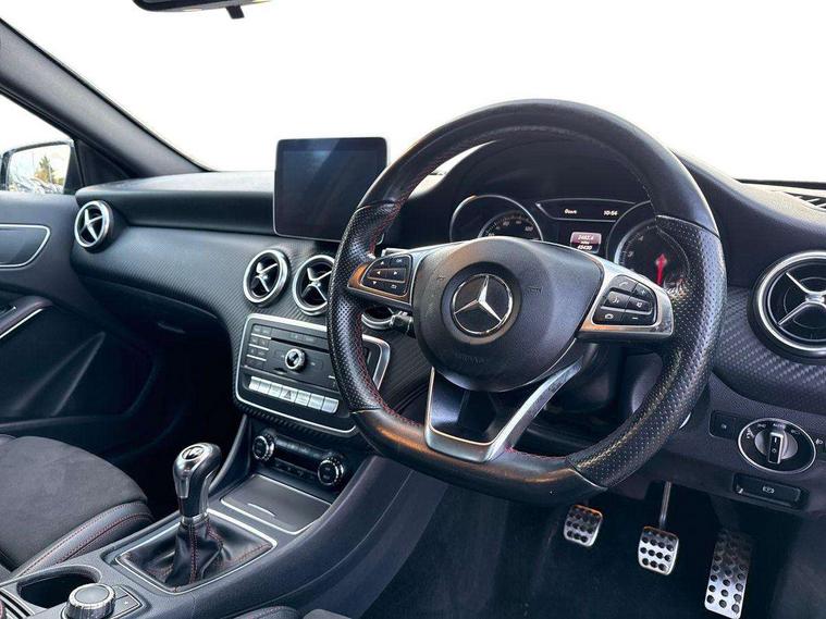 8" colour display screen, Attention assist, Bluetooth interface for hands free telephone, Bulb failure indicator, Collision prevention assist plus, DYNAMIC SELECT with a choice of driving modes (ECO, Comfort, Sport, Sport+ and Individual), External temperature gauge, Low fluid warning light, Reversing camera, Service indicator (ASSYST PLUS), Smartphone integration with Apple CarPlay, Speed dependent sports steering system, Speedtronic cruise control, Trip computer, Lowered suspension, Media interface, Mercedes Audio 20 radio/single CD + telephone keypad, USB port, Adaptive brake lights, AMG body styling, Body colour bumpers, Body colour door handles, Body colour side skirt, Daytime running lights, Diamond radiator grille with chrome pins and silver louvre + chrome insert, Electric adjustable heated door mirrors, Electric front windows, Electric rear windows, Headlamp assist, Heated rear window with timer, LED tail lights, Rain sensor windscreen wipers, Rear wiper, Twin Trapezoidal tailpipes, 1/3 to 2/3 split folding rear seats, 12V socket, 3 Spoke sports multifunction flat bottomed leather steering wheel, Ambient lighting, AMG floor mats with red stitching, Artico man-made leather/Dinamica upholstery, Auto Mercedes-Benz child seat recognition sensor, Black headlining, Brushed stainless steel sports pedals, Dual zone automatic climate control, Footwell lights, Front and rear reading lights, Front centre armrest with storage compartment, Front head restraints, Front sport seats, Height adjustable front seats, Height/reach adjustable steering column, Illuminated door sills, Illuminated glovebox, Illuminated storage compartment, Isofix rear child seat preparation, Leather gearshift, Load securing rings in luggage compartment, Luggage compartment cover, Rear head restraints, Storage compartment under load area floor, Sunvisors with illuminated vanity mirrors, Twin front cupholders, Seat comfort pack - A Class, 3 rear 3 point seatbelts, ABS with Brake Assist, Active bonnet, Adaptive brake system, Brake calipers with Mercedes-Benz lettering + perforated brake discs, Child proof door locks, Crash responsive emergency lighting, Drivers knee airbag, Dual stage driver/passenger airbags, Electronic parking brake, ESP with ASR, Front and rear seatbelt reminder, Front head airbags, Front passenger seat occupancy sensor, Front side airbags, Hill start assist, Tyre pressure monitoring system, Warning triangle and first aid kit, Window airbags, Alarm system/interior protection/immobiliser, Remote central locking, Carbon effect trim, Chrome air vent surrounds, Tirefit sealant with electric air pump,