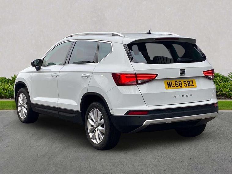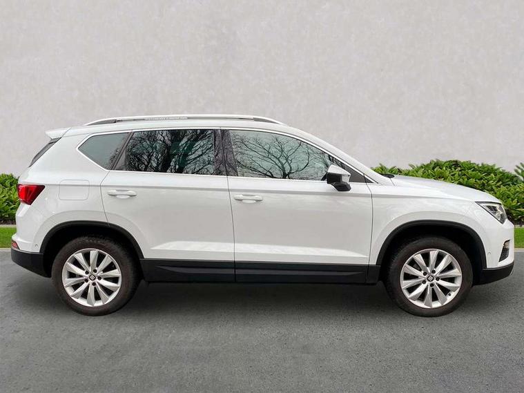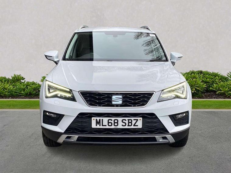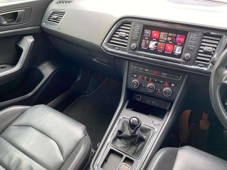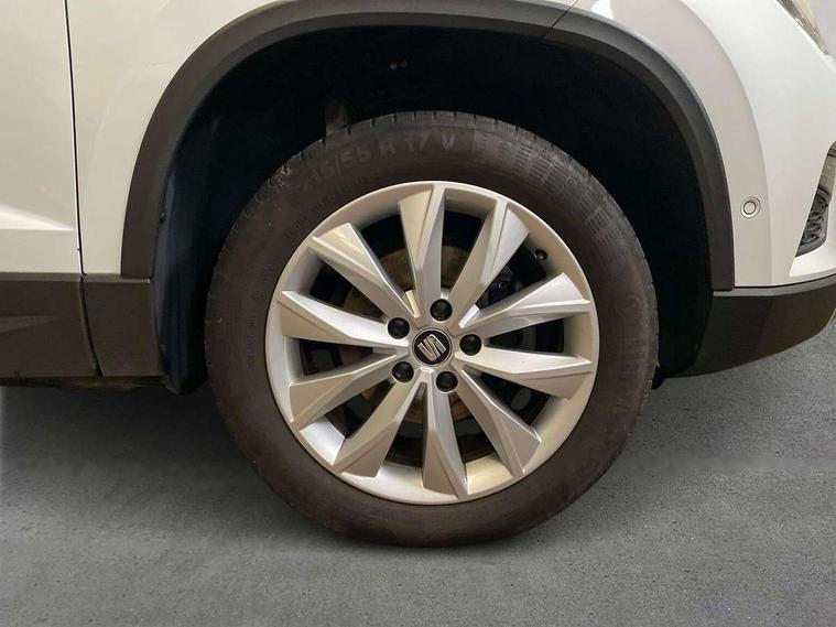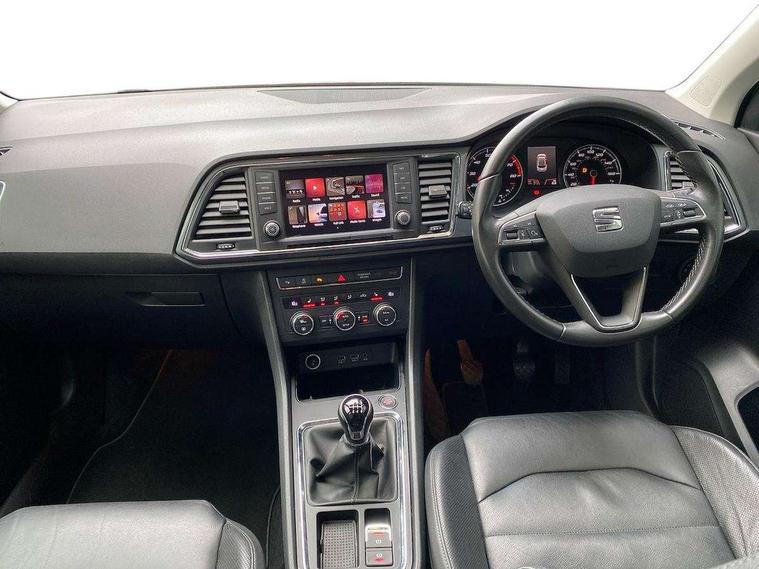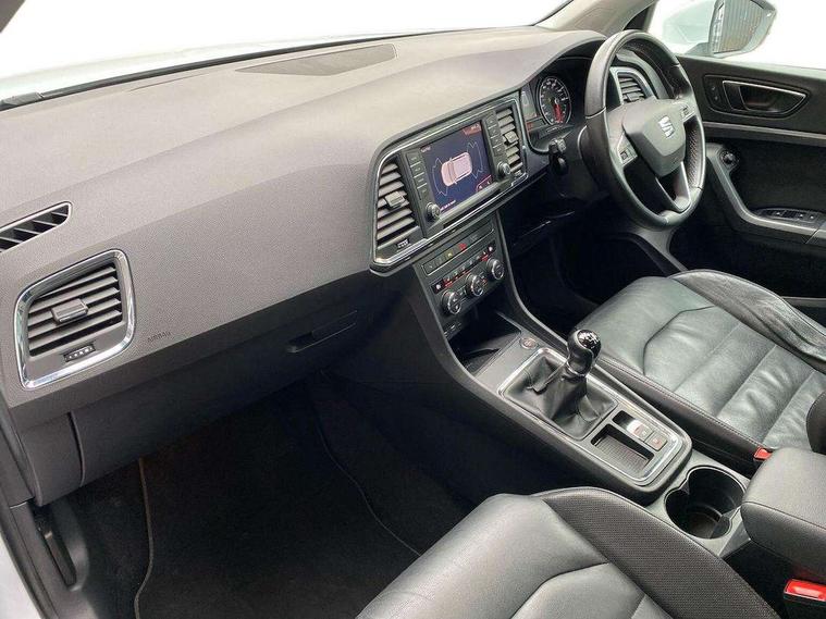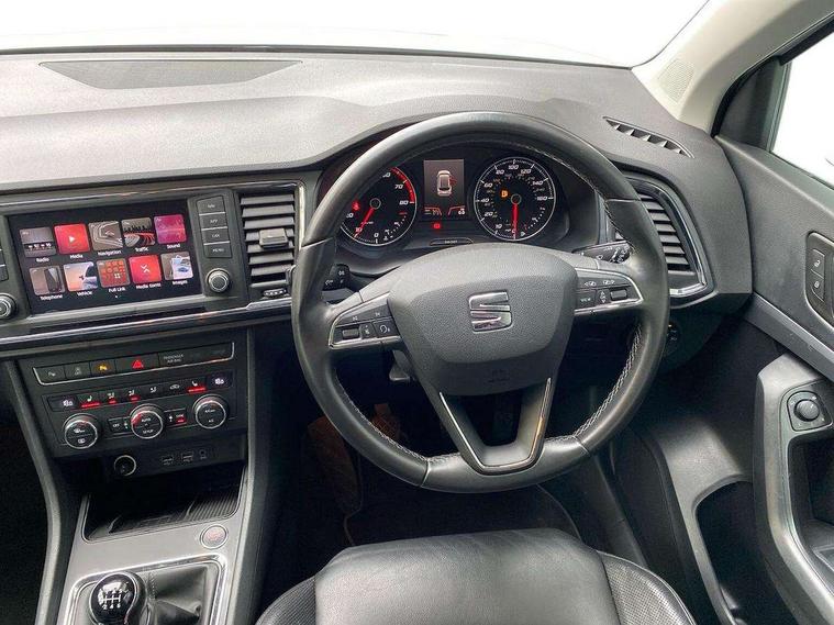 'Lights On' Reminder warning buzzer, 3.5" driver's display, 8.0" colour touchscreen with proximity sensor, Cruise control, Digital clock, Driver alert system, Electric speed sensitive power steering, Full Link Smartphone Integration with Mirror Link, Apple Car Play, Google Android Auto, Low fuel warning light, Multi function display, Outside temperature gauge, Park assist system with steering assist, Remote fuel flap release, RPM counter, Satellite navigation system, SEAT logo boot release, Self parking functionality (includes front and rear parking sensors), Trip computer, Wireless Smartphone charger, Comfort suspension, XDS electronic differential lock, Steering wheel mounted audio/phone controls, Auto dimming rear view mirror, Automatic headlights, Black wheel arch extensions, Body colour bumpers, Body colour door handles, Body colour door mirrors, Chrome headlight surround, Chrome roof rails, Chrome side window trim, Chromed centre radiator grille surround, Dark tinted rear windows, Electric folding door mirrors, Electrically adjustable and heated door mirrors, Front and rear electric windows, Hidden exhaust pipe, LED daytime running lights, LED front fog lights with static cornering light function, LED Headlights, LED tail lights, Matt black radiator grille, Rear fog lights, Rear spoiler, Rear wash/wipe, Welcome lighting, 12V power point front, 3 height adjustable rear headrests, 4 Lashing eyes in boot, 60/40 split folding rear seat, Active head restraints, Adjustable front armrest with storage compartment, Ambient lighting, Black leather upholstery, Driver sunvisor with covered mirror + card holder, Driver/passenger lumbar adjustment, Driver/passenger sunvisors with illuminated vanity mirrors, Dual zone climate control, Footwell illumination, Front courtesy lights, Front cupholders, Front reading lights, Front seat back storage pockets, Gear shift indicator, Height adjustable driver's seat, Height adjustable front headrests, Height adjustable passenger seat, Illuminated boot, Illuminated glovebox, Instrument lighting with brightness control, Isofix child seat preparation, Leather steering wheel and gear knob, Rear armrest, Rear central air outlet, Rear reading lights, Sports seats, Storage box under drivers seat, Convenience pack - Ateca, Navigation system pack - Ateca, Winter Pack - Ateca, 3x3 point rear seatbelts, ABS, Auto hold function, Automatic post collision braking, Driver/Front Passenger airbags, Drivers knee airbag, Electronic parking brake, Electronic stability control, ESP+EBA, Front and rear seatbelt reminder, Front assist including city emergency braking, Front passenger airbag deactivation, Front side airbags, Hill hold control, Predictive pedestrian protection, Tiredness recognition system, Traction control, Twin curtain airbags, Tyre pressure monitoring system, 2 folding remote keys with window open/close function, Immobiliser, Keyless entry and start, Locking wheel bolts, Remote central locking, Volumetric alarm with back up horn, Chrome effect dashboard facia, 17" Dynamic alloy wheels,