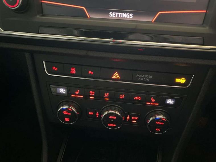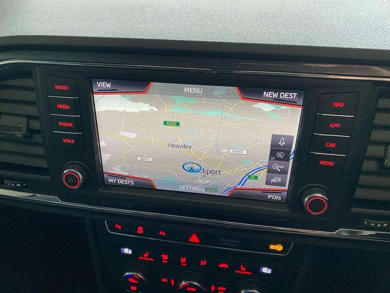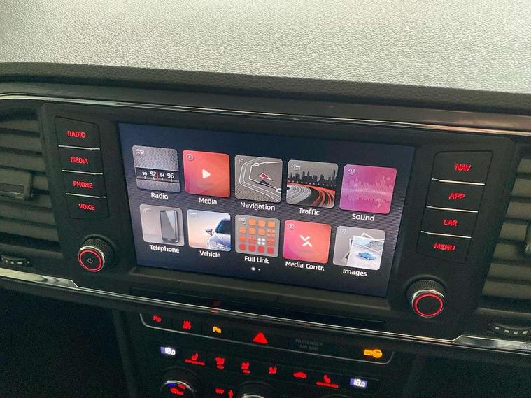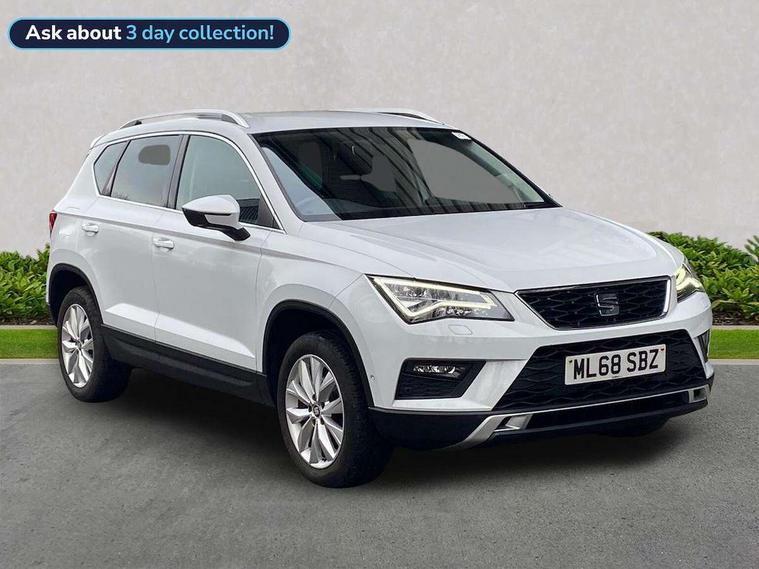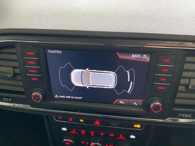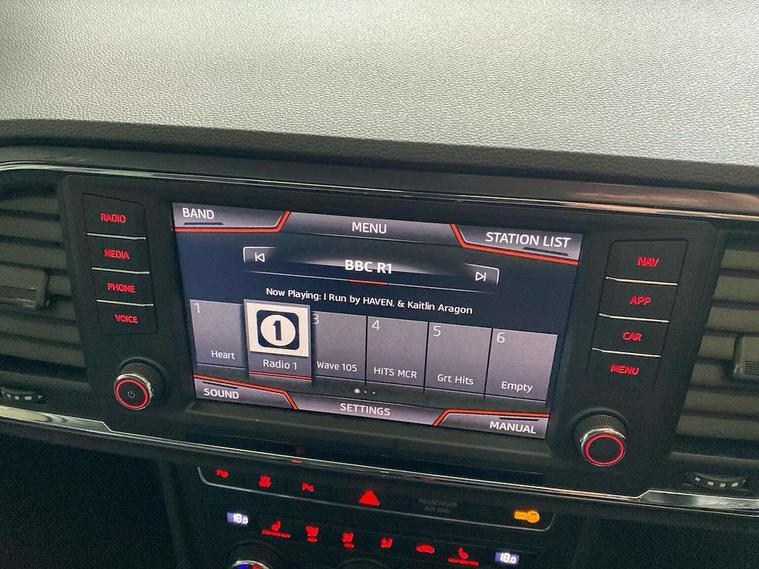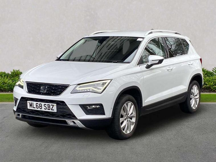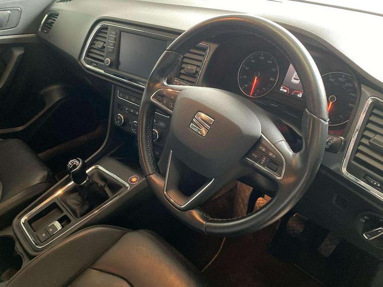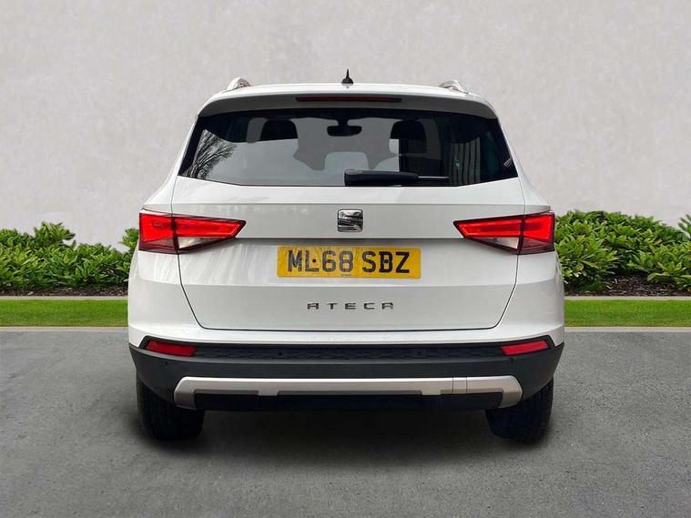 'Lights On' Reminder warning buzzer, 3.5" driver's display, 8.0" colour touchscreen with proximity sensor, Cruise control, Digital clock, Driver alert system, Electric speed sensitive power steering, Full Link Smartphone Integration with Mirror Link, Apple Car Play, Google Android Auto, Low fuel warning light, Multi function display, Outside temperature gauge, Park assist system with steering assist, Remote fuel flap release, RPM counter, Satellite navigation system, SEAT logo boot release, Self parking functionality (includes front and rear parking sensors), Trip computer, Wireless Smartphone charger, Comfort suspension, XDS electronic differential lock, Steering wheel mounted audio/phone controls, Auto dimming rear view mirror, Automatic headlights, Black wheel arch extensions, Body colour bumpers, Body colour door handles, Body colour door mirrors, Chrome headlight surround, Chrome roof rails, Chrome side window trim, Chromed centre radiator grille surround, Dark tinted rear windows, Electric folding door mirrors, Electrically adjustable and heated door mirrors, Front and rear electric windows, Hidden exhaust pipe, LED daytime running lights, LED front fog lights with static cornering light function, LED Headlights, LED tail lights, Matt black radiator grille, Rear fog lights, Rear spoiler, Rear wash/wipe, Welcome lighting, 12V power point front, 3 height adjustable rear headrests, 4 Lashing eyes in boot, 60/40 split folding rear seat, Active head restraints, Adjustable front armrest with storage compartment, Ambient lighting, Black leather upholstery, Driver sunvisor with covered mirror + card holder, Driver/passenger lumbar adjustment, Driver/passenger sunvisors with illuminated vanity mirrors, Dual zone climate control, Footwell illumination, Front courtesy lights, Front cupholders, Front reading lights, Front seat back storage pockets, Gear shift indicator, Height adjustable driver's seat, Height adjustable front headrests, Height adjustable passenger seat, Illuminated boot, Illuminated glovebox, Instrument lighting with brightness control, Isofix child seat preparation, Leather steering wheel and gear knob, Rear armrest, Rear central air outlet, Rear reading lights, Sports seats, Storage box under drivers seat, Convenience pack - Ateca, Navigation system pack - Ateca, Winter Pack - Ateca, 3x3 point rear seatbelts, ABS, Auto hold function, Automatic post collision braking, Driver/Front Passenger airbags, Drivers knee airbag, Electronic parking brake, Electronic stability control, ESP+EBA, Front and rear seatbelt reminder, Front assist including city emergency braking, Front passenger airbag deactivation, Front side airbags, Hill hold control, Predictive pedestrian protection, Tiredness recognition system, Traction control, Twin curtain airbags, Tyre pressure monitoring system, 2 folding remote keys with window open/close function, Immobiliser, Keyless entry and start, Locking wheel bolts, Remote central locking, Volumetric alarm with back up horn, Chrome effect dashboard facia, 17" Dynamic alloy wheels,