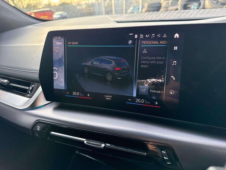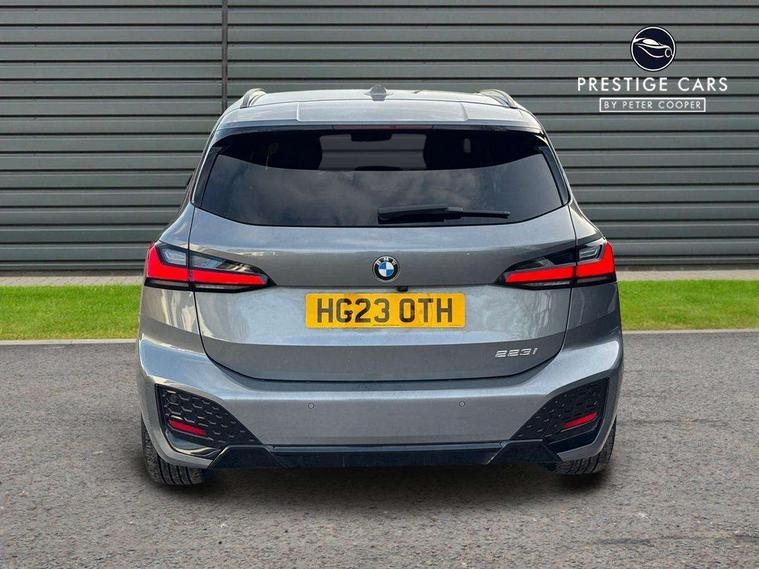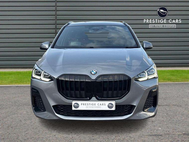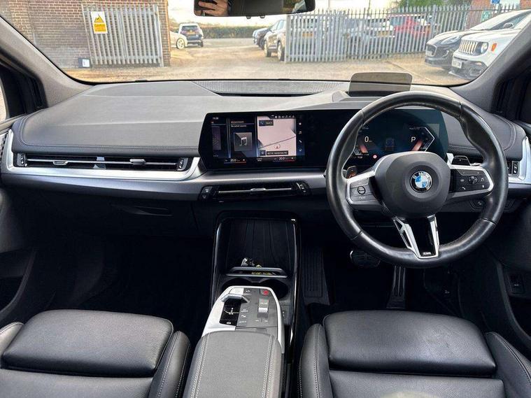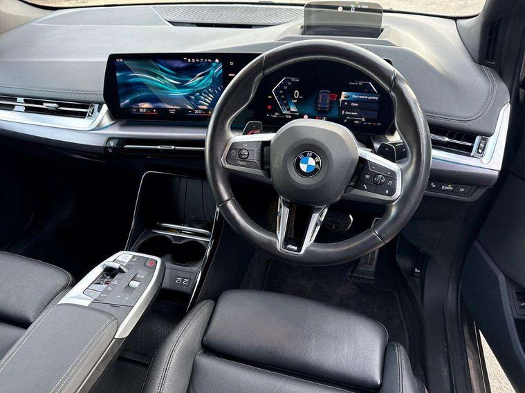 Active Guard incl speed limiting and lane departure functions with auto steering, and front collision warning with brake intervention, Automatic powered tailgate, Automatic start/stop function, BMW Online services, BMW Teleservices, Brake pad wear indicator in front and rear, Condition based service, Drive off assistant, Flat air vents on instrument panel in high gloss black, adjustable slats with elements in pearl chrome, iDrive controller, Instrument cluster with speedometer with miles per hour read out, tachometer and fuel gauge, Language version English, On board computer - average speed+fuel consumption, service interval, clock/date, odometer/trip meter, outside temperature display and ice warning, Parking assistant with active park distance control, reversing assistant, lateral parking aid and rear view camera, Servotronic variable electric power steering (EPS), Smartphone integration, Drive performance control with ECO PRO comfort + sport mode, Gear selector switch with toggle operation, M Adaptive suspension, Petrol Particulate Filter, Steptronic sport transmission with double clutch and gear shift paddles, 2x USB Type C ports in front centre console for charging and data transfer, 2x USB Type C ports in rear centre console for charging, DAB Digital radio, Welcome sound upon opening of the front driver or passenger door, Air inlet middle part on front apron in lines specific design with trim strip in satinised aluminium, Automatic headlights, Black rear bumper trim strip, BMW emblem, engine compartment lid and tailgate, Body colour roof mouldings, Body coloured door mirror caps, Contoured rear roof spoiler in vehicle colour with side aeroblades in black high-gloss, Driver side exterior mirror lighting with BMW logo projection, Dynamic brake lights, Electric adjustable heated door mirrors, Electric windows - front and rear, with open/close fingertip control, anti-trap facility and comfort closing, Folding door handles integrated flush with surface, Front and rear windscreen wipers with heated front washer nozzles, Front bumper cover with independent design in body colour with inserts in black high gloss, Front bumper design elements in satinised aluminium, Front door exit lights, Front door sill finishers aluminium inserts with M inscription, Front entry sills with aluminium inserts + BMW inscription, Front oramental grille with radiator grille bars in satinised aluminium, Heated rear window, Hidden exhaust pipe, High gloss shadow line, High gloss shadowline roof rails, Key with M identification, LED Daytime running lights and parking lights with turn indicators, LED number plate light, LED third brake light in rear spoiler, M identification on sides, Manual headlight range control, Model inscription on right tailgate, Rain sensor, Rear bumper cover with independent design in body colour with inserts in black high gloss, Rear side wing doors, Shark fin antenna, Side sill covers with independent design in Body colour, Trailer stabilisation logic, Trims on front and rear bumper covers colour-coordinated with side window graphic, Visible VIN plate, Welcome lighting, Window washer nozzle for rear view camera, 12V socket in right side trim panel, 2 bag hooks in luggage compartment, 2 front reading lights, 2 open cup holders in front centre console, 2x 12V power socket in luggage compartment and front centre console, 3 seat bench in 2nd row, 40:20:40 split folding rear seat backrests, Ambient lighting front and rear, Automatic two zone climate control air conditioning, Bottle trays in all doors, Child seat ISOFIX attachment for two outer rear seats and front passenger seat with anchorage points, Driver and front passenger sports seats, Four grab handles integrated in roof lining, Front and rear door pockets, Front and rear footwell lighting, Front and rear side armrest integrated into door trim, Front centre console storage compartment, Front head restraints, Glovebox with light, Heated front seats, Height adjustable 3 rear head restraints, Interior door handle recess light on all doors, Luggage compartment lighting, M Anthracite headlining, M specific floor mats, M sport leather steering wheel, Map pockets, Mechanical rear seats with fore/aft adjustment, Multi-function controls for steering wheel, One piece parcel shelf opens together with tailgate and removable, Rear cloth hooks, Single front passenger seat, Sliding rear seat bench, Stainless steel pedals, Steering wheel column manual adjustment, Storage compartment lighting in centre console and storage tray in centre stack, Storage compartment net in left side trim panel, Storage compartment with folding cover under centre console armrest cushion, Sunvisors with illuminated vanity mirrors, Three spoke sport leather steering wheel, Connected pack professional - 2 Series Active Tourer, Technology pack - 2 Series Active Tourer - MY22, 3 point seatbelts on all seats, front pyrotechnic belt tensioners, stopper and belt force limiters, rear coded belt buckles, Airbag - Front driver and passenger, front and rear head, front side, curtain head protection, manual deactivation of front passenger airbag possible, Anti lock braking system (ABS) with brake assist, Automatic hold function, BMW emergency call, Brake drying, Braking readiness, Child proof locking system in rear door, Cornering brake control, Crash Sensor - activates hazard/interior lighting + unlocks doors, DSC - Dynamic Stability Control, Dynamic brake control, Dynamic Traction Control - DTC, Electromechanical parking brake, Energy recovery system, Front disc brakes, Integrated braking system, PC iBrake PostCrash approach control warning with light braking function, Rear disc brakes, Tyre pressure monitoring system, Warning triangle and first aid kit, Anti theft alarm system, Closing system with central locking, Engine immobiliser, Locking wheel bolts, Front centre console trim in high gloss black with my mode expressive, BMW mobility tyre sealing system, Reduced rolling resistanc