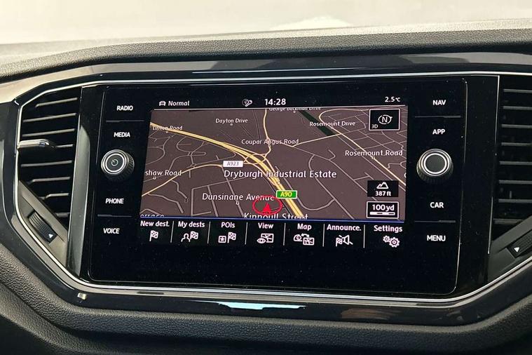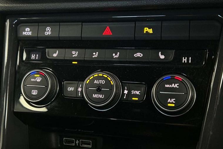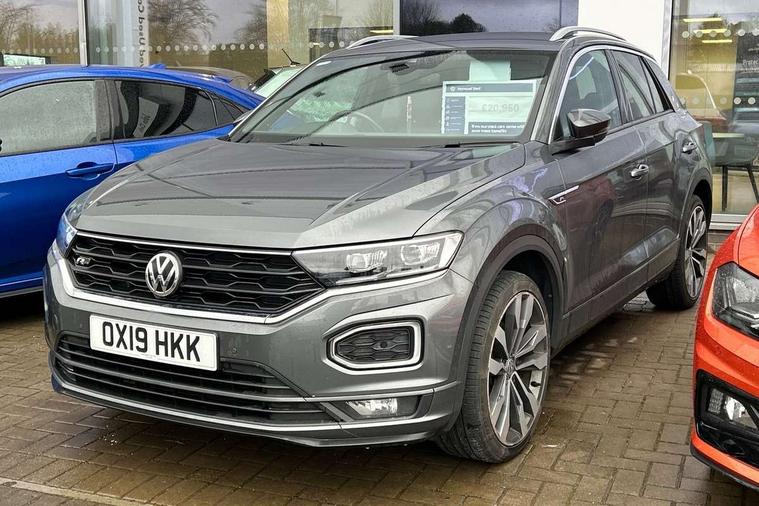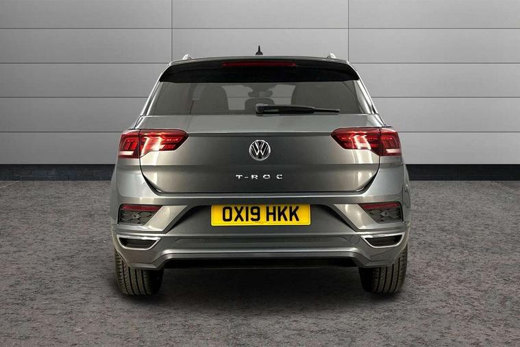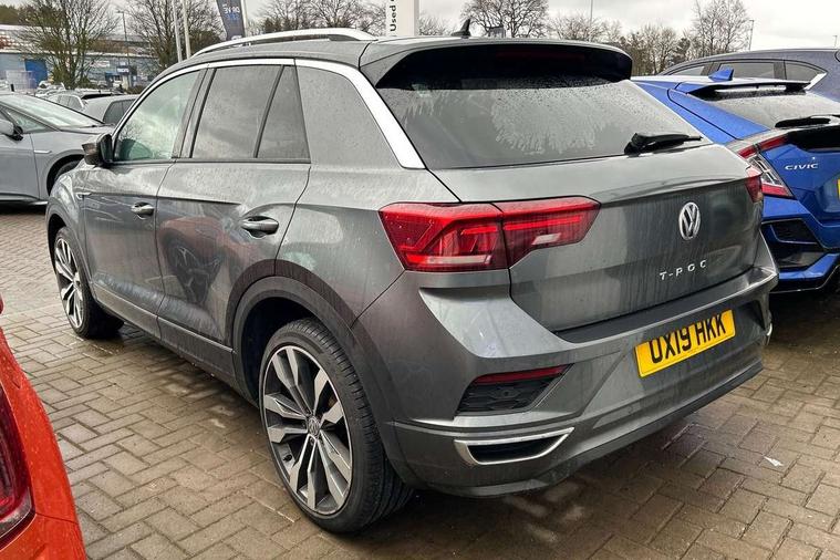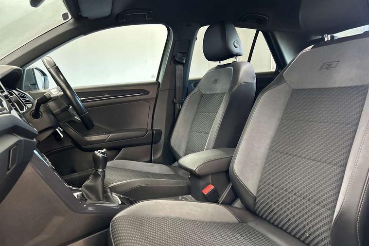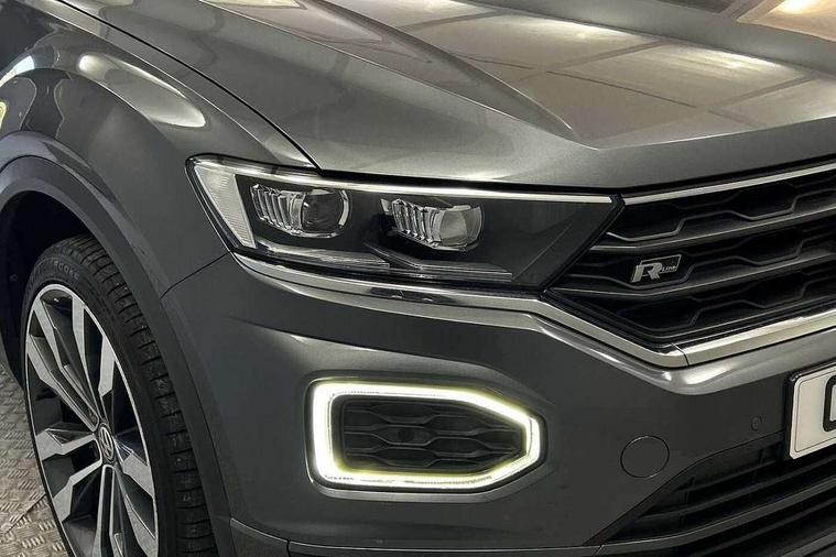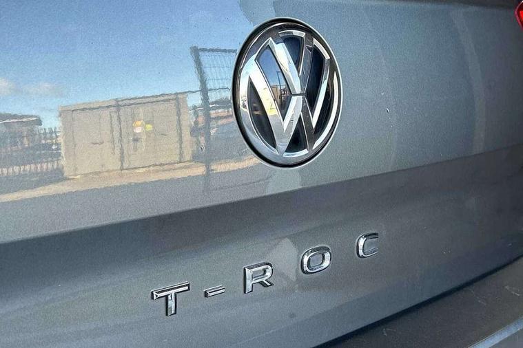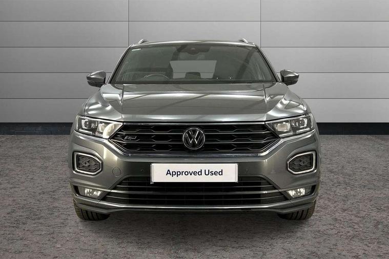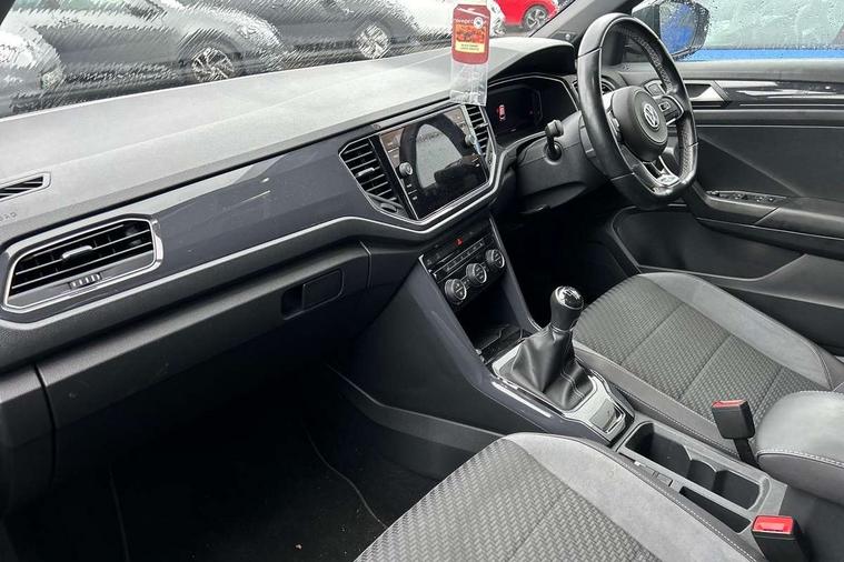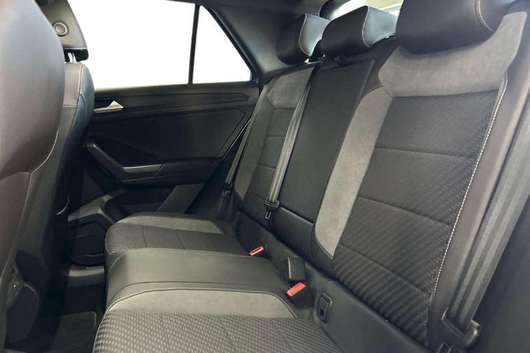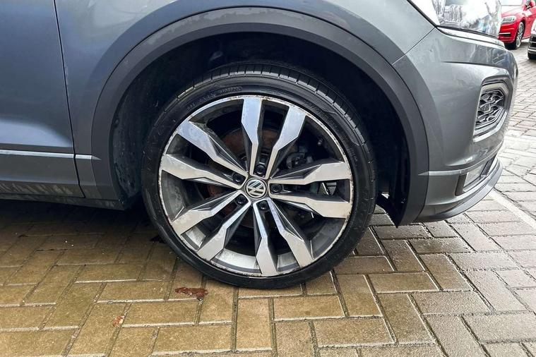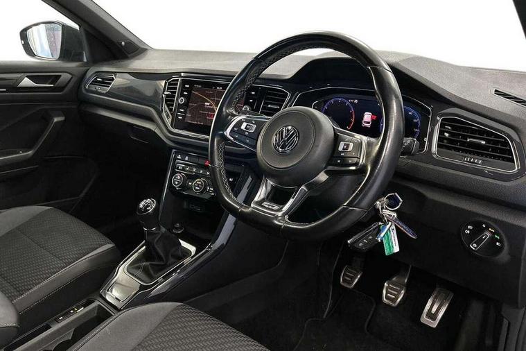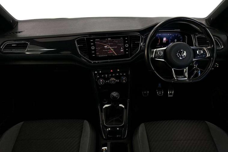 2 USB connection charging sockets, Active Info Display, 10.3" high resolution TFT dash display screen with customised information, Adaptive cruise control, App-Connect, Automatic start/stop system, Bluetooth telephone and audio connection for compatible devices, Car information display, Car-Net Security and Service, Discover navigation, 8" touch screen navigation/infotainment system with Car-Net, European map, CD/radio, 2D/3D map and speed limiter, Driver alert system with audible and visual fatigue detection system, Driver profile selection, Front assist, radar sensor controlled distance monitor, city emergency braking + predictive pedestrian protection, Lane assist, Multifunction computer with visual gear change recommendation for fuel consumption, Progressive power assisted steering, Service interval indicator, Think blue trainer driver tips and journey analysis, Voice activation, Warning sound and light for doors and tailgate open, Warning sound and light for front seatbelts unfastened, Battery regeneration during braking, Bluetooth - Simultaneous pairing of 2 compatible mobile devices, DAB Digital radio, Dynamic navigation based on TMC+, Multi device interface (MDI) with USB connection, Music playback - MP3, WMA and AAC files, Premium USB cable in choice of either Apple or Android smartphone compatibility, SD card slot, SMS functionality - read, compose and send SMS messages using touch-screen display, Three route options - Fast, Short, Eco, Title and cover art display, Auto dimming interior rear view mirror, Automatic hazard lights activation under emergency braking, Black grained lower door protectors, Black grained wheel arches, Body colour door handles, Body colour rear roof spoiler, Chrome effect left and right trapezoid exhaust tailpipe fascia surround, Chrome trim on upper and lower radiator grille, Door mirror integrated indicators, Dusk sensor, Electrically foldable, adjustable and heated door mirrors with puddle lights and reverse activated kerb-view adjustment on passenger's door mirror, Front and rear electric windows, Front fog lights with static cornering function, Front windscreen wiper with intermittent wipe and 4 position delay, Fully galvanised body, Heated rear window, High level 3rd brake light, LED darkened rear light clusters, LED dipped and main beam headlights with automatic range adjustment including signature LED daytime running lights, LED rear number plate lights, Manual coming/automatic leaving home lighting function, Rain sensor, Rear tinted glass from B-pillar backwards approx 65% tinted, Rear windscreen washer and wiper with interval delay, 12V socket in centre console storage area, 2 LED front and rear reading lights, 3 rear head restraints, 4 load lashing points in luggage compartment, Aluminium pedals, Ambient lighting in front footwell and light strips below trim in front doors, Black roof lining and sun visors, Carbon flag cloth upholstery, Climate control - 2 zone electronic air conditioning with automatic air recirculation and allergy filter, Drawer under drivers seat, Front + rear carpet mats, Front centre armrest with storage compartment, longitudinal and height adjustable and two rear air vents, Front cupholders x 2, Front footwell illumination, Front seat back storage pockets, Front sport seats, Glovebox, Height adjustable front seats, Height/reach adjust steering wheel, Illuminated vanity mirrors, Instrument lighting, white adjustable panel illumination, Interior light delay, Isofix easy fit child seat preparation for 2 outer rear seats, Load through provision with single cup holder when folded down, Luggage compartment cover, removable, Luggage compartment lighting, R Line badge, Split folding rear seat backrests with centre armrest, Storage compartment in left and right luggage area, Storage compartment in rear doors, Storage compartments in driver and front passenger doors, Three spoke multi-function leather trimmed steering wheel and gearknob, Unique R Line door sill protectors, R line styling pack - T-Roc, Winter pack - T-Roc, 3 rear three point seatbelts, ABS, Driver and front passenger safety-optimised head restraints, Electronic parking brake with auto hold, ESC with EDL, ASR, EDTC and trailer stabilisation function, Front and rear curtain airbags, driver and front passenger airbags with passenger deactivation switch and front side impact airbags, Rigid safety cell with front and rear crumple zones, Three point height adjust front seatbelts + pretensioners, Tyre pressure loss indicator, Ventilated front and rear disc brakes, Volkswagen roadside assistance, Alarm with remote central locking and interior protection, Electronic engine immobiliser, Remote central locking with 2 remote folding keys, Caribou grey decorative inserts in dash and door panel, 19" Suzuka alloy wheels with low rolling resistance tyres and anti wheel bolts, Steel space saver spare wheel,