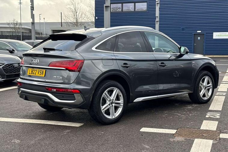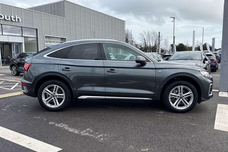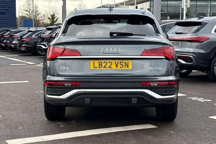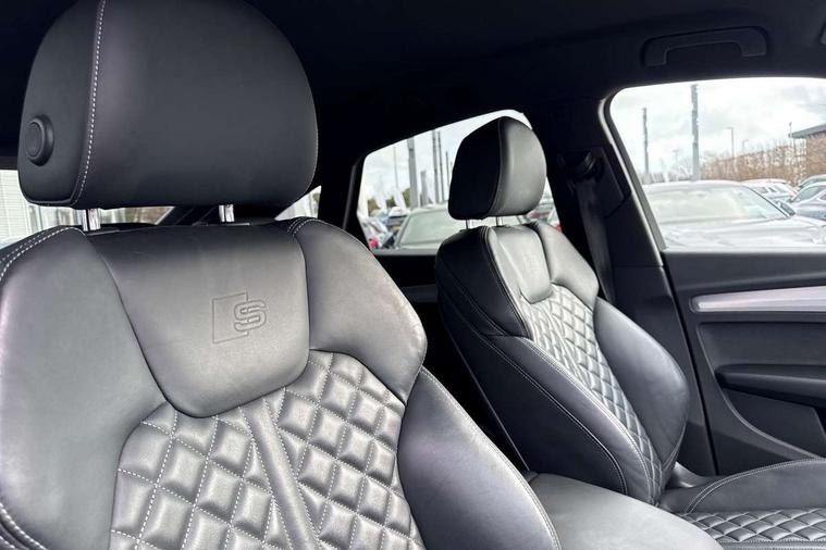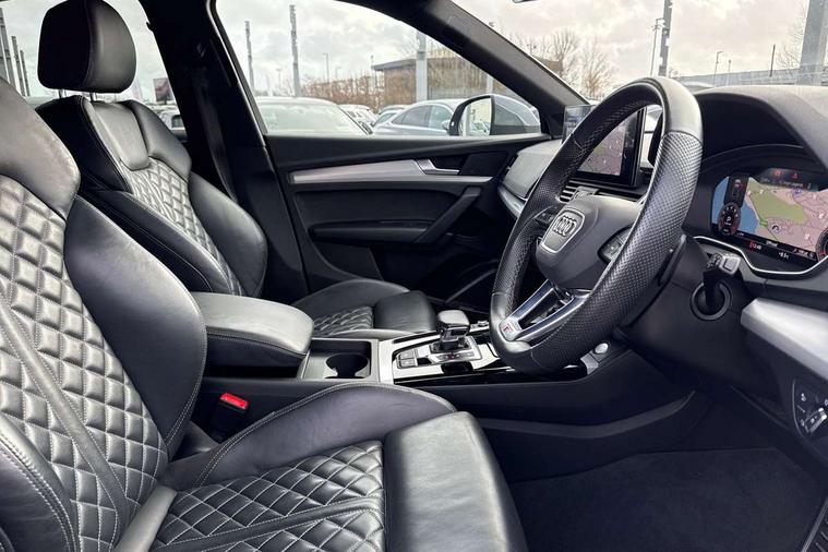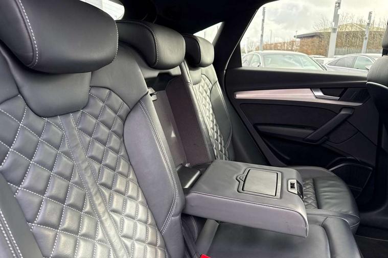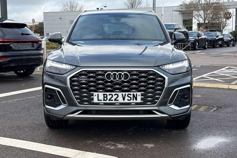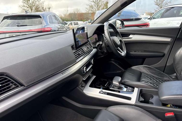 Audi connect safety and service (e-call), Audi connect with Amazon Alexa Integration, Audi drive select, Audi virtual cockpit plus with 12.3" screen and three different layout designs, Audi wireless smartphone interface, Automatic start-stop system with coasting functionality and efficiency programme, Bluetooth interface, Electro - mechanical power assisted steering, MMI navigation plus with 10.1" touch screen, Power tailgate, Reversing camera, Service interval indicator, Voice control system with Audi hotword activation "Hey Audi", Quattro on demand, S line sports suspension, 2 x USB charging port with aux input socket, DAB Digital radio, Acoustic windscreen, Aluminium roof rails, Audi matrix LED headlights with dynamic front and rear indicators, Auto dimming door mirrors, Auto dimming rear view mirror, Automatic headlights and windscreen wipers, Body colour door mirrors, Body colour rear diffuser with matt aluminium silver surrounds, Body colour underbody protection, Chrome plated exhaust trims, Daytime running lights, Door sills in Selenite silver, Electric adjustable/heated/folding door mirrors, Front air inlet surrounds in aluminium, Front and rear electric windows, Front radiator grille in honeycomb design, Headlight washers, High level LED brake light, Lower bumpers painted in contrast Manhattan grey, Rear chrome trim strip below lights, Rear privacy glass and rear side windows, Rear side wing doors, Rear wiper, Roof bars, S Line badges on the front wings, S Line front and rear bumpers, S Line rear spoiler, S Line side skirts, 3 rear headrests, 40:20:40 split folding 3 rear bench seat in 2nd row with rear centre armrest, Black cloth headlining, Comfort front centre armrest, Contrast stitching on seats, steering wheel and gear lever gaiter, Deluxe 3 zone electronic climate control, Front head restraints, Front/rear floor mats, Gear lever in black leather, Heated front seats, Height/reach adjustable steering column, Illuminated door sill trims with S logo, ISOFIX child seat mounting and top tether, Manual seat adjustment with 4-way electric lumbar support, Removable luggage compartment floor, Single front passenger seat, Stainless steel pedals, Sunvisors with vanity mirrors, Trunk roller cover, High gloss pack - Q5, LED interior light pack - Q5, 3 point seatbelts on all seats, 6 airbags - Driver, front passenger, curtain and side airbags, Electrically operated child locks on rear doors, Electromechanical parking brake, Electronic stabilisation control including ABS, ASR and EDL, Front passenger airbag deactivation, Hill descent control, Hill hold assist, Multi collision brake assist, Pop-up bonnet for pedestrian protection, Pre sense city, Seat belt force limiter, Seatbelt monitoring, Tyre pressure warning, Warning triangle and first aid kit, Anti theft alarm, Anti-theft wheel bolts, Keyless Go access/ignition system, Remote central locking, Matt brushed aluminium inlays,
