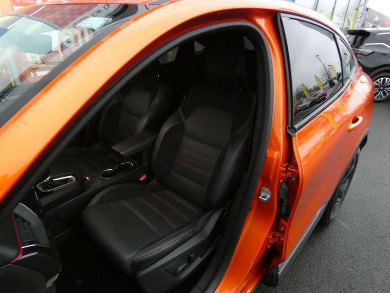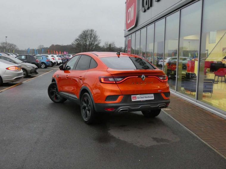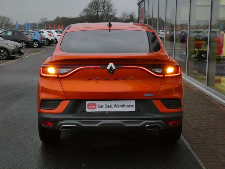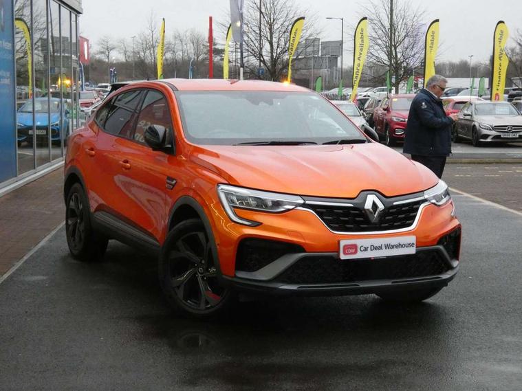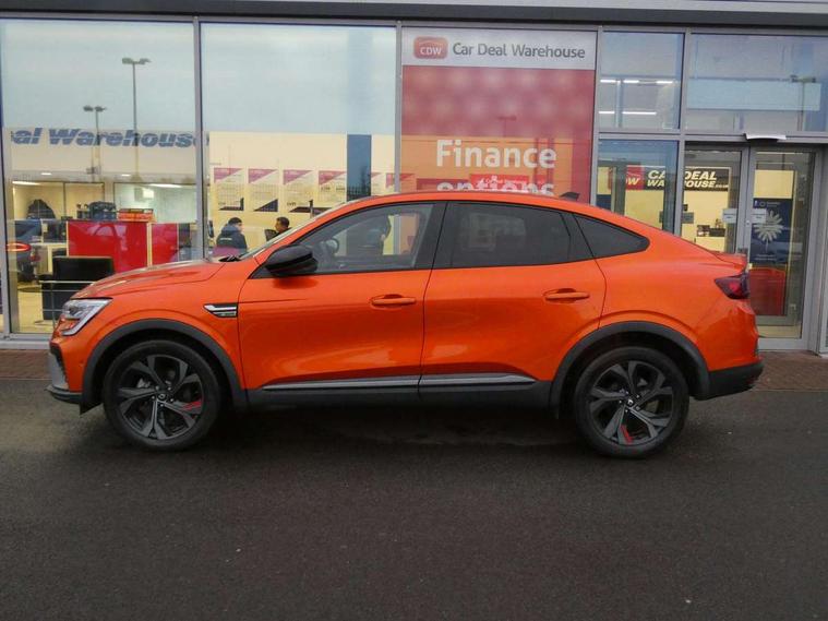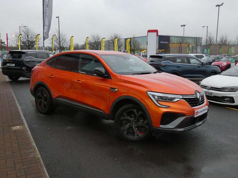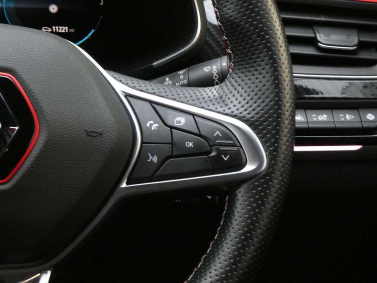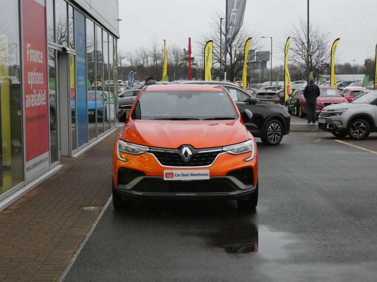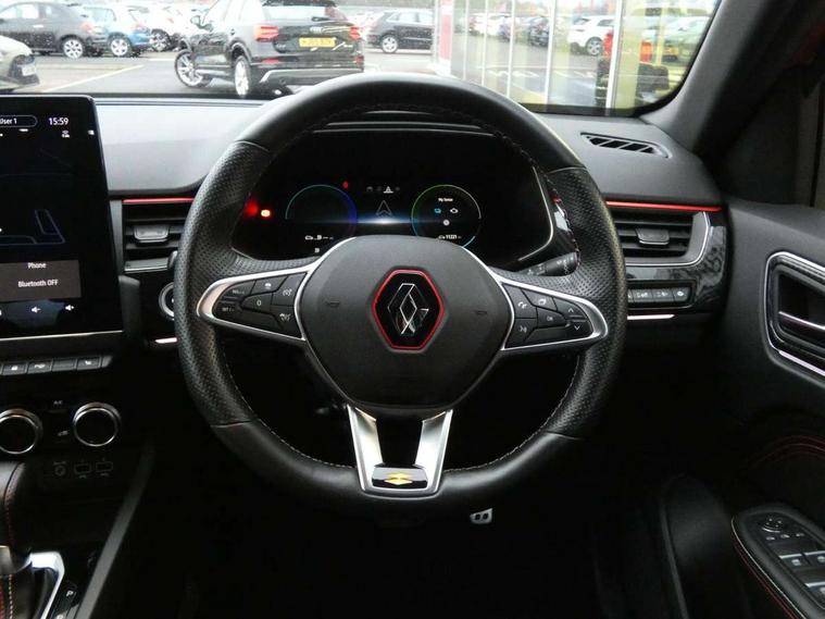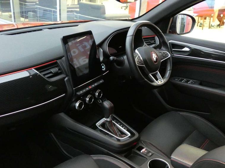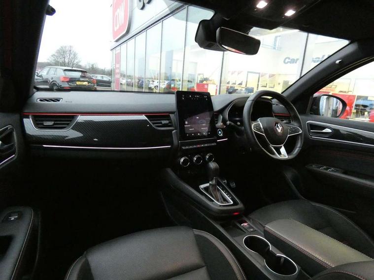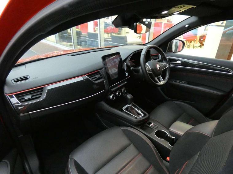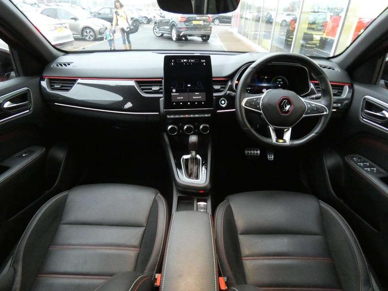 7" TFT Driver information display, Blind spot warning, Bluetooth system, EASY LINK 9.3" portrait touchscreen with navigation, Google search and traffic information, eCall emergency call system, Eco mode, EV button to activate pure mode, Front and rear parking sensors, Gear change indicator, Lane departure warning, Lane keep assist, Multi-sense - 3 driving modes and 8 ambient lighting, Rear cross traffic alert, Rear view camera, Renault automatic emergency assist, Smartphone integration compatible with Apple CarPlay and Android Auto, Traffic sign recognition with over speed prevention, Trip computer, Variable assistance electric power steering, Wireless phone charger, DAB radio, USB port, 3rd brake light, Auto dimming rear view mirror, Automatic headlights, Automatic high / low beam, Automatic windscreen wipers with rain sensor, Black side door protection with gun metal insert, Body coloured bumpers, C-shaped LED front signature lighting, Chrome decopart on wing (fender molding) with R.S. Line badge, Double chromed exhaust tailpipes elements, Extra tinted rear windows and tailgate, Frameless rear view mirror, Front and rear electric windows, Front bumper with F1 blade and honeycomb front grille, Front driver window with one touch facility and anti-pinch function, Front grille with chrome on upper part, Full LED headlights, Glossy black door mirror and lower window lining, Gun Metal front and rear skid plates, Heated rear window, R.S. Line badges on front wing and hatch door, Rain sensor, Rear windscreen wiper, Shiny black shark fin antenna, Side mirrors adjustable electrically, electrically foldable, with defrosting and temperature sensor, automatically foldable at vehicle closure, 3 seat bench in 2nd row, 60:40 split and fixed base rear seats, Aluminium pedals, Automatic climate control with combined filter, humidity sensor and AQS, Black interior roof lining, Carbon style dashboard, Central console with storage, Driver's seat height adjustment, Electrically adjustable front seats, Front and rear head restraints, Height and reach adjustable steering wheel, ISOFIX child seat fixing points on rear outermost seats, LED front and rear roof lights, Passenger seat height adjuster, R.S. line black suede-leather upholstery with red/grey stiching, R.S. Line perforated leather steering wheel with red/black harmony and R.S. Line badge, Rear air vents, Red inserts on air vents, Single front passenger seat, Parking Pack - Hands-free parking & flank protection - Arkana, Winter pack - Arkana, 3x3 point rear seat belts, ABS+EBA, Active emergency braking system, B Brake Mode - One pedal driving with increased regenerative braking, Distance warning alert, Driver airbag, Driver and passenger front and side airbag deactivation, Driver and passenger side airbags, Driver height adjustable seat belt, Electronic parking brake with auto hold, ESC (Electronic Stability Control), Front and rear no seatbelt warning sound, Front curtain airbags, Front head airbags, Hill start assist, Passenger airbag, Tyre pressure warning light, Anti drill door locks and locking fuel cap, Central door locking, Deadlocking system, Hands free keycard with Keyless access and start, RAID (Renault Anti-Intruder Device) automatic door locking, Rear side wing door and window child locking function (front driver door control panel), Superlocking, Thatcham alarm, 18" Silverstone diamond alloy wheels with red inserts,