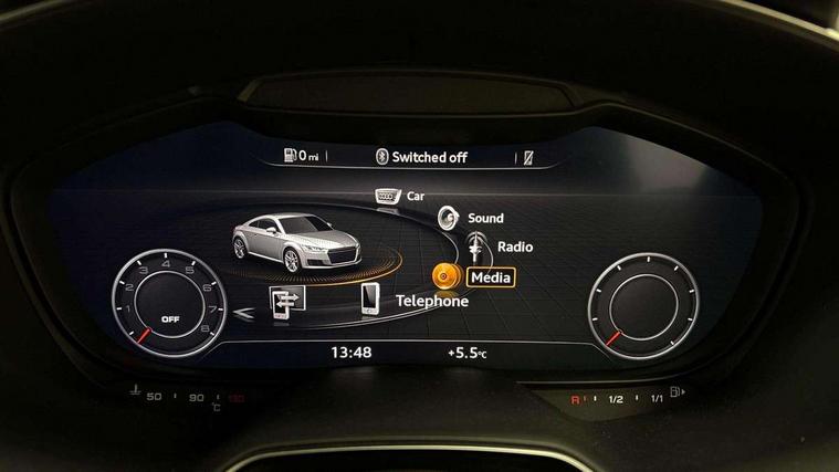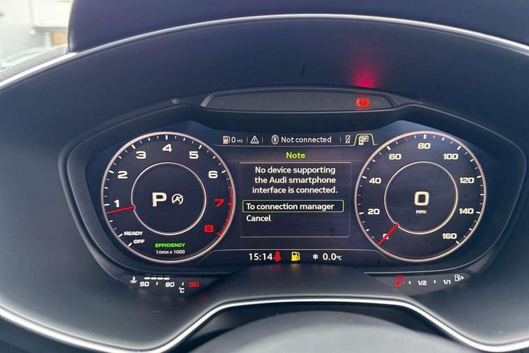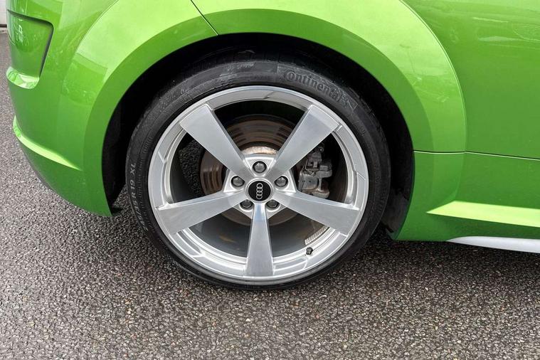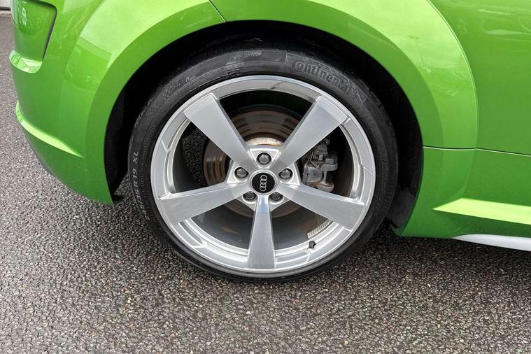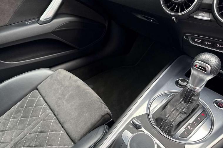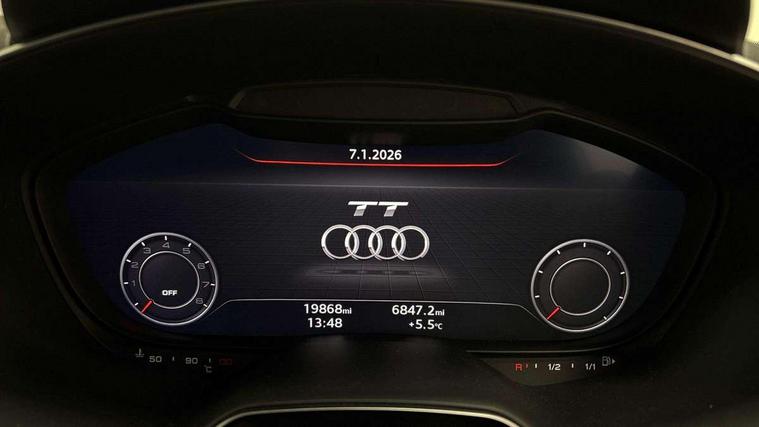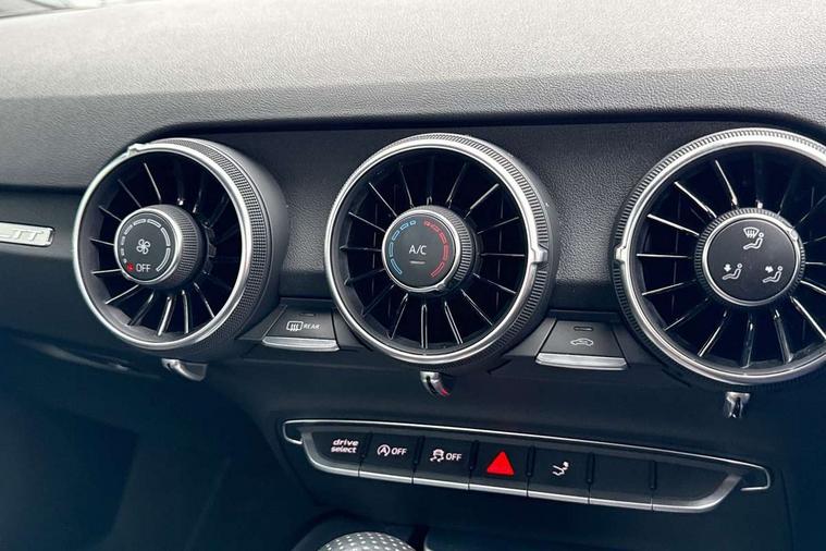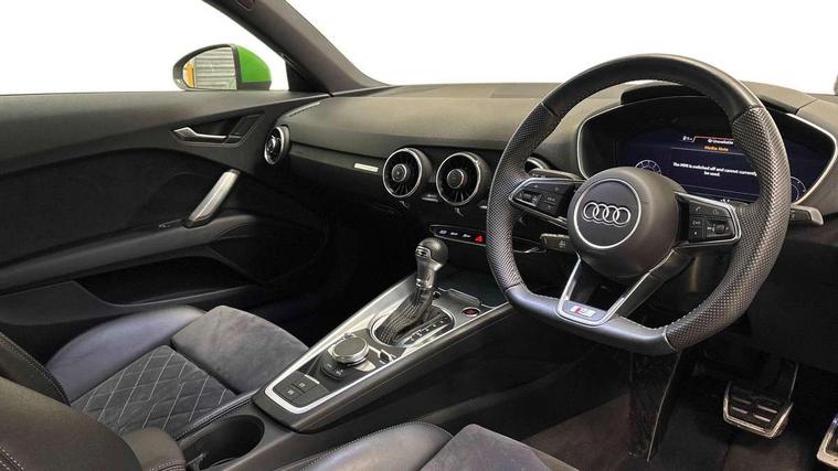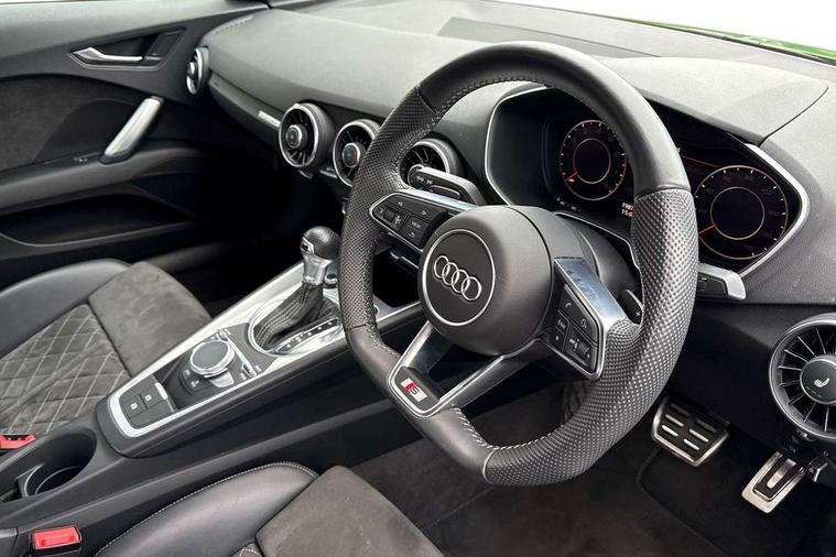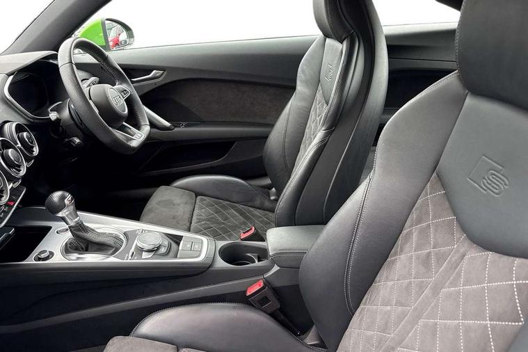 Audi drive select with 4 Pre configured modes, Audi smartphone interface, Audi virtual cockpit - 12.3" high-resolution LCD display with fully customisable instrument cluster, Cruise control + speed limiter, Emergency call service, MMI touch panel, Mobile phone preparation with bluetooth interface, Progressive power assisted steering, Service interval indicator, Start/Stop system with energy recuperation, TP memo, S line sports suspension, AM/FM radio, Bluetooth audio streaming, DAB Digital radio, MMI Radio with CD player and SD/XC card slot, 3rd brake light, Auto dimming rear view mirror, Auto headlight range control, Black door mirrors, Body colour bumpers, Electric folding door mirrors, Electric front windows, Electrically adjustable and heated door mirrors with integrated LED side indicators, Front fog lights, Green tinted heat insulating glass, High gloss black radiator grille, LED daytime running lights, LED headlights with LED rear lights + dynamic rear indicators, Light and rain sensors, Rear boot, Retractable rear boot spoiler, S line badges on front wings, Sunband for windscreen, 12V socket, 2 rear seats, 3 spoke flat bottomed high multi-function leather sport steering wheel with gearshift paddles, 4 way electric lumbar support for driver and front passenger, Black headlining, Contrasting silver stitching in steering wheel, Door sill trims with S line logo, Extended aluminium look with stainless steel pedals, Front centre armrest, Front passenger seat, Front super sports seats, Heated front seats, Height adjustable driver's seat, Height adjustable front head restraints, Height/reach adjust steering wheel, ISOFIX child seat mounting for front passenger seat with airbag deactivation, Manual adjustment of seat height, fore/aft position, seat angle, seat depth and backrest angle, Perforated leather gearknob in black, Rear head restraints, Rear top tether child seat ISOFIX attachment, S Line badge on steering wheel, Split folding rear seat, Non smoking pack - TT/TT RS, S Line design styling pack - TT, 3 point front seat belts, ABS, ASR traction control, Curtain airbags, Driver and front passenger airbag with front passenger airbag deactivation, EDL traction control, Electromechanical parking brake, ESP, First aid kit, Front side airbags, Head airbags, Hill hold assist, Seatbelt warning, Tyre pressure loss indicator, Warning triangle, Anti theft alarm, Anti theft wheel bolts, Immobiliser, Keyless Go, Remote central locking, Matt brushed aluminium inlays, Tool kit, Tyre repair kit,