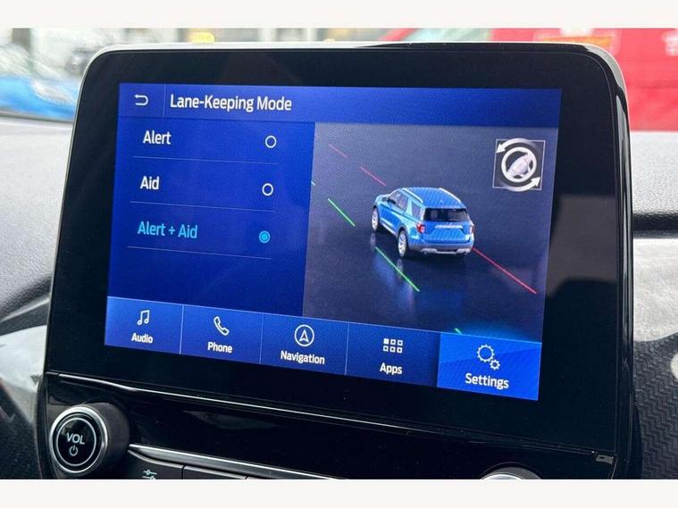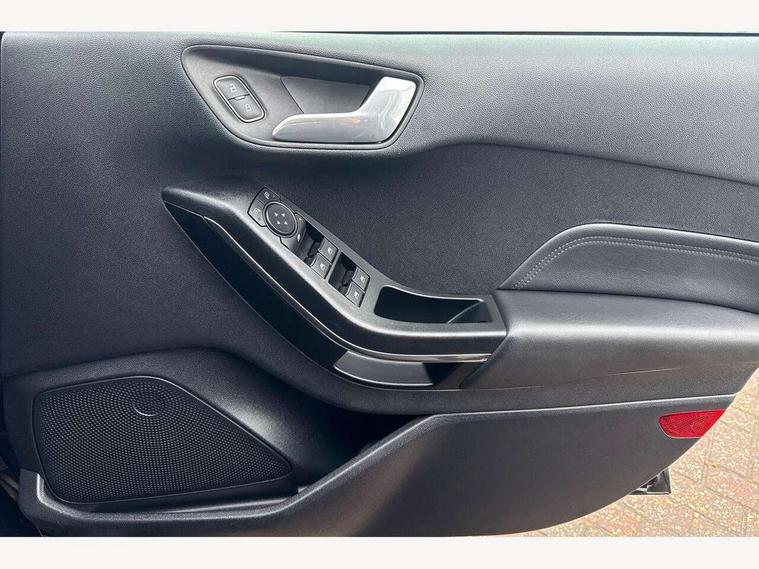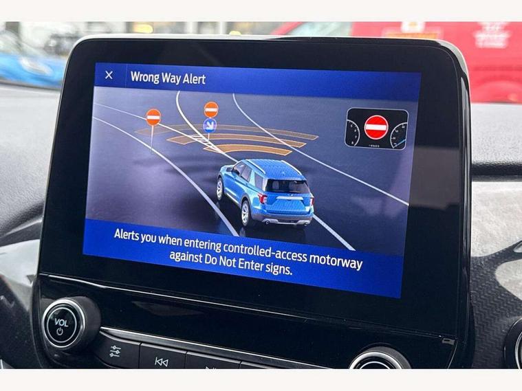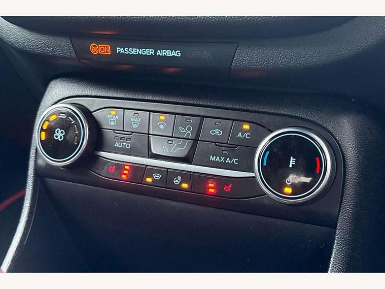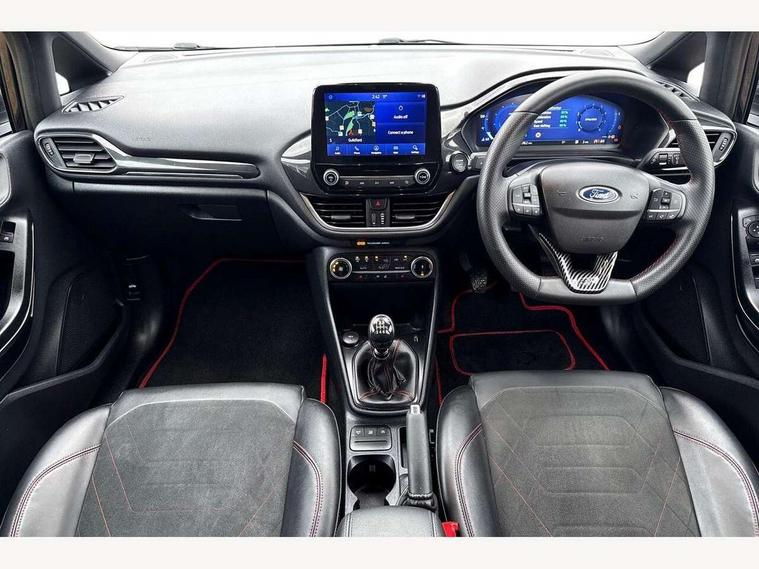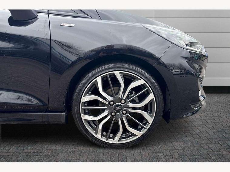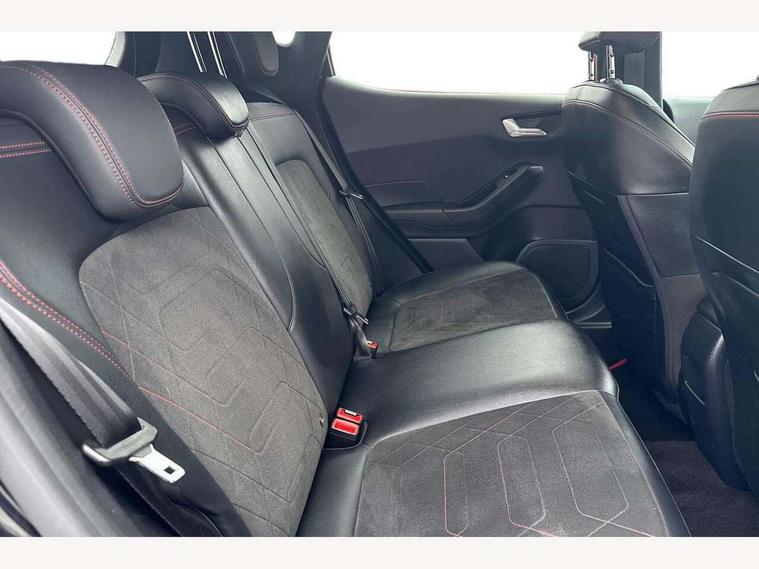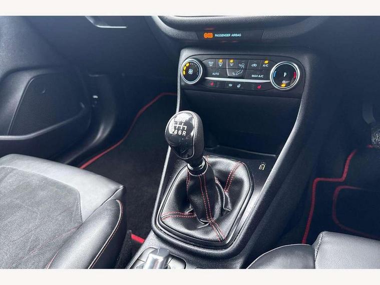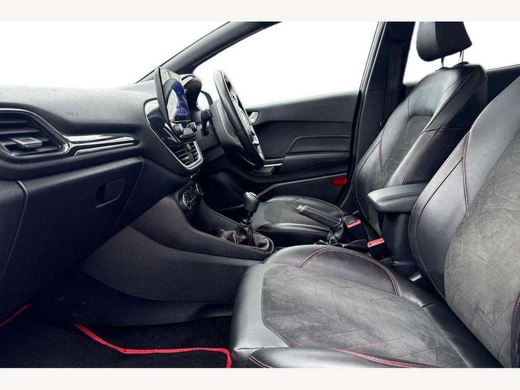 Driver alert system, Electric power steering, Ford easy fuel, Lane keep assist, Lane keeping aid, Rear parking distance sensors, Rear view camera, Selectable drive modes (Normal, Sport, Track), Trip computer, Sports suspension, 3rd brake light, Auto high beam, Automatic headlights, Body colour bumpers, Body colour large rear spoiler, Body coloured electrically operated with side indicators, Electric front windows/one touch facility, Electric rear windows, LED rear lights, Quickclear heated windscreen, Rain sensing wipers and auto dimming rear view mirror, Rear privacy glass, Rear side wing doors, Rear wiper, Unique ST-Line grille, full bodystyling kit and large body coloured rear spoiler, 3 rear headrests, 3 seat bench in 2nd row, 4 way manually adjustable passenger seat, Adjustable head restraints, Black headlining, Centre console with opening armrest, 2x cupholders, 12v and USB, EATC - Electronic Auto Temperature control, Leather gear knob, Manual 4-way driver seat adjust, Premium floor mats, Sensico partial premium leather upholstery with red stitching, Sensico wrapped steering wheel, Single front passenger seat, Winter pack [GTBAB]- Fiesta, 3 point seatbelts on all rear seats, Electronic stability control with hill start assist, Front and rear seat belt warning, Manual child lock in rear doors, Tyre pressure monitoring system, Ford keyfree system with Keyless entry and keyless start, MyKey system, Remote central locking, Thatcham alarm with power door dead locks, 18" 5x2 spoke alloys with pearl grey machined finish,