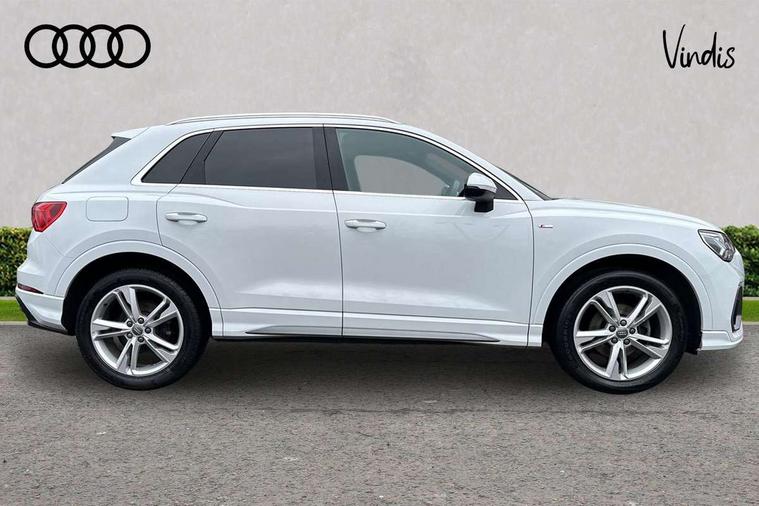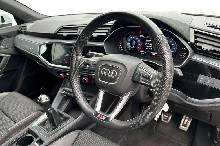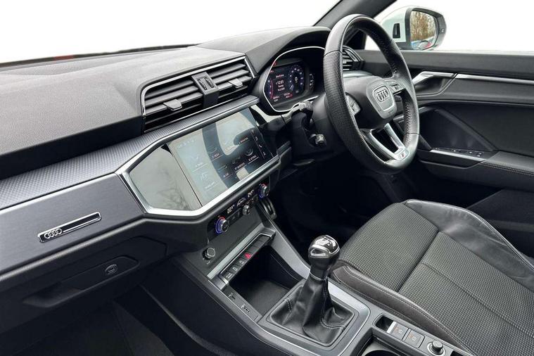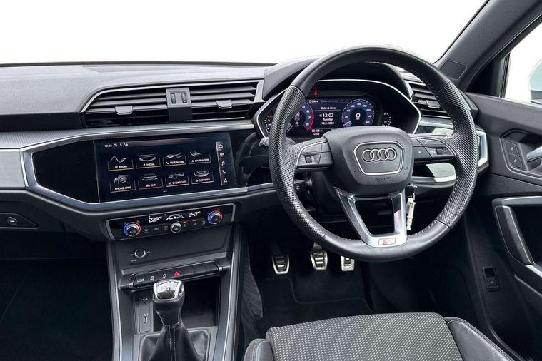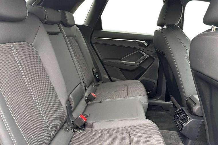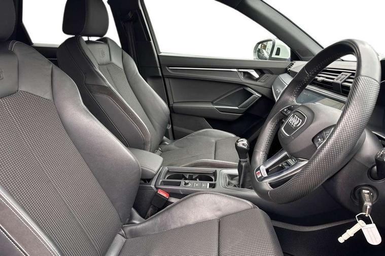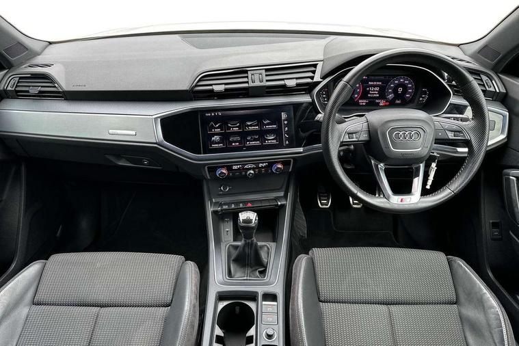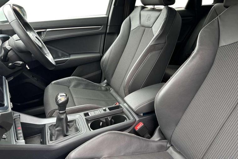 Audi connect safety and service (e-call), Audi drive select, Audi lane departure warning, Audi side assist, Audi smartphone interface, Bluetooth interface, Camera based traffic sign recognition, Cruise control + speed limiter, MMI navigation plus with MMI touch, Power opening/closing tailgate, Progressive steering, Rear parking sensors, Service interval indicator, Stop/start system, Voice control system, Sports suspension, 1 x USB type C and 1 USB type A charging points, 6 speakers, DAB digital radio module, Acoustic windscreen, Aluminium roof rails, Aluminium window trim, Auto dimming rear view mirror, Body coloured bumpers, Diffuser in matt Platinum grey, Electrically adjustable and heated door mirrors with integrated LED side indicators, Front and rear electric windows, Front fog lights, Front side air inlets in matt platinum grey, Front spoiler blade in matt platinum grey, Grille vertical bars in aluminium silver/Matt, High gloss black finish B and C pillars, LED headlights with LED daytime running lights and dynamic rear indicator, LED rear lights, Privacy glass, Rain and light sensors, Rear diffuser strip in matt titanium black, S Line badge on wings, S Line front and rear bumpers, Side skirt insert in matt Platinium grey, Titanium black radiator grille, 12V socket in rear centre console, 40:20:40 split folding rear bench seat, Adjustable rear seat bench/backrest with centre armrest and cupholder, Aluminium door sill trims, Black cloth headlining, Dual zone climate control, Front and rear black floor mats with contrast stitching in rock grey, Front and rear headrests, Front centre armrest with storage compartment and angle adjustment, Illuminated door sill trims with S logo, ISOFIX child seat mounting and Top Tether with front passenger airbag deactivation, Manual front seats with height adjustment, Perforated leather gearknob, Stainless steel luggage compartment sill finisher, Stainless steel pedals, Non smoking pack - Q3, 3x3 point rear seatbelts, 6 airbags - Driver, front passenger, curtain and side windows, Electrically operated child locks on rear doors, Electromechanical parking brake, Electronic stabilisation control including ABS, ASR and EDL, Hill hold assist, Pre sense basic, Seatbelt monitoring, Tyre pressure warning, Warning triangle and first aid kit, Anti theft alarm, Anti theft wheel bolts, Audi pre-sense front with pedestrain and cyclist recognition, Remote central locking, Dark matt brushed aluminium inlay, MMI touch colour display in gloss black with aluminium surround,
