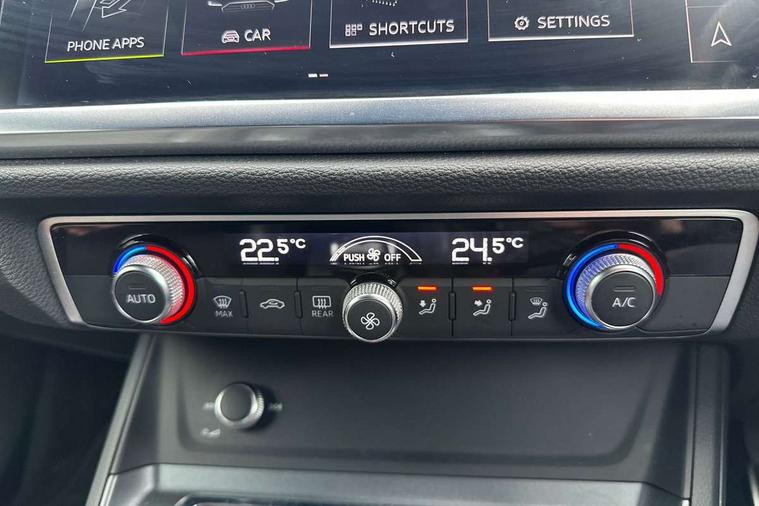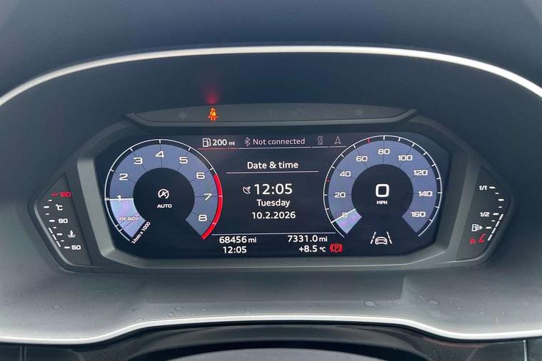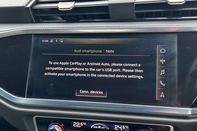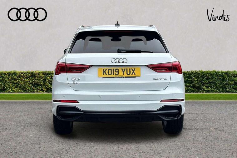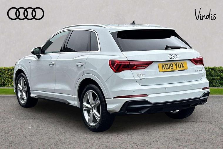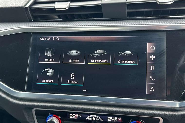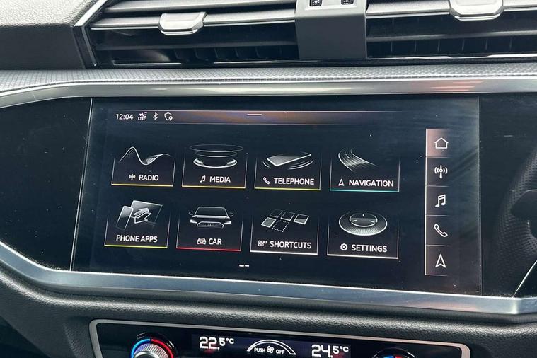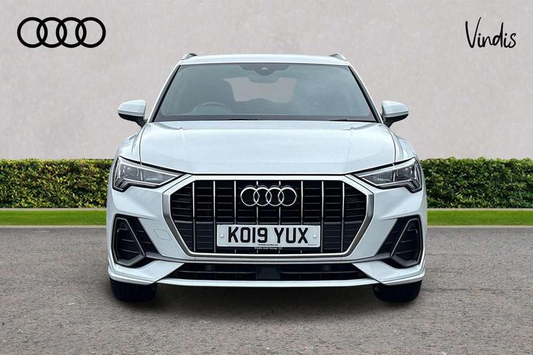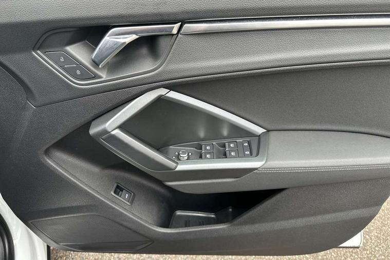 Audi connect safety and service (e-call), Audi drive select, Audi lane departure warning, Audi side assist, Audi smartphone interface, Bluetooth interface, Camera based traffic sign recognition, Cruise control + speed limiter, MMI navigation plus with MMI touch, Power opening/closing tailgate, Progressive steering, Rear parking sensors, Service interval indicator, Stop/start system, Voice control system, Sports suspension, 1 x USB type C and 1 USB type A charging points, 6 speakers, DAB digital radio module, Acoustic windscreen, Aluminium roof rails, Aluminium window trim, Auto dimming rear view mirror, Body coloured bumpers, Diffuser in matt Platinum grey, Electrically adjustable and heated door mirrors with integrated LED side indicators, Front and rear electric windows, Front fog lights, Front side air inlets in matt platinum grey, Front spoiler blade in matt platinum grey, Grille vertical bars in aluminium silver/Matt, High gloss black finish B and C pillars, LED headlights with LED daytime running lights and dynamic rear indicator, LED rear lights, Privacy glass, Rain and light sensors, Rear diffuser strip in matt titanium black, S Line badge on wings, S Line front and rear bumpers, Side skirt insert in matt Platinium grey, Titanium black radiator grille, 12V socket in rear centre console, 40:20:40 split folding rear bench seat, Adjustable rear seat bench/backrest with centre armrest and cupholder, Aluminium door sill trims, Black cloth headlining, Dual zone climate control, Front and rear black floor mats with contrast stitching in rock grey, Front and rear headrests, Front centre armrest with storage compartment and angle adjustment, Illuminated door sill trims with S logo, ISOFIX child seat mounting and Top Tether with front passenger airbag deactivation, Manual front seats with height adjustment, Perforated leather gearknob, Stainless steel luggage compartment sill finisher, Stainless steel pedals, Non smoking pack - Q3, 3x3 point rear seatbelts, 6 airbags - Driver, front passenger, curtain and side windows, Electrically operated child locks on rear doors, Electromechanical parking brake, Electronic stabilisation control including ABS, ASR and EDL, Hill hold assist, Pre sense basic, Seatbelt monitoring, Tyre pressure warning, Warning triangle and first aid kit, Anti theft alarm, Anti theft wheel bolts, Audi pre-sense front with pedestrain and cyclist recognition, Remote central locking, Dark matt brushed aluminium inlay, MMI touch colour display in gloss black with aluminium surround,