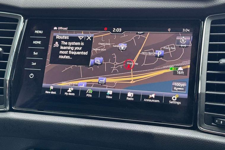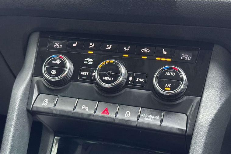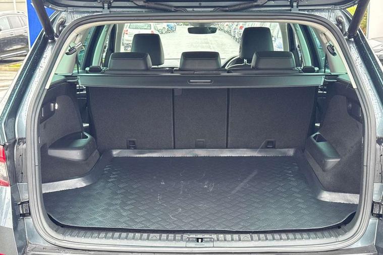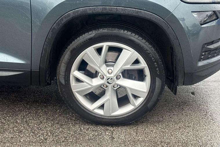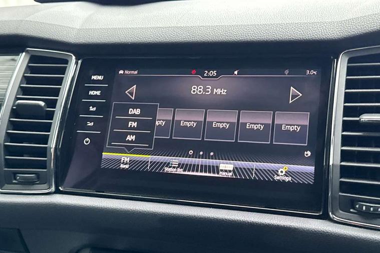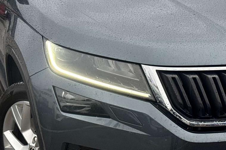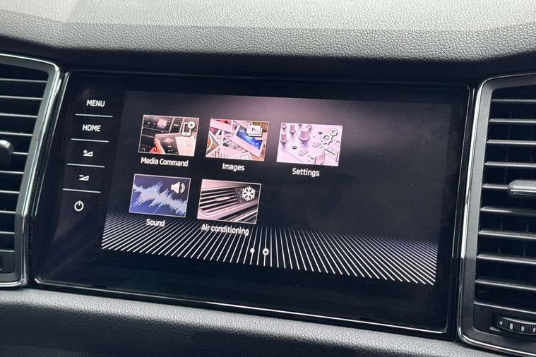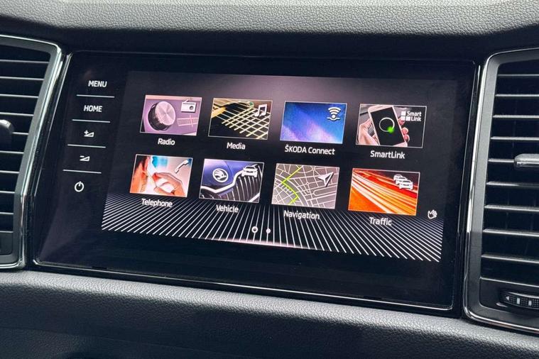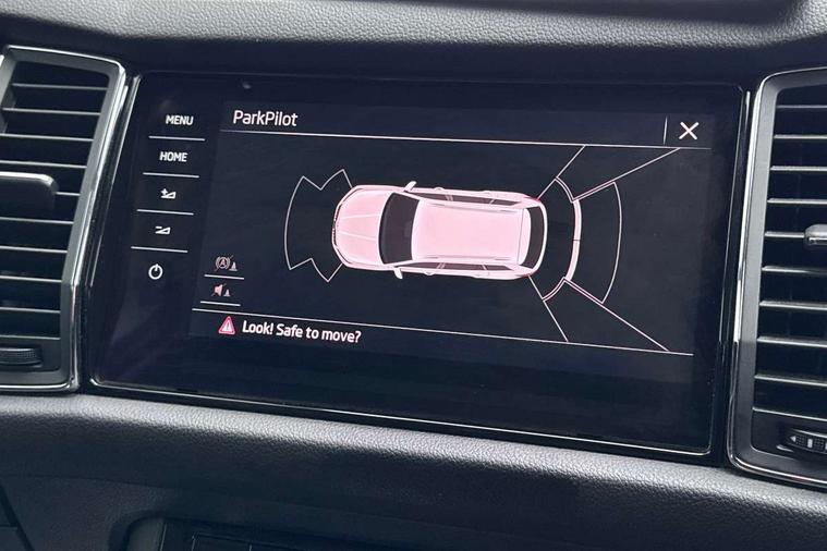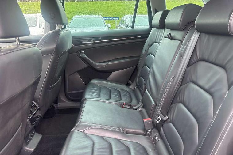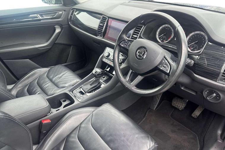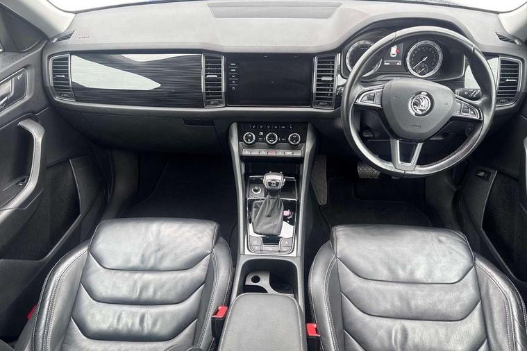 Bluetooth system, Colour maxi dot trip computer, Columbus satellite navigation with 9.2" touch screen and integrated Wi-Fi, Drive mode selector, Exterior temperature gauge, Phone box, Power tailgate, SmartLink, Smartphone wireless charging plate, Speed limiter, Bolero Radio, DAB Digital radio, DVD System, SD card slot, USB connection, Adaptive front lighting system, Aero wiper + intermittent function, Auto dimming door mirrors, Auto dimming rear view mirror, Automatic activation of hazard warning lights, Body colour bumpers, Body colour door mirrors and handles, Electric adjustable/heated/folding door mirrors, Electric front windows, Electric rear windows, Front and Rear door steps, Headlight washers, Heated rear window, High beam assist, High gloss black grille with chrome inserts, LED daytime running lights, LED front fog lights with static cornering light function, LED Headlights, Light assistant (coming home/tunnel light), Rain and light sensors, Rear spoiler, Rear wiper, Silver roof rails, Sunset privacy glass, Tinted windows, 12V Accessory socket in centre console, 12V power point in luggage area, 3 rear height adjustable headrests, 4 lashing points on luggage floor, 60/40 split fold rear seat back, Boot storage compartments, Centre console with storage/cupholders, Chrome gear shift lever, Chrome inner door handles, Driver + front passenger lumbar support, Driver's glovebox with lid, Driver's storage box, Electric front seats with memory function, Folding grab handles with rear coat hooks, Front and rear bottle holders, Front centre armrest with storage compartment, Front/rear courtesy lights, Height adjustable front seats, Height/tilt adjustable front headrests, Illuminated air conditioned glovebox, Illuminated luggage compartment, Isofix system on outer rear seats, Leather upholstery, Luggage compartment cover, Luggage nets in boot, Manually adjustable steering column, Passenger side net compartment on centre console, Pollen filter, Rear centre armrest with cupholders, Removable LED light in boot, Sunglasses storage, Sunvisors with illuminated vanity mirrors, Ticket holder, Chrome pack - Kodiaq, 3 point front/outer rear seatbelts+pre-tensioners, ABS + EDL + ASR + MSR + ESC, Automatic unlocking of doors in case of impact, Driver and passenger airbags, Drivers knee airbag, Electromechanical parking brake, Front assist including city emergency braking, Front side airbags, Fuel cut off safety device, Head airbags, Hill hold control, Hydraulic Brake Assist (HBA), Passenger airbag deactivate switch, Seatbelt warning, Two tone horn, Tyre pressure monitor, Alarm with interior monitoring and tilt sensor, Anti-theft wheel bolts, Immobiliser, Keyless entry and keyless start, Remote central locking,