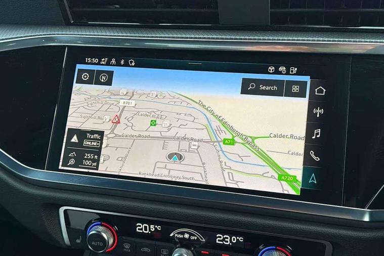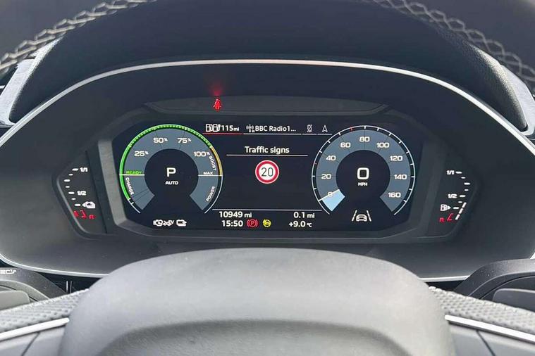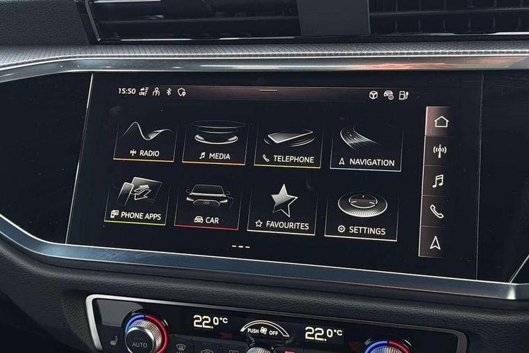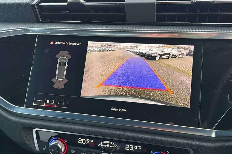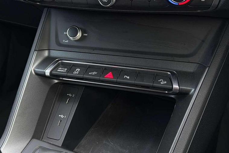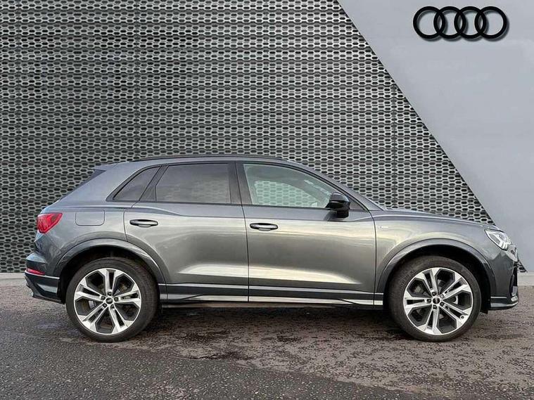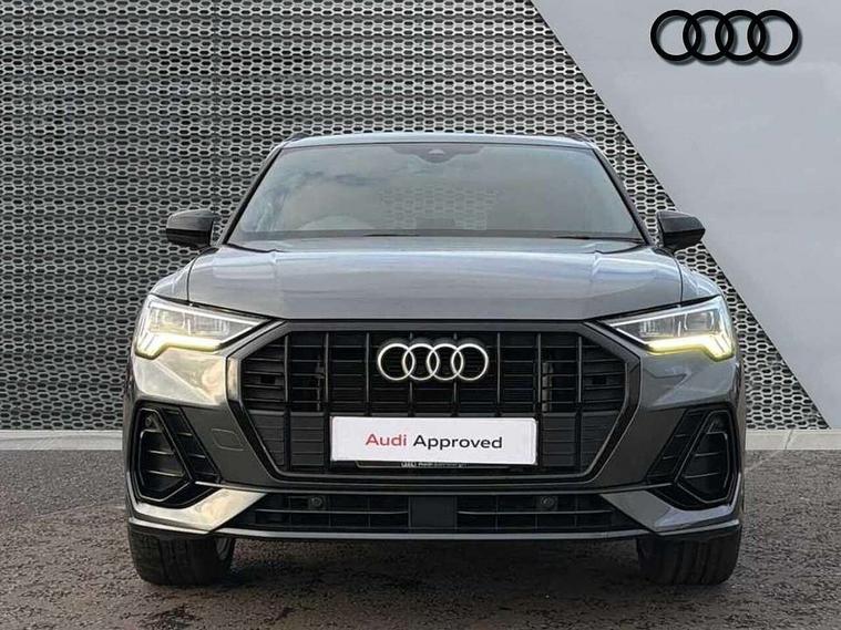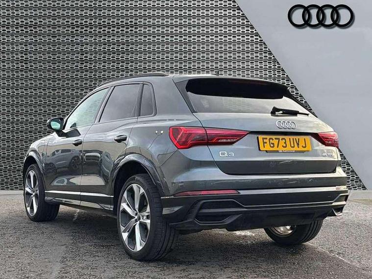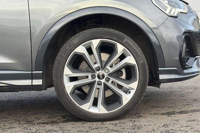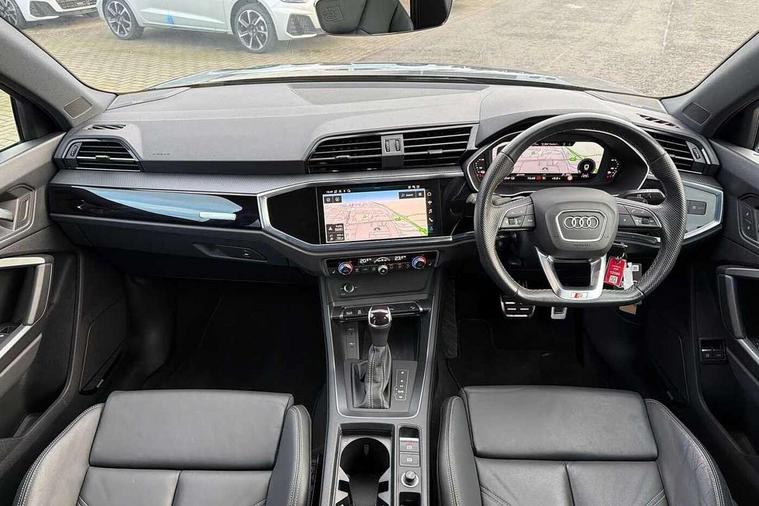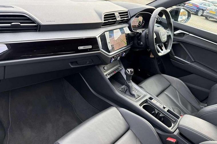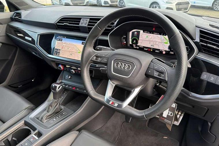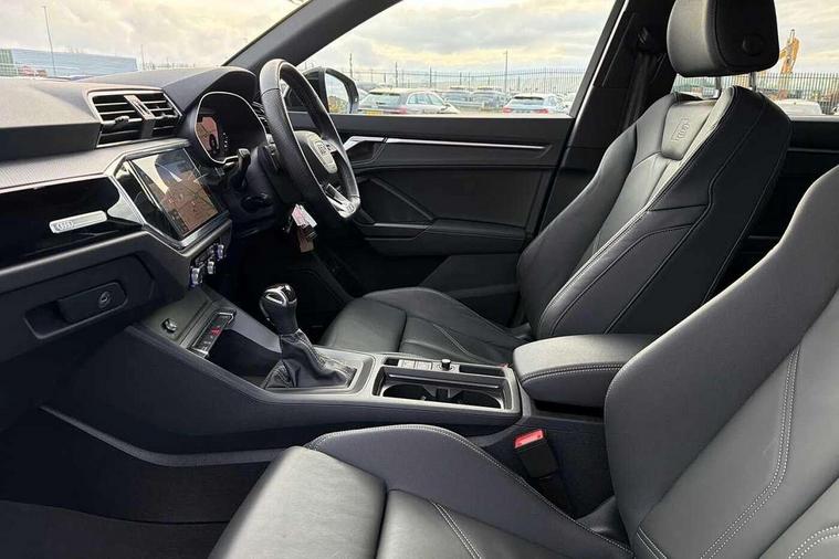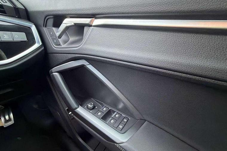 Amazon alexa Integration, Audi drive select, Audi lane departure warning, Audi smartphone interface includes wireless Apple carplay/Android Auto, Audi Virtual Cockpit - 10.25" display, Bluetooth interface, Camera based traffic sign recognition, Legal emergency call, MMI Navigation Plus with high resolution 10.1 inch touchscreen colour display, Power operated tailgate, Progressive steering, Service interval indicator, Start stop system with recuperation, Voice control system with natural language interaction, 3 pin 10 amp domestic charging cable, 3.6 kw On-board charger, Type 2 mode 3 32 amp charging cable, Type 2 socket for AC charging, 2 USB-C ports with charge and data functions, 6 passive loudspeakers, DAB digital radio module, Acoustic windscreen, Auto dimming frameless rear view mirror, Black roof rails, Electrically folding, adjustable and heated door mirrors with integrated LED side indicators and kerb view function for passenger side, Front and rear electric windows, Front fog lights, Grille vertical bars in aluminium silver/Matt, High gloss black finish B and C pillars, LED Dynamic rear indicators, LED headlights with LED daytime running lights, LED rear lights, LED third brake light, Privacy glass dark tinted rear and rear-side windows (from B-pillar backwards), Rain and light sensors, Rear diffuser grille in grained matt black, Rear diffuser strip in matt anthracite black, Rear side wing doors, Rear wiper, S line bumpers in contrasting Manhattan grey, Variable front intermittent wipers, 12V socket in rear centre console, 3 seat bench in 2nd row, 40:20:40 folding with manual adjustment for 60:40 forwards/backwards position and backrest angle, Adjustable rear seat bench/backrest with centre armrest and cupholder, Black cloth headlining, Dual zone electronic climate control, Front and rear black floor mats with contrast stitching in rock grey, Front and rear headrests, Front and rear roof module including reading lights, Front centre armrest, Glove compartment lighting, Height and reach adjustable steering wheel, Illuminated door sill trims with S logo, ISOFIX child seat mounting for front passenger with airbag deactivation and outer rear seat including top tether attachment point for outer rear seats, Luggage compartment light, Manual front seats with height adjustment, Perforated leather gearknob, Single front passenger seat, Stainless steel luggage compartment sill finisher, Stainless steel pedals, Tool kit, Ambient lighting pack - Q3, Black styling pack - Q3, Non smoking pack - Q3, 3x3 point rear seatbelts, 6 airbags - Driver, front passenger, curtain and side windows, Audi pre-sense front with pedestrain and cyclist recognition, Electrically operated child locks on rear doors, Electromechanical parking brake, Electronic stabilisation control including ABS, ASR and EDL, Front seatbelt reminder, Hill descent control, Hill hold assist, Pre sense basic, Seatbelt monitoring, Tyre pressure warning, Warning triangle and first aid kit, Anti theft alarm, Anti theft wheel bolts, Immobiliser, Remote central locking, Aluminium look interior elements, Detail dashboard around MMI touch colour display in glass look, black with surround in aluminium look, Leatherette door armrest, Piano black inlay, 19" 5 twin arm design diamond cut audi sport alloy wheels in matt grey look, Tyre repair kit,