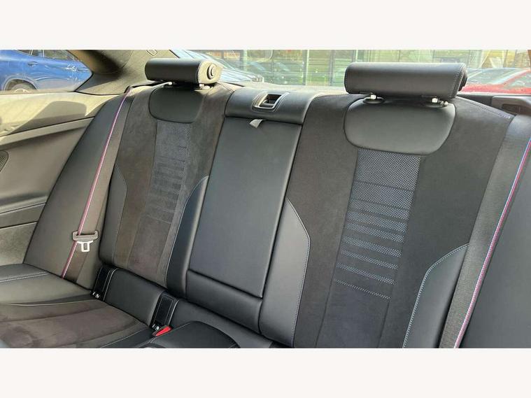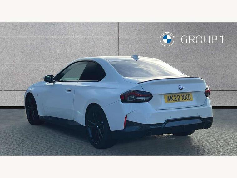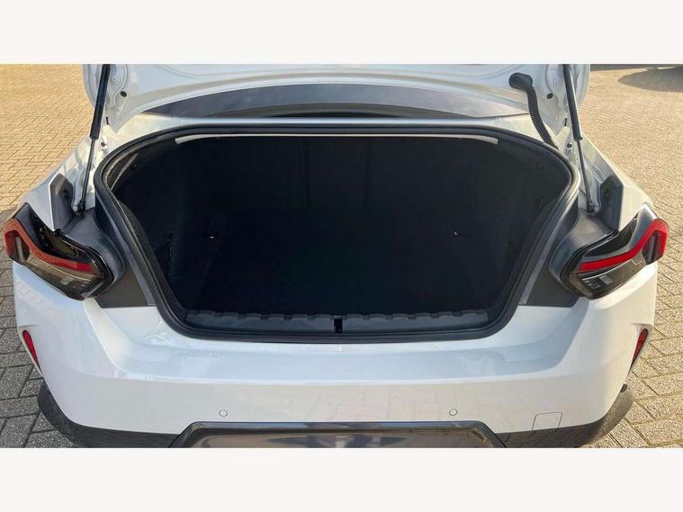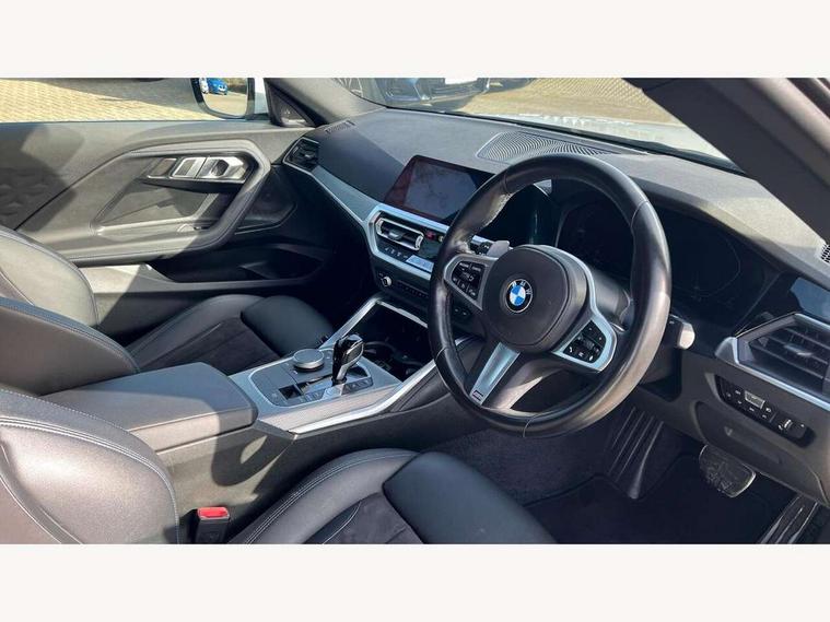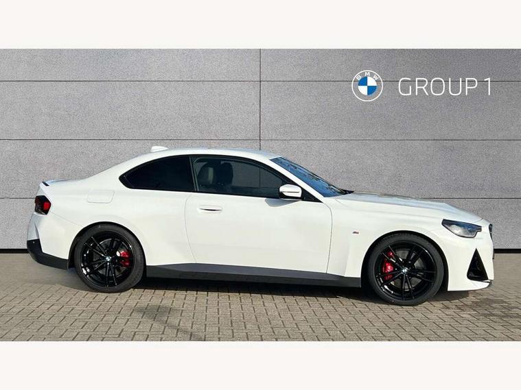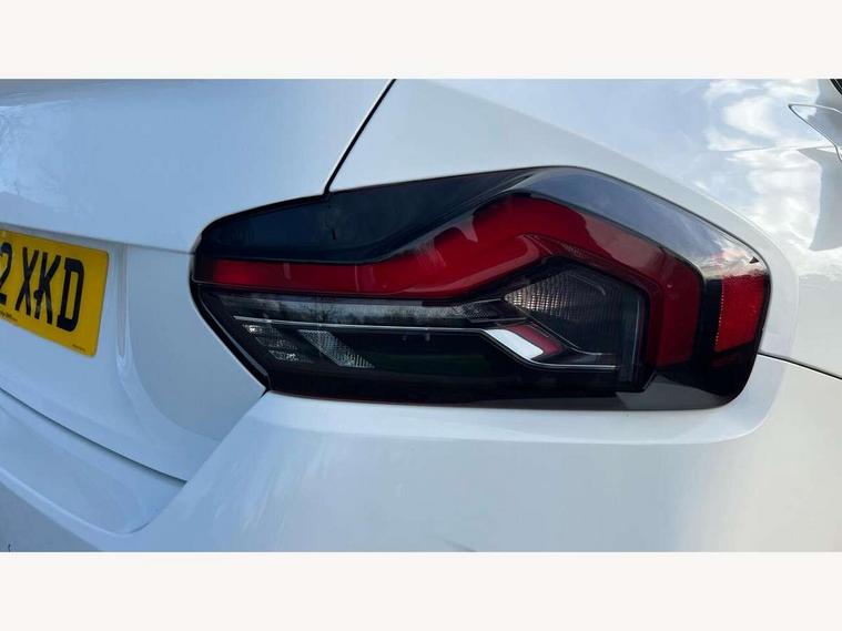 Attentiveness assist, Auto start-stop, Bluetooth, BMW ConnectedDrive online services, BMW Teleservices, Check Control warning system for monitoring of lights and door/luggage compartment open warning, Direct selection buttons, Drive off assistant, Eco pro mode, Electric power steering, Front/rear Parking distance control, iDrive controller with turn and press function, Integrated owners handbook, Intelligent functions, Live cockpit plus with nav function 12.3" instrument cluster and 14.9" centre display, Oil sensor for level and grade, Optimum shift indicator, Personal Profile, Touch operation on control display, Variable sport steering, Widescreen multi-media display, Aluminium lightweight construction, Balancer shaft, BMW TwinPower Turbo four-cylinder petrol engine, Double VANOS, Drive performance control with ECO PRO comfort + sport mode, Electronic differential lock, High precision injection, M sport suspension, Petrol Particulate Filter, Sport automatic steptronic transmission with gearshift paddles, manual gearshift time display, launch control, coasting idle ECO PRO/COMFORT modes, Twin scroll turbocharger with Valvetronic, DAB tuner, Acoustic windscreen wipers for reduced driving noise, Adaptive LED Headlights, Automatic windscreen wipers and automatic headlight, Automatically dimming rear view mirror, Body colour door handles flush with door surface, Body colour door mirrors, Body colour front and rear bumpers, Daytime running lights, Electric windows - front and rear, with open/close fingertip control and trap release, Exhaust tailpipes x2 - 90mm in left and right, Fading support, Front and rear bumper system with replaceable deformation elements, Front door sill finishers in black plastic with BMW designation, Front windscreen wipers with integrated washer jets, Green tinted heat protection glazing, High beam assistant, High gloss shadowline exterior trim in mirror triangle cover, mirror cover panel, mirror bezel and window border, High level third brake light, Indicators integrated int mirror housing, LED registration plate light, LED technology rear tail lights, brake lights and turn indicators, Lightweight engineering, Model designation on right side of tailgate, One piece kidney grille with hight gloss chrome surround, Rear boot, Rear fog lights, Reversing light in rear light cluster, Shark fin antenna, Single part LED rear lights with smoked glass components, Trailer stabilisation logic, Visible VIN plate, 12V power socket in front centre console with blanking plug, 2 cupholders in front centre console, 3 zone automatic air conditioning, Ambient lighting, Compartment in front of cupholder, Conditioned based service, Driver seat backrest width adjustment, Front and rear side armrests integrated into door trim, Front armrest, Front door pockets, Front head restraints, Front sport seats, Heated front seats, Illuminated glove compartment with separate small compartment, M headliner Anthracite, M sport leather steering wheel, Manually adjustment steering wheel column, Rear seat backrest with manual 40:20:40 split folding, Rear seat centre foldable armrest with integrated cup holder, Single front passenger seat, Storage compartment between rear seats, Storage tray and compartment with cover in centre console, Sun visors with vanity mirrors and insert tab, Through loading system with 40/20/40 split folding 2 rear seat in 2nd row, Two folding rear seat headrests, Velour floor mats, Additional storage compartment pack without USB - 2 Series Coupe, Connected pack professional - 2 Series Coupe, Interior and exterior mirror pack - 2 Series Coupe, M Sport exterior styling aerodynamics pack - 2 Series Coupe, 2 tone horn, Anti lock braking system (ABS) with cornering brake control, Automatic Stability Control (ASC), BMW emergency call, Brake drying, Child seat ISOFIX attachment for the two outer rear seats, Crash sensor activating of airbags, Unlocking doors, hazard warning lights, interior light, safety battery terminal, Deactivation of fuel pump in the event of a crash, Driver and front passenger airbags, Driver and front passenger side airbags, integrated in the door side seat backrest bolsters for all seat variants, Dynamic brake control, Dynamic stability control + (DSC+), Dynamic Traction Control - DTC, Electrically operated hand brake including automatic hold function and automatic release when driving off, Front and rear disc brakes, Front passenger airbag deactivation, Head airbags for all 4 outer seats, Manual deactivation of front passenger airbag, Seat belt security check for driver and front passenger, Seatbelt warning, Side impact protection, Three point seat belts on 4 seats including front belt stopper, pyrotechnic belt tensioners and belt force limiters, Tyre pressure sensor, Warning triangle and first aid kit, Alarm system (Thatcham 1) with remote control and electronic engine immobiliser, Central locking switch for all doors, fuel filler cap and luggage compartment, Deadlocking function system to all doors, Drive away locking system on all doors and luggage compartment, Locking wheel bolts, Start/Stop button (illuminated) in centre console with keyless engine start and Auto Start-Stop deactivation button, Two remote control key with integrated key - one button for open and close doors/fuel flap/tailgate and separate button for unlock luggage compartment, BMW mobility tyre sealing system, Electrically powered 12V compressor, Reduced rolling resistance tyres,
