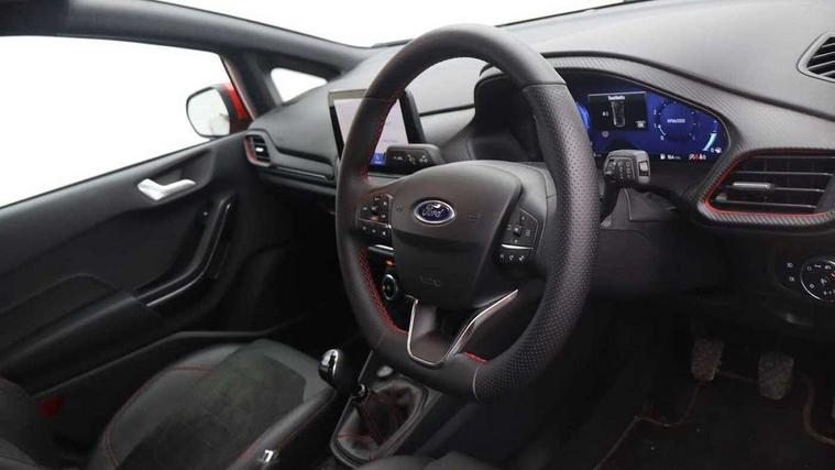 12.3" Full digital cluster, Driver alert system, Electric power steering, Ford easy fuel, Ford SYNC 3 Nav with DAB radio, 8" touch screen, voice control, emergency assist, Apple CarPlay/Android auto, 2x USB, 6 speaker, Ford pass connect, Rear parking distance sensors, Rear view camera, Selectable drive modes (Normal, Sport, Track), Speed sign recognition, Trip computer, Wrong way alert, Sports suspension, Auto high beam, Body colour bumpers, Body colour large rear spoiler, Body coloured electrically operated with side indicators, Electric front windows/one touch facility, Front unique ST scuff plates, LED Night signature to rear lights, LED third brake light, Quickclear heated windscreen, Rain sensing wipers and auto dimming rear view mirror, Rear privacy glass, Rear side wing doors, Rear wiper, Unique ST-Line upper grille & full bodystyling kit with ST-Line wing badges, 3 seat bench in 2nd row, 4 way manually adjustable passenger seat, Adjustable head restraints, Black headlining, Centre console with opening armrest, 2x cupholders, 12v and USB, Drivers and Passenger lumbar support, EATC - Electronic Auto Temperature control, Front floor mats in velour, Leather gaiter, LED ambient lighting, Manual 4-way driver seat adjust, Sensico partial premium leather upholstery with red stitching, Sensico wrapped steering wheel, Single front passenger seat, NCAP Pack - Fiesta, Winter pack [GTBAB]- Fiesta, 3 point seatbelts on all rear seats, Electronic stability control with hill start assist, Manual child lock in rear doors, Tyre pressure monitoring system, Ford keyfree system with Keyless entry and keyless start, MyKey system, Remote central locking, Thatcham alarm with power door dead locks, 18" 5x2 spoke alloys with pearl grey machined finish,
