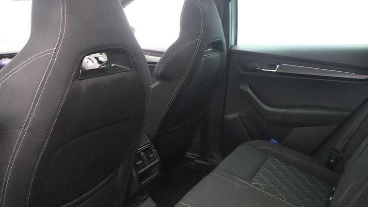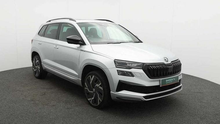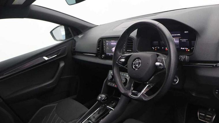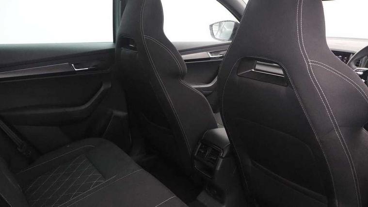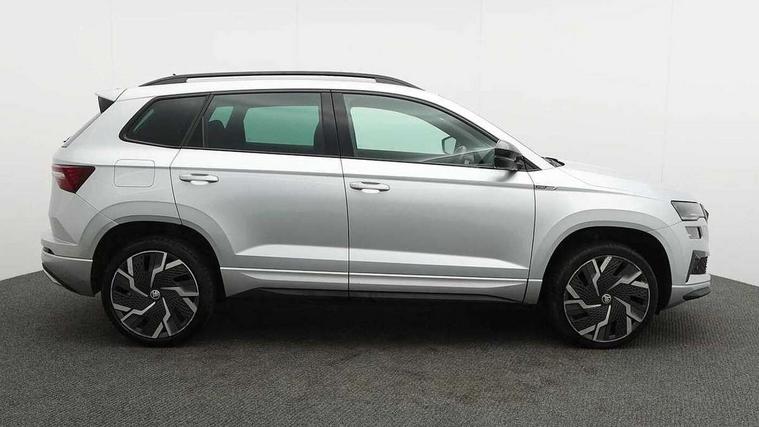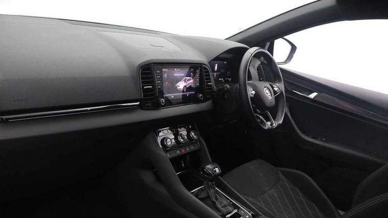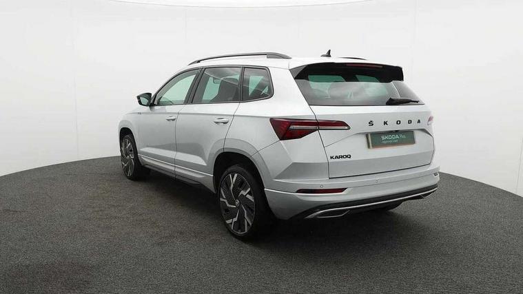 8" Digital display, Care connect, Driver fatigue sensor, Emergency services call system, Outside temperature gauge, Service interval indicator, SmartLink wireless for Apple and wired for Android, Start/stop system with regenerative braking, USB C Port x 2 in front centre console, Virtual cockpit, Virtual pedal with electrically operated boot door, 8 Speakers, DAB radio with Bluetooth, USB connection, Acoustic glass, Aero front windscreen wipers with intermittent function, Auto dimming rear view mirror with light and rain sensors, Black door mirrors, Black electric window control buttons, Black radiator grille, Black roof rails, Body colour door handles, Dynamic headlight range control with cornering light function, Electric front and rear windows with child proof lock, Front door steps with SportLine logo, Heated rear windscreen, LED daytime running lights, LED rear lights with high functionality welcome effect and dynamic indicators, Light assistant (coming/leaving home/tunnel light), Panoramic sliding sunroof, Plastic scuff plates, Privacy glass, Protective door side sills in body colour, Rear diffuser, Rear side wing doors, Rear spoiler, Rear window wiper with washer system and intermittent control, Safety reflectors on front doors, Skoda lettering on tailgate in black, Sportline badge on front fender, Sportline decorative inserts with badging, Sports front and rear bumpers, 1.5 litre bottle holders in driver and front passenger door panels, 12V socket in boot, 12v socket in front centre armrest with storage compartment and rear air vents, 2 Folding hooks and nets in boot, 3 rear height adjustable headrests, 3 seat bench in 2nd row, 3 spoke leather sports multifunction steering wheel and silver stitching with gear shift paddles, 4 foldable roof handles with rear coat hooks, Black floor carpet, Black roof headlining, Chrome inner door handles, Double sided boot floor, Foldable hooks in the boot, Front head restraints, Height adjustable front three point seats belts with tensioners, Height/reach adjust steering wheel, Ice scraper, Illuminated glovebox, Illuminated luggage compartment, Isofix child seat preparation outer rear, Manual lumbar support for front seats, Pen holder, Pollen filter, Rear boot cover, Rear reading lights, Rear seats fixed folding and divided 60:40, Rubbish bin door, Safety vest holder, Single front passenger seat, Storage box in upper central dashboard closed, Sunvisors with illuminated vanity mirrors, Textile floor mats, Ticket holder, Titan black interior ceiling, Welcome animation with sportline logo, Light Pack - Karoq, Parking pack - Karoq, Automatic door unlocking in case of crash, Automatic fuel cut off in case of crash, Child locks on rear doors, Driver airbag, Electronic parking brake with auto hold function, Emergency rear braking signal, ESC including ABS, MSR, ASR, EDS, HBA, DSR, RBS, MKB and traction control, Front side airbags, Hill hold control, Knee airbags, Passenger airbag with switch-off function, Pedestrian monitor, Seatbelt reminder signalisation and pretensioner for all seats, Three point seatbelts rear, Two tone horn, Tyre pressure display, Tyre pressure monitor, Alarm with interior monitoring, back up horn and tilt sensor with safe function, Electronic engine immobiliser, Keyless entry and start/stop, Remote central locking with 2 remote folding keys, Black air vent surround, Black centre console, Satin black dashboard, Satin black door trim, 19" Vega black polished alloy wheels, Anti-theft wheel bolts protection, Matt black aero hub caps, Storage on wheel cover, Tool kit,
