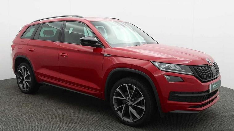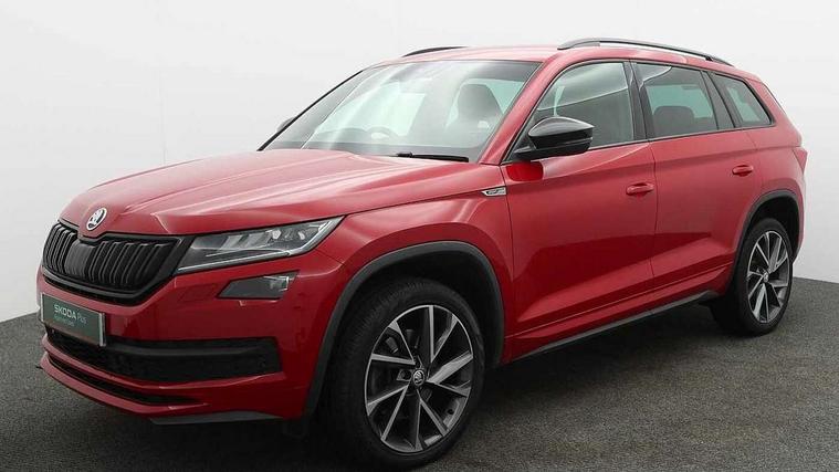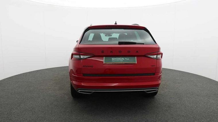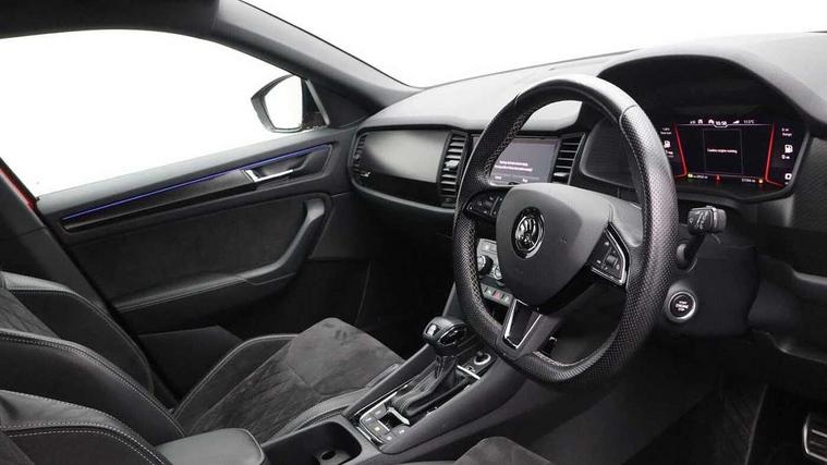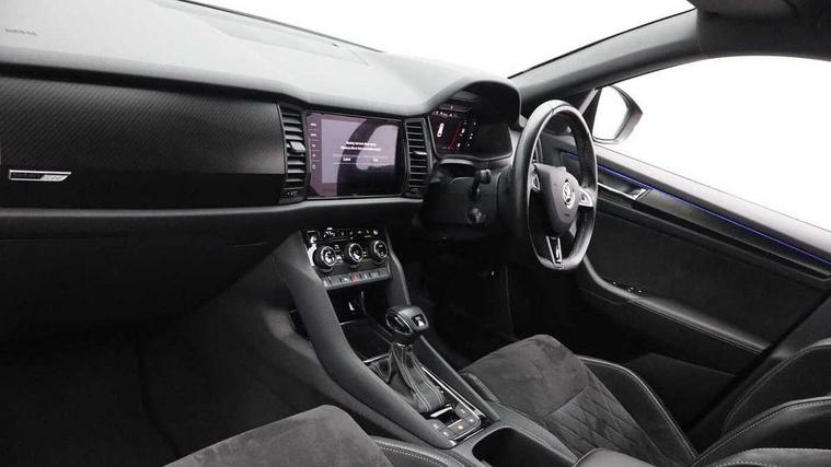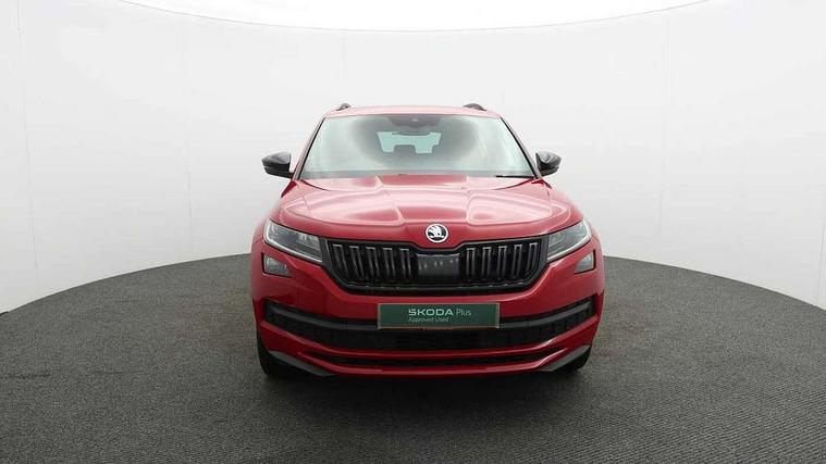 Bluetooth system, Columbus satellite navigation with 9.2" touch screen and integrated Wi-Fi + WLAN and web radio, Digital voice enhancement, ECO Stop/start function, Exterior temperature indicator, Map care, Progressive power assisted steering, SmartLink plus, Speed limiter, Sports dials, Tailgate unlocking from outside, USB C Port x 2 in front centre console, Bolero Radio, DAB Digital radio, DVD System, Aero front windscreen wipers with intermittent function, Aero rear window wiper, Auto dimming rear view mirror, Automatic activation of hazard warning lights, Black electric window control buttons, Black roof rails and door mirrors with radiator grille and window surrounds, Black wheel arch surrounds, Body colour bumpers, Body colour door handles, Chrome exhaust tailpipe, Electric front and rear windows, Electrically adjustable/heated/foldable and auto dimming door mirrors with memory function, Front door steps with SportLine logo, Full LED Headlights with adaptive front light system and LED daytime running lights, Headlight washers, Heated rear window, LED front fog lights with static cornering light function, LED rear fog light, LED third brake light in rear spoiler, Light assistant (coming home/tunnel light), Rain and light sensors, Rear diffuser, Rear spoiler, Safety reflectors on front and rear doors, Sportline badge on front fender, Sports front and rear bumpers, Sunset privacy glass, Tailgate lettering in Black, Without engine designation, 12V socket in boot, 2 rails with 2 hooks including 4 hooks for net programme, 3 spoke leather sports heated multi-function steering wheel with hands off detection, 4 foldable roof handles with rear coat hooks, 4 lashing points on luggage floor, 60:40 foldable rear seat with sliding adjustment and backrest angle adjustment, Alcantara door panels, Alcantara/Leather upholstery with Sport seats with silver stitching, Aluminium pedals, Black roof headlining, Bottle holders in door panel in the 1.5 litre front and 1 litre rear, Cargo storage compartments, Centre console with open storage box, cup holder and 12V socket, Chrome headlight control button, Chrome interior door handles, Coat hooks on B pillar, Covered storage compartment on driver side, Front and rear door armrest with black adductor trim, Front and rear height adjustable headrests, Front centre armrest with storage compartment, cup holder and 12V socket, Front courtesy lights, Gear shift lever with chrome frame and black gloss insert, Illuminated and cooled glovebox, Illuminated luggage compartment, Isofix child seat fittings in outer rear seats with top tether, Manually adjustable steering column, Net programme in boot (1x horizontal Net, 2x vertical Nets), Overhead glasses storage compartment, Paddles on steering wheel for DSG gearbox, Pollen filter, Rear centre armrest with cupholders, Roll up luggage compartment cover with intermediate position, Small Bags on the inner sides of the front backrests, Storage compartment in lower middle instrument panel with closing, Three rear height adjustable headrests, Ticket holder on A Pillar, Umbrella in door panel, LED Interior Light pack - Kodiaq Scout/Sport Line/VRS/Laurin + Klement, Auto door release and activation of warning lights in the event of an accident, Driver and passenger airbags, Electronic parking brake with hill hold control, Emergency rear braking signal, ESC (incl. ABS+MSR+ASR+EDS+HBA+DSR+RBS+MKB), Front and rear three point safety belt on all seats, Front assist includes AEB city/urban, Front passenger airbag deactivation switch, Front side airbags, Fuel cut off safety device, Head and knee airbags, Rear disc brakes, Safety vest holder in door, Seat belt reminder for all seats, Two tone horn, Tyre pressure monitor, Warning lights in front doors, Alarm with interior monitoring and tilt sensor with safe function, Immobiliser, Keyless entry and start system (KESSY), Remote central locking, Carbon finish dashboard and door inserts, Chrome air vent surrounds, 20" Vega Anthracite alloy wheels with anti-theft wheel bolts,