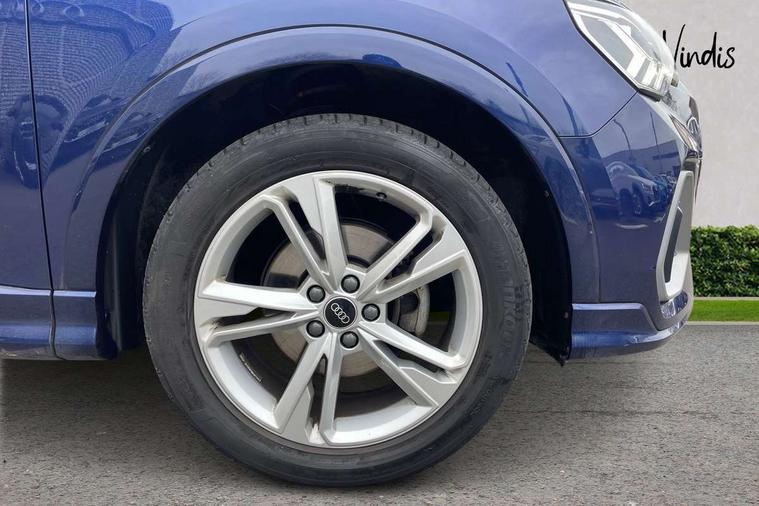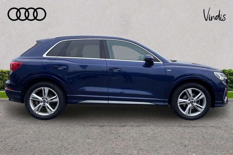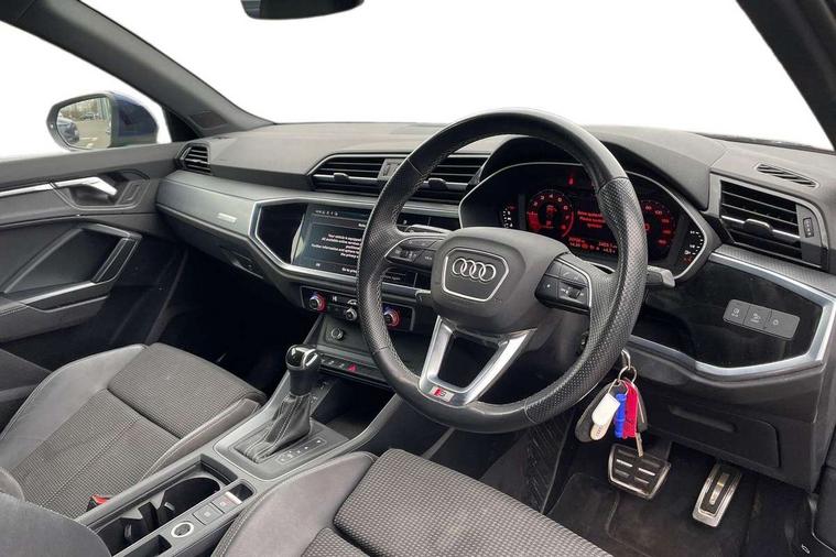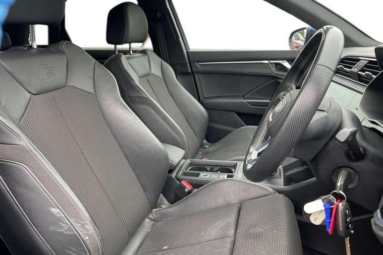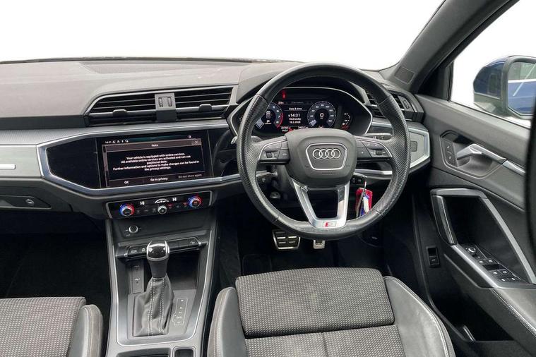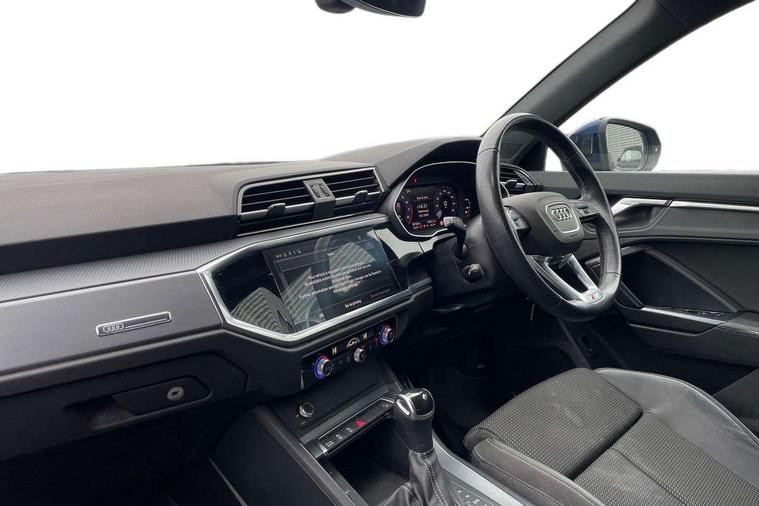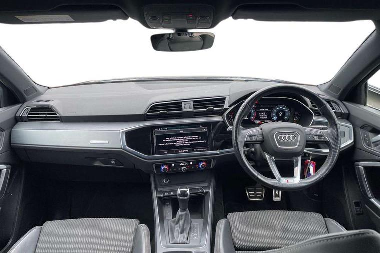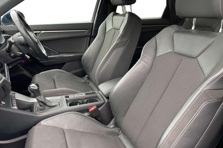 Audi connect safety and service (e-call), Audi drive select, Audi lane departure warning, Audi Virtual Cockpit - 10.25" display, Bluetooth interface, Camera based traffic sign recognition, MMI Navigation Plus with high resolution 10.1 inch touchscreen colour display, Power operated tailgate, Progressive steering, Service interval indicator, Smartphone interface includes wireless Apple carplay/Android Auto, Start stop system with recuperation, Voice control system with natural language interaction, 48V Mild hybrid technology, Sports suspension, 2 USB-C ports with charge and data functions, 6 passive loudspeakers, DAB digital radio module, Acoustic windscreen, Aluminium roof rails, Aluminium window trim, Auto dimming frameless rear view mirror, Body coloured bumpers, Electrically folding, adjustable and heated door mirrors with integrated LED side indicators and kerb view function for passenger side, Front and rear electric windows, Front fog lights, Front side air inlets in matt platinum grey, Front spoiler blade in matt platinum grey, Grille vertical bars in aluminium silver/Matt, High gloss black finish B and C pillars, LED headlights with LED daytime running lights and dynamic rear indicator, LED rear lights, Privacy glass dark tinted rear and rear-side windows (from B-pillar backwards), Rain and light sensors, Rear diffuser strip in matt titanium black, S line badges on front wings, S Line front and rear bumpers, Side skirt insert in matt Platinium grey, Silver chrome grille surround, Titanium black radiator grille, 12V socket in rear centre console, 40:20:40 folding with manual adjustment for 60:40 forwards/backwards position and backrest angle, Adjustable rear seat bench/backrest with centre armrest and cupholder, Black cloth headlining, Dual zone electronic climate control, Front and rear black floor mats with contrast stitching in rock grey, Front and rear headrests, Front and rear roof module including reading lights, Front centre armrest, Glove compartment lighting, Height and reach adjustable steering wheel, Illuminated door sill trims with S logo, ISOFIX child seat mounting for front passenger with airbag deactivation and outer rear seat including top tether attachment point for outer rear seats, Luggage compartment light, Manual front seats with height adjustment, Perforated leather gearknob, Stainless steel luggage compartment sill finisher, Stainless steel pedals, Non smoking pack - Q3, 3x3 point rear seatbelts, 6 airbags - Driver, front passenger, curtain and side windows, Audi pre-sense front with pedestrain and cyclist recognition, Electrically operated child locks on rear doors, Electromechanical parking brake, Electronic stabilisation control including ABS, ASR and EDL, Hill descent control, Hill hold assist, Pre sense basic, Seatbelt monitoring, Tyre pressure warning, Warning triangle and first aid kit, Anti theft alarm, Anti theft wheel bolts, Remote central locking, Dark matt brushed aluminium inlay, Detail dashboard around MMI touch colour display in glass look, black with surround in aluminium look, Leatherette door armrest, Tool kit, Tyre repair kit,