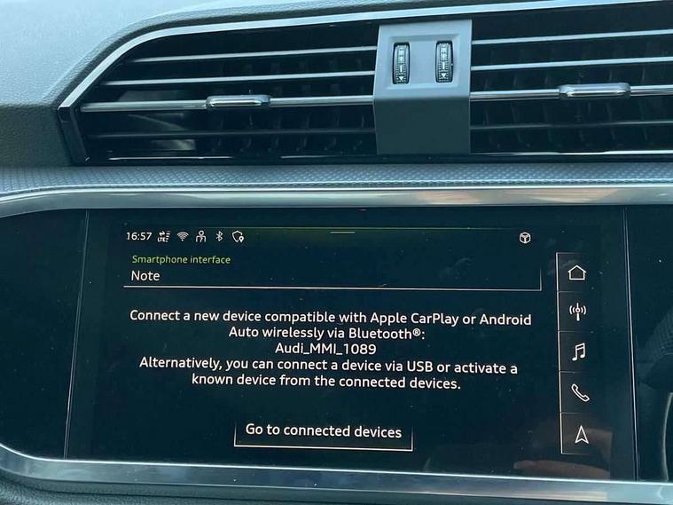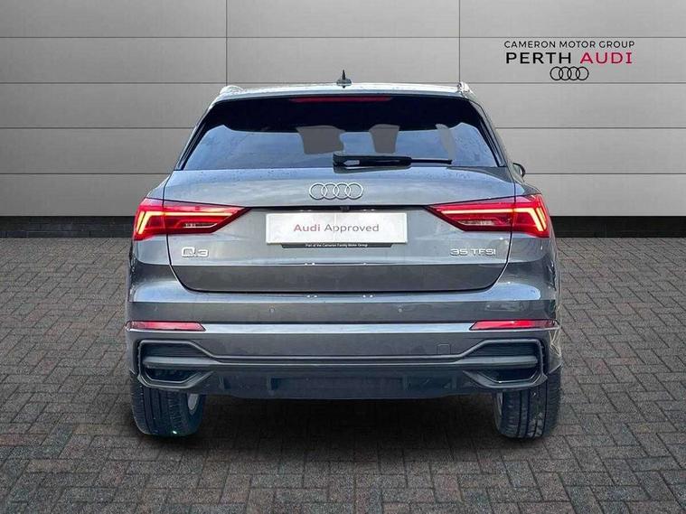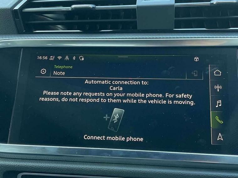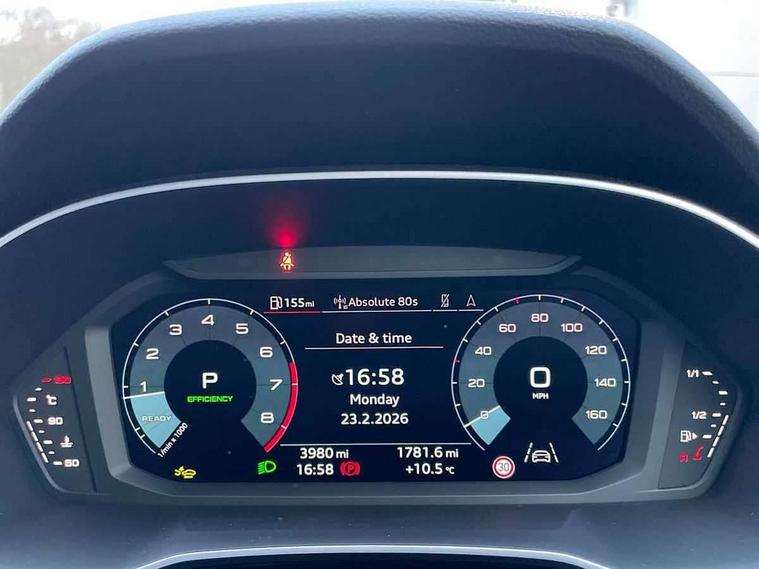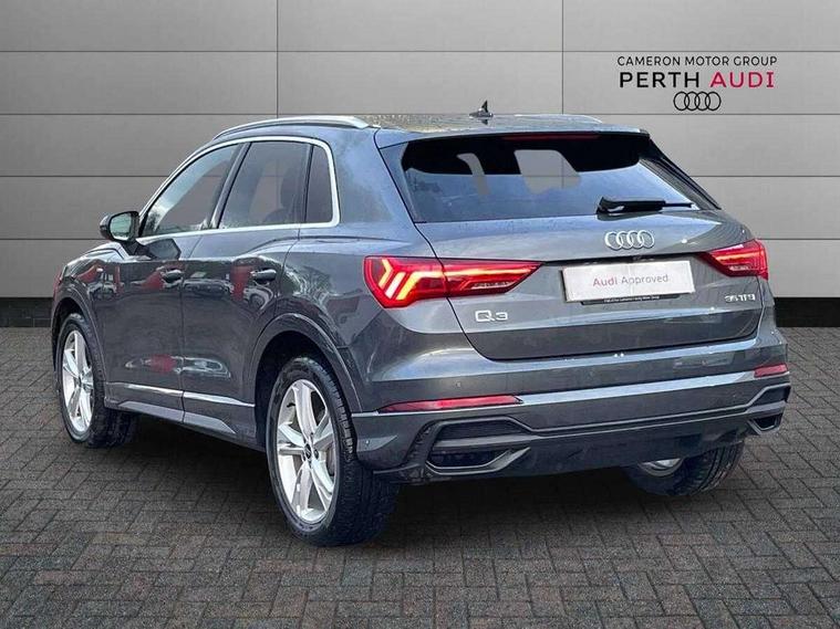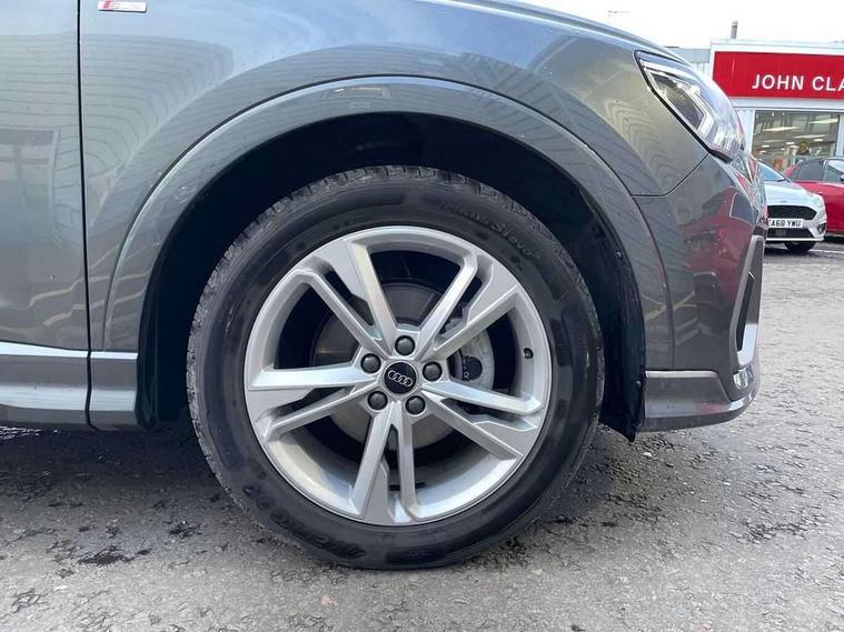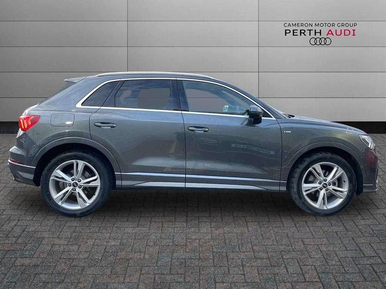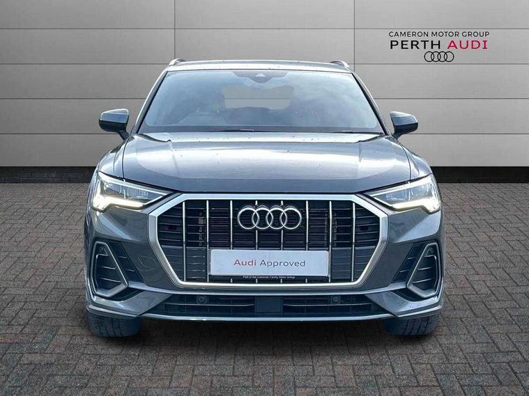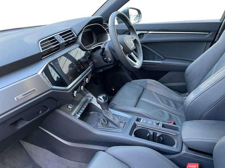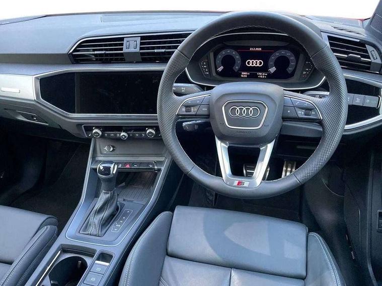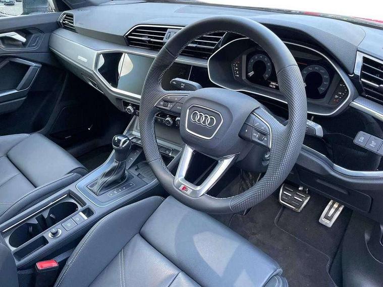 Amazon alexa Integration, Audi connect safety and service, Audi drive select, Audi lane departure warning, Audi Virtual Cockpit - 10.25" display, Bluetooth interface, Camera based traffic sign recognition, Distraction and Fatigue warning, Legal emergency call, MMI Navigation Plus with high resolution 10.1 inch touchscreen colour display, Power operated tailgate, Progressive steering, Service interval indicator, Smartphone interface includes wireless Apple carplay/Android Auto, Start stop system with recuperation, Voice control system with natural language interaction, Sports suspension, 2 USB-C ports with charge and data functions, 6 passive loudspeakers, DAB digital radio module, Acoustic windscreen, Aluminium roof rails, Aluminium window trim, Anthracite black radiator grille, Auto dimming door mirrors, Auto dimming frameless rear view mirror, Body colour front spoiler blade, Electrically folding, adjustable and heated door mirrors with integrated LED side indicators and kerb view function for passenger side, Front and rear electric windows, Front fog lights, Front side air inlets in matt platinum grey, Grille vertical bars in aluminium silver/Matt, High gloss black finish B and C pillars, LED Dynamic rear indicators, LED headlights with LED daytime running lights, LED rear lights, LED third brake light, Privacy glass dark tinted rear and rear-side windows (from B-pillar backwards), Rain and light sensors, Rear diffuser grille in grained matt black, Rear diffuser strip in matt anthracite black, Rear side wing doors, Rear wiper, S line badges on front wings, S Line front and rear bumpers and side skirts, Side skirt insert in matt Platinium grey, Variable front intermittent wipers, 12V socket in rear centre console, 3 seat bench in 2nd row, 3 spoke leather multifunction steering wheel features S badging and grips in perforated leather with contrast stitching, 40:20:40 folding with manual adjustment for 60:40 forwards/backwards position and backrest angle, Adjustable rear seat bench/backrest with centre armrest and cupholder, Black carpet mats, Black cloth headlining, Dual zone electronic climate control, Electric lumbar support, Front and rear black floor mats with contrast stitching in rock grey, Front and rear headrests, Front centre armrest, Height and reach adjustable steering wheel, Horizontal trim strip in matt platinum grey, Illuminated door sill trims with S logo, ISOFIX child seat mounting for front passenger with airbag deactivation and outer rear seat including top tether attachment point for outer rear seats, Luggage compartment sill protection in stainless steel, Manual front seats with height adjustment, Perforated leather gearknob, Single front passenger seat, Stainless steel pedals, Twin leather upholstery with front sport seats + S embossing, Non smoking pack - Q3, 3x3 point rear seatbelts, 6 airbags - Driver, front passenger, curtain and side windows, Audi pre-sense front with pedestrain and cyclist recognition, Electrically operated child locks on rear doors, Electromechanical parking brake, Electronic stabilisation control including ABS, ASR and EDL, Front seatbelt reminder, Hill descent control, Hill hold assist, Pre sense basic, Seatbelt monitoring, Tyre pressure warning, Warning triangle and first aid kit, Anti theft wheel bolts, Immobiliser, Remote central locking, Thatcham approved category 1 anti theft alarm, Aluminium look interior elements, Dark matt brushed aluminium inlay, Detail dashboard around MMI touch colour display in glass look, black with surround in aluminium look, Leatherette door armrest,