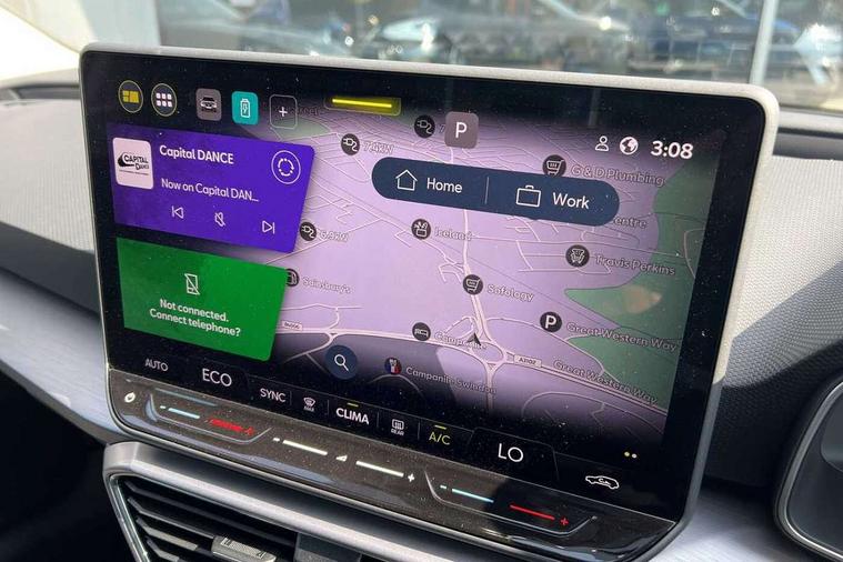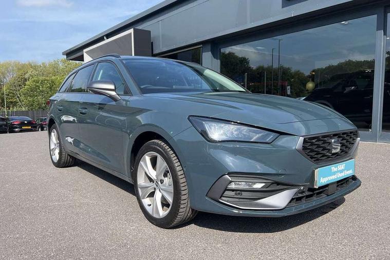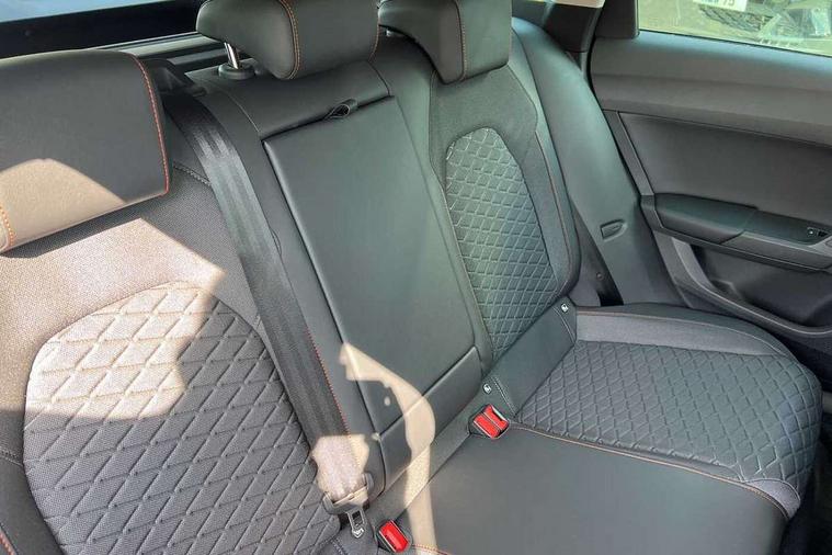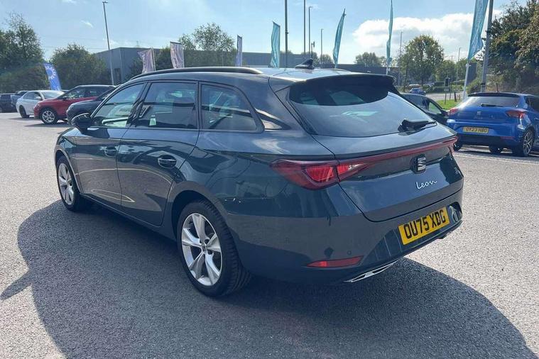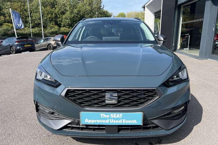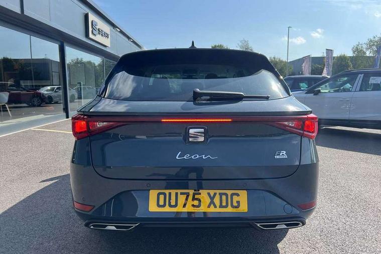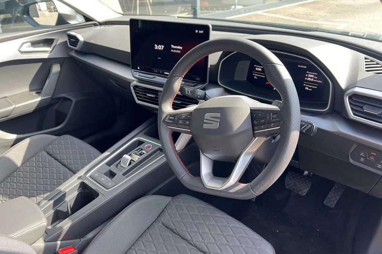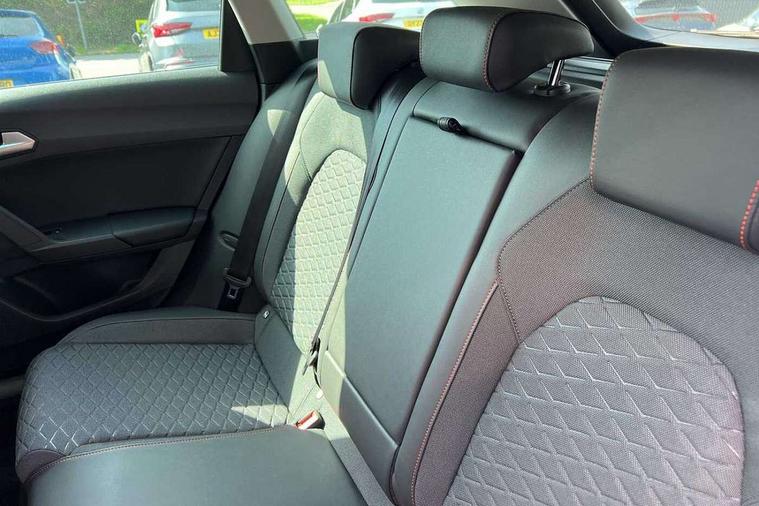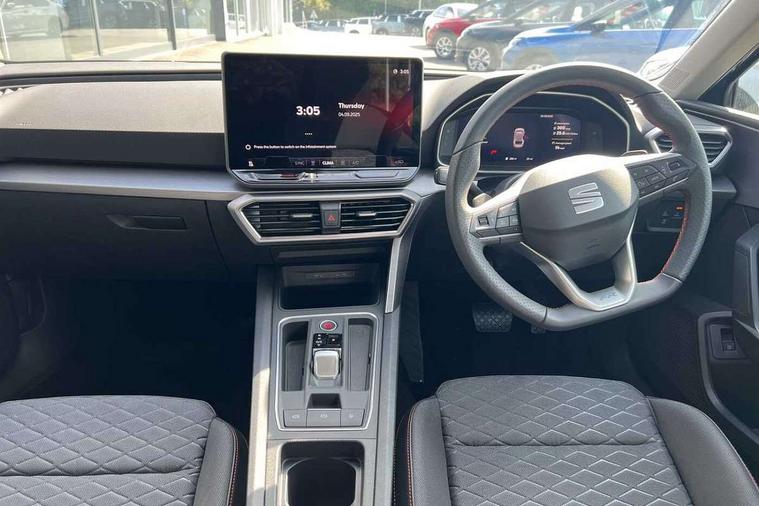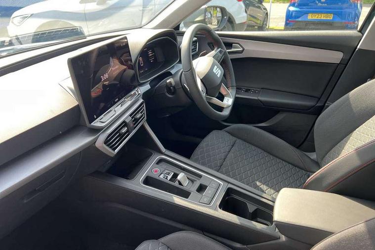 Digital cockpit with multifunction display, Driver attention alert with drowsiness warning, E-call, Front assist with forward collision warning braking reaction to vehicles, pedestrians and cyclists, Full link smartphone integration with Mirror Link, wireless Apple CarPlay and wired Google Android Auto, Intelligent speed assist, Lane assist, Lockable tailgate, Park assist (inc front/rear parking sensors), Power assisted speed sensitive electro-mechanical steering, Rear view camera, RPM, trip computer, outside temp gauge, instrument light brightness, low fuel warning light, lights on reminder, gearshift indicator, SEAT drive profile with 4 modes (Eco/Normal/Sport/Individual), throttle response and gearshift mode, Service interval indicator, Start/stop system with regenerative braking, 10 amp mode 2 charging cable, 16 amp mode 3 charging cable, XDS electronic differential lock and dynamic traction support, 2 front and 2 rear USB-C ports, Auxiliary input socket, Auto dimming rear view mirror, Black roof rails, Body colour door handles, Body coloured bumpers, Cosmo grey exterior mirrors with integrated LED indicators, Dark tinted rear windows, Dynamic headlight range control, Dynamic turn signal lights, Electric front/rear windows, Electrically adjustable, heated and folding door mirrors, FR sports bumper, Illuminated front door sill, LED front fog lamps, LED headlights and LED infinite rear tail lights, LED rear fog lamp with rear coast to coast light, Rear side wing doors, Rear wash/wipe, Separate daytime running light with automatic headlight control and coming home feature, Third brake light, Welcome light silhouette from exterior mirrors, Windshield wiper intermittent control with light/rain sensor, 12v power point in centre console, 3 seat bench in 2nd row, 60/40 split rear bench seat with armrest, Ambient lighting with glovebox, footwell and single monocolour, Driver/passenger manual seat height adjustment, Dust/pollen filter, Front and rear height adjustable headrests, Front and rear reading lights X 4, Front centre armrest, Front seatback storage pockets, Grey headlining, Height/reach adjust steering wheel, ISOFIX points in outer rear seats with top tether anchorage points, Luggage tie-down hooks, Lumbar adjustment for front seats, Single front passenger seat, Sliding boot cover, Sunvisors with covered illuminated mirror, Three zone climate control, Two tone cloth upholstery, Media system plus with navigation - Leon, 3 point seatbelts on all rear seats, ABS, Brake control system - ESC and brake booster, Child proof door locks, Driver and front passenger airbags with front passenger airbag de-activation, front side and curtain airbags, Electronic parking brake, Extended safety system - seat belt tensioner, window closure and hazard lights, Hill hold control, Rear disc brakes, Seat belt reminder for front and rear seats, Tyre pressure monitoring system, Anti theft alarm system with interior monitoring in cab, backup horn and towing protection, KESSY Go (Keyless start), Locking wheel bolts, Wireless phone charging, Chrome interior detailing, 17" Dynamic Bi-spoke alloy wheels with 91W tyres, Emergency tyre repair kit, Tool kit without jack,