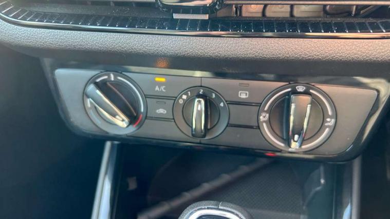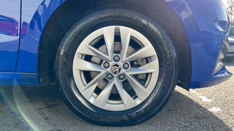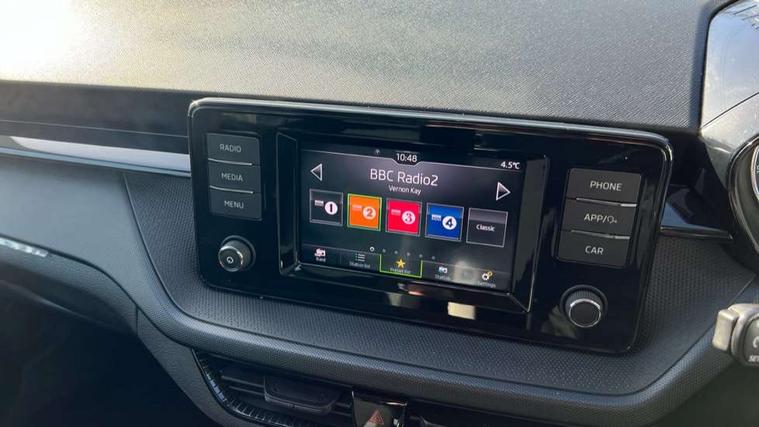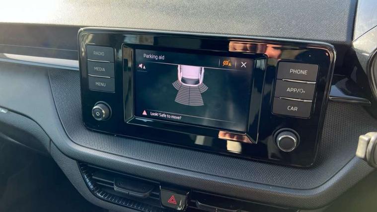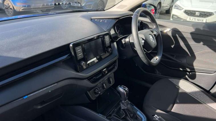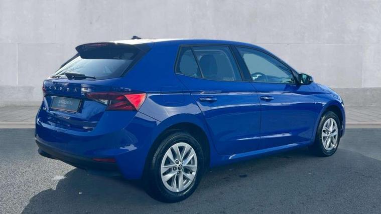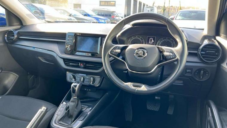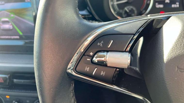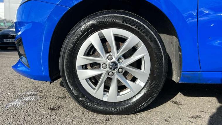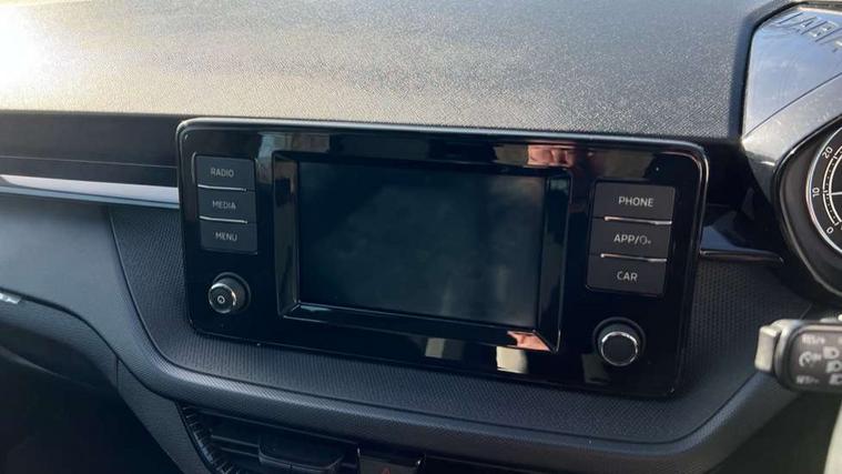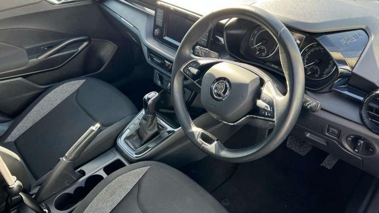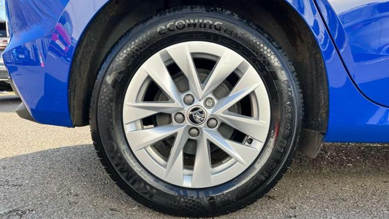 Bluetooth connection, Driver alert system - DAS, Electromechanical power steering, Exterior temperature gauge, Lane assist including road edge detection, Multifunction trip computer in black and white, Rear parking sensors, Service interval indicator, Speed limiter, 2x USB-C in the front (for data transmission and charging), 4 speakers in front, Auxiliary socket for external MP3 player, DAB digital radio reception, Radio Swing with 6.5" colour display, Basic LED Headlights, Basic rear lights, Body colour door mirrors, Body coloured bumpers, Dimming rear view mirror with black frame, Door mirror integrated indicators, Electrically adjustable and heated door mirrors, Electrically adjustable front windows with function auto up/down, Front fog lights, Front window wiper intermittent control, Headlight range control - Automatic, Ice scraper in fuel cap, LED daytime running lights with coming and leaving home feature, Mechanical adjustable rear windows, Rain sensor, Rear LED fog light, Rear side wing doors, Rear window wiper with washing nozzles, Roof mounted spoiler, SKODA tailgate lettering in chrome, Third brake light, 2 reading lights in front and 2 reading lights in rear, 2 spoke leather multifunction steering wheel, 3 rear headrests, Backrest split and folding, Central console with fixed cup holder and storage box, Chrome handbrake release button, Fabric upholstery, Gearshift knob/handle in leather, Grain satin black interior door handles, Hand brake lever handle in leather, Height adjustable front headrests, Height adjustable front seats, Height adjustable steering wheel, ISOFIX and TopTether anchorage points to the outer rear seats, ISOFIX and TopTether on the front passenger seat, Luggage compartment lighting, Manual air conditioning, Manually adjustable lumbar support in front seats, Pollen filter, Rear seat bench unsplit, Single front passenger seat, Storm grey headlining, Sun visors with mirror and airbag label on passenger side, Ticket holder, 3-point height adjustable front seats belts with pretensioner and force limiter, Automatic warning lights in case of crash, Driver and passengers airbag with switch off function, e-Call+, ESC including ABS, MSR, ASR, EDS, HBA and XDS, Front and rear seat belt warning, FRONT ASSIST (AEB City and AEB Inter Urban), Front side airbags, Head airbags, Hill hold assist, One tone horn, Pedestrian protection, Three rear 3-points safety seat belts with pretensioner and force limiter including stop function for outer rear seat belts, Tyre pressure monitoring system, Anti-theft alarm system including immobiliser, interior monitoring, backup horn, and towing protection, Central locking with radio remote control, interior controls, SAFE function and 2 foldable keys, Black painted air vents, Glossy black decorative trim, Grain satin black central console cover, Grain satin black lower decorative trim, Satin black door and side trim panel in front, Anti-theft wheel bolts protection, Super-low rolling resistance tyres,