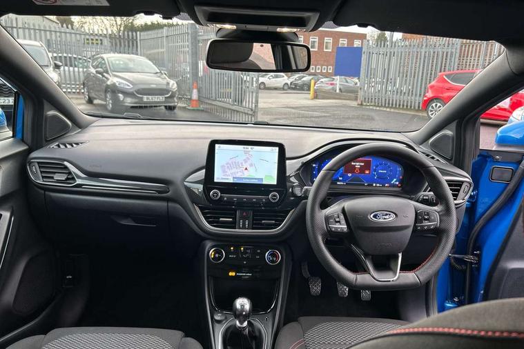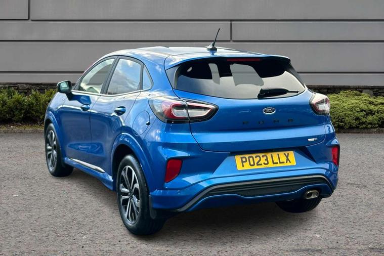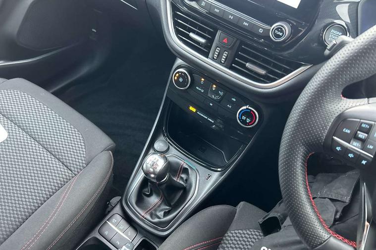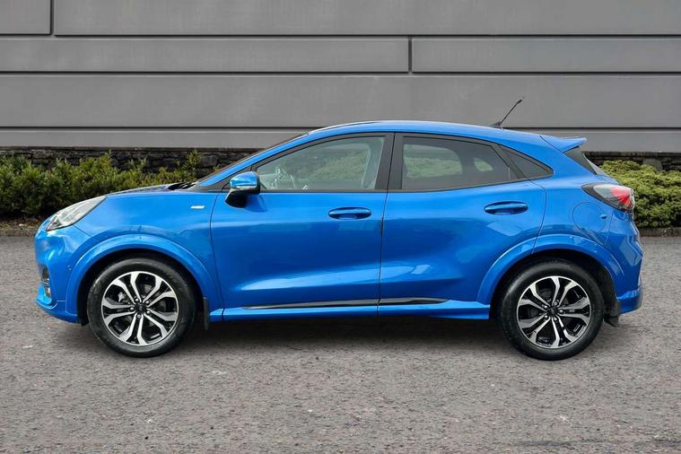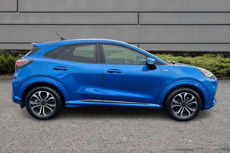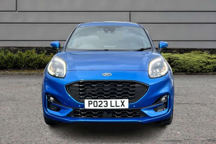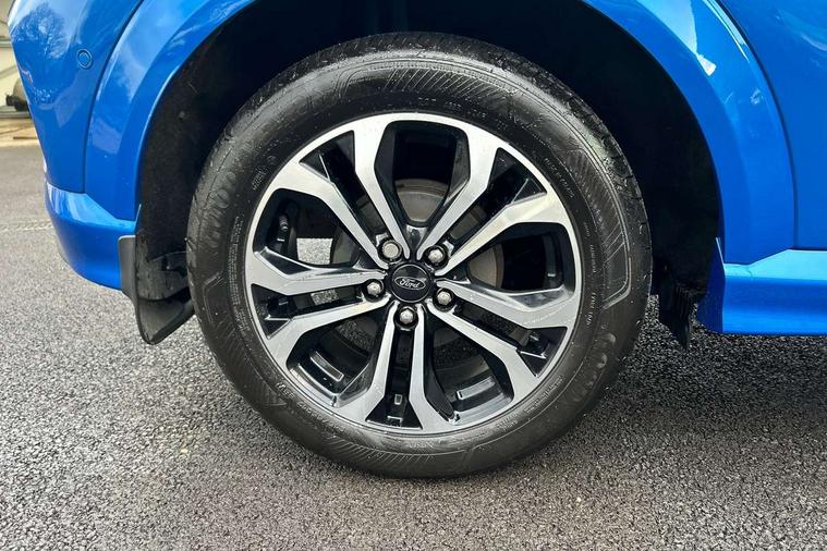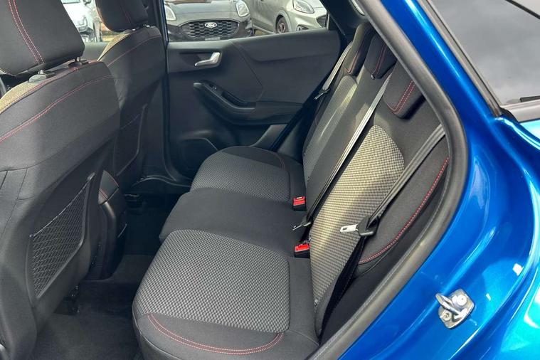 Driver impairment monitor, Emergency call service, Ford easy fuel, Full digital 12.3" instrument cluster, Lane keeping aid with lane departure warning, Power assist steering, Power start button, Rear parking sensor, Selectable drive modes(Normal, Eco, Sport, Slippery and Trail), Speed sign recognition, Sport suspension, Automatic headlights with auto high beam, Automatic rain sensing wipers, LED rear lamps, Power foldable heated door mirrors with puddle lamps, Projector headlamps with LED day time running lights and front fog lamps, Quickclear heated windscreen, Rear side wing doors, Rear wiper, ST-Line body styling kit with unique grille and large body colour rear spoiler, Third brake light, 3 seat bench in 2nd row, Centre console with armrest and stowage, Ford megabox extended bootspace, Front and rear head restraints, Front floor mats, Manual 2 way passenger seat adjustment, Manual 4 way driver seat adjust with lumbar adjustment, Single front passenger seat, ST- Line cloth trim with red stitching, ST-Line flat bottomed sensico leather steering wheel with leather handbrake and aluminium gear knob, Ford SYNC 3 navigation pack - Puma, 3 rear seatbelts, Child safety lock, Electronic stability control (ESC) and hill start assist, Pedestrian/cyclist detection & post-collision braking, Pre collision assist system, Tyre pressure monitoring system (TPMS), Thatcham alarm,