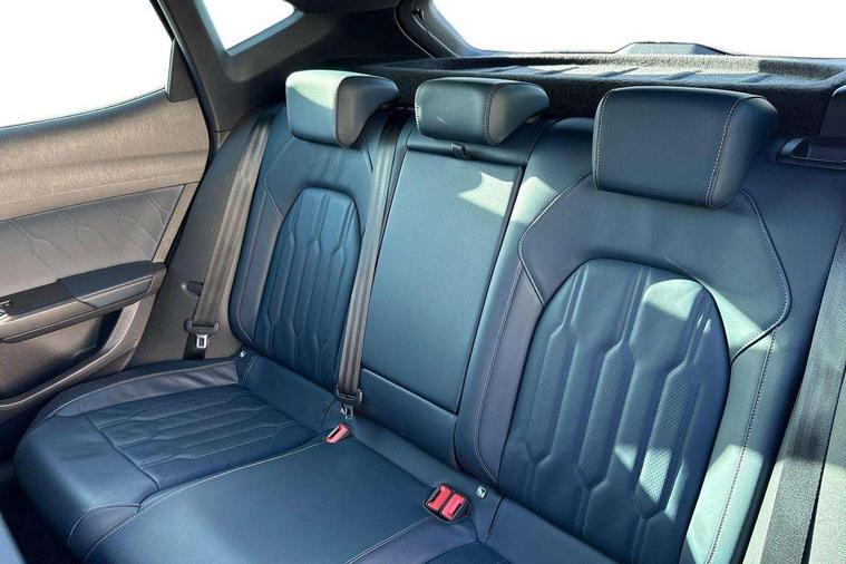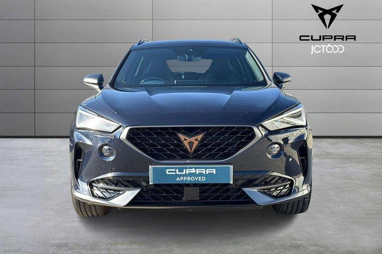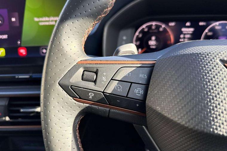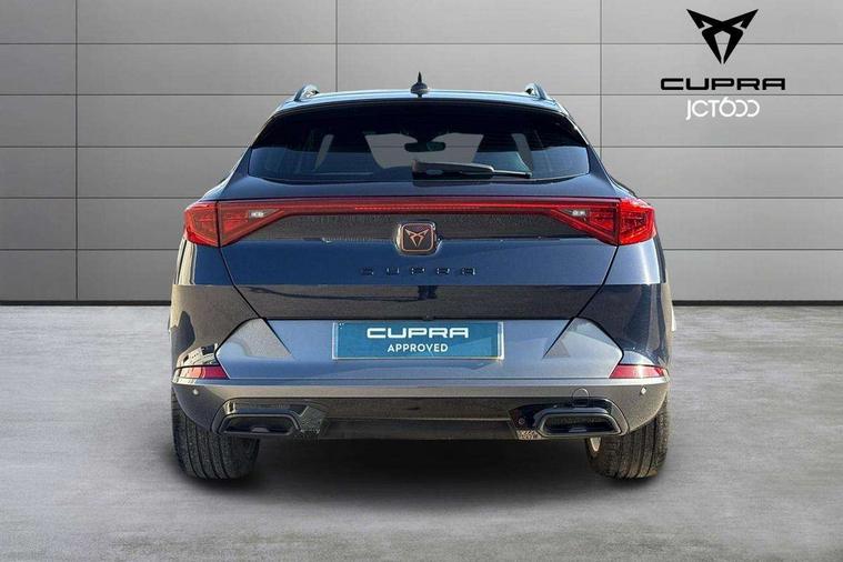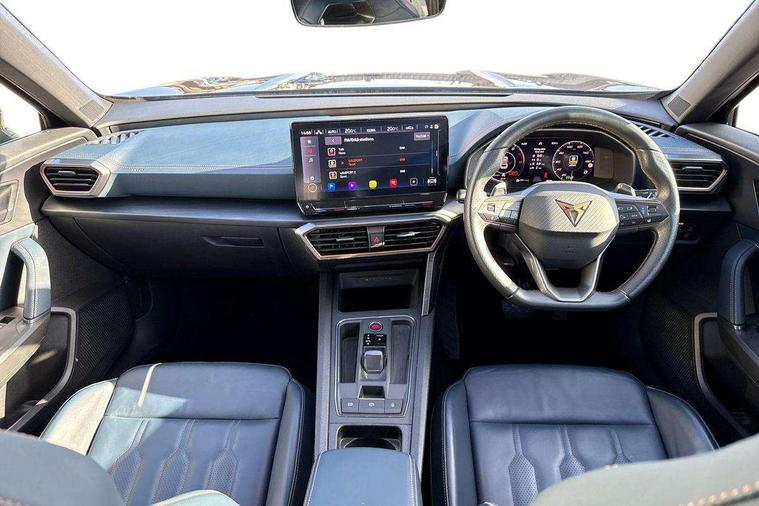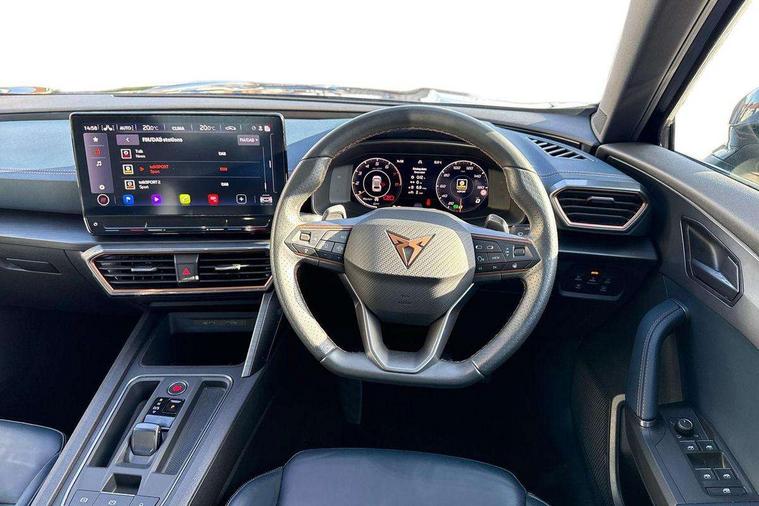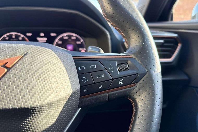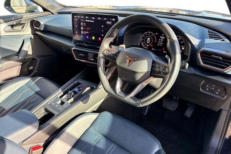 Digital cockpit and configurable dashboard, Driver alert system, Driving profile selection, Forward collision warning with automatic braking, Lane assist, Navigation system with 12'' Touchscreen Display, Park assist (inc front/rear parking sensors), PAS, Predictive adaptive cruise control with speed limiter, Rear view camera, RPM, trip computer, outside temp gauge, instrument light brightness, low fuel warning light, lights on reminder, gearshift indicator, Service interval indicator, Start/stop system with regenerative braking, Voice control system, Wireless apple carplay, Wireless phone charger, Electronic locking differential and dynamic traction support, Standard suspension, 2 front and 2 rear USB type C sockets, Auxiliary input socket, DAB radio, Auto dimming rear view mirror, Body colour door handles, Body coloured bumpers, Dark grey wing mirror, Daytime running light with automatic headlight control and coming home feature, Dynamic headlight range control, Electric front/rear windows, Electrically adjustable heated and folding door mirrors with memory function, Front fog lamps with cornering function, Gloss black roof rails and window surrounds, LED Headlights, LED Taillights with dynamic indicator, Rain sensing wipers, Rear diffuser with black simulated exhaust pipes, Rear side wing doors, Rear wash/wipe, Third brake light, Tinted rear windows, Welcome lights, 12v power supply in centre console, 12V socket, 12v socket in loadspace, 2 front and 2 rear reading lights, 230V socket, 3 seat bench in 2nd row, 60/40 split rear bench seat with armrest and mechanical seat release, Black headlining, Dust/pollen filter, Front and rear head restraints, Front centre armrest, Height/reach adjust steering wheel, Illuminated interior front door sills, Illuminated sunvisor with mirror, Isofix, Leather multi function heated steering wheel with gear shift paddles, Luggage tie-down hooks, Single front passenger seat, Three zone climate control with control panel in rear, Variable luggage/load compartment floor, Wraparound lighting, Genuine Nappa leather Pack - Cupra, 3 point seatbelts on all rear seats, ABS, Brake control system - ESC and brake booster, Child proof door locks, Driver and front passenger airbags with front passenger airbag de-activation, Electronic parking brake, Front and rear disc brakes, Front side curtain airbags, Hill hold control, Public e-call, Seat belt reminder for front and rear seats, Tyre pressure monitoring system, Anti theft alarm system, Keyless entry and start system (KESSY), Locking wheel bolts, Copper and aluminium interior detailing, 19" 'Exclusive' machined sport matte black and silver alloy wheels,