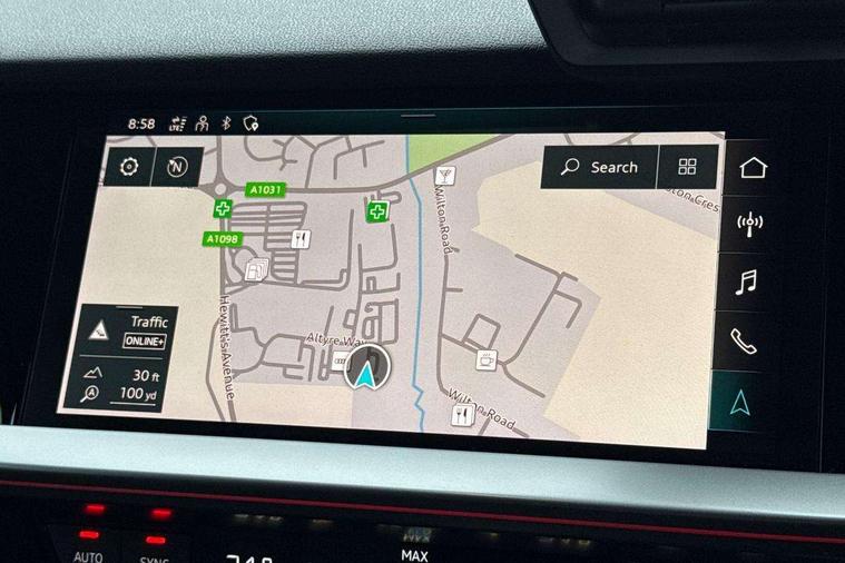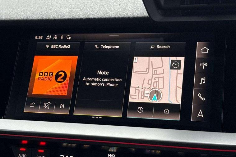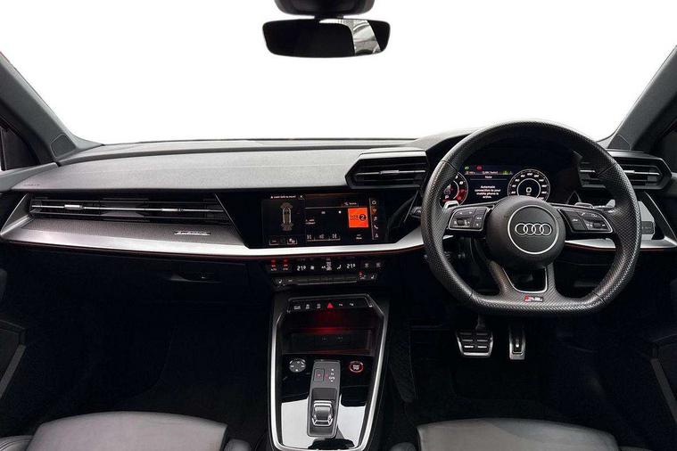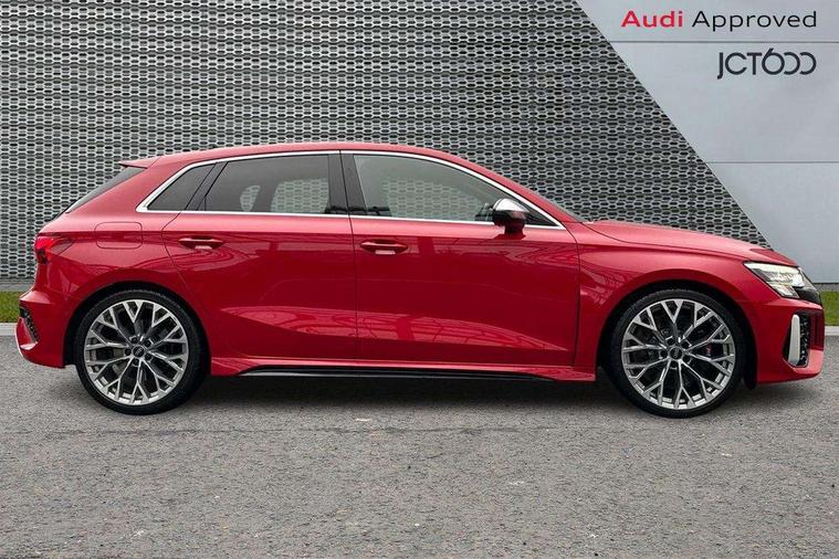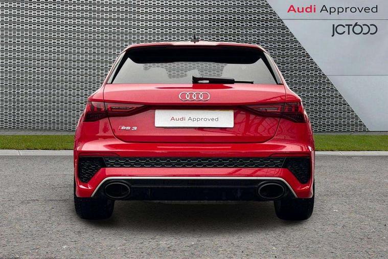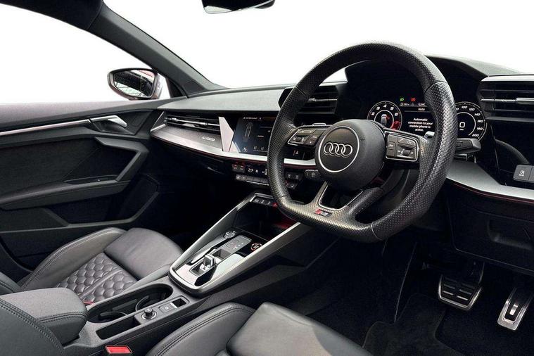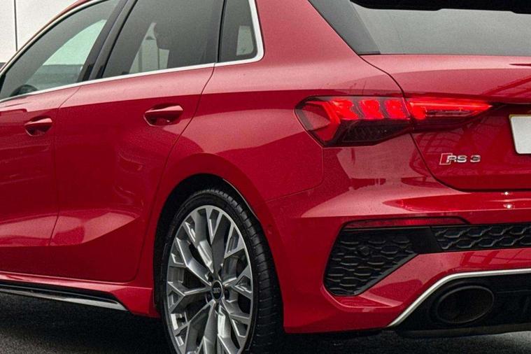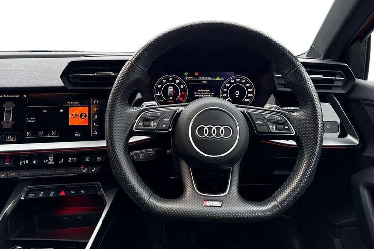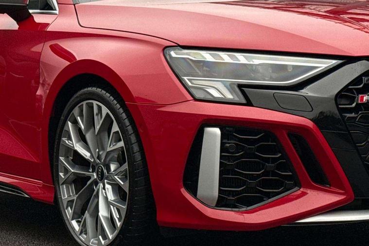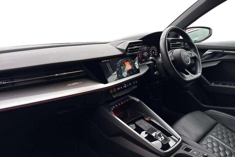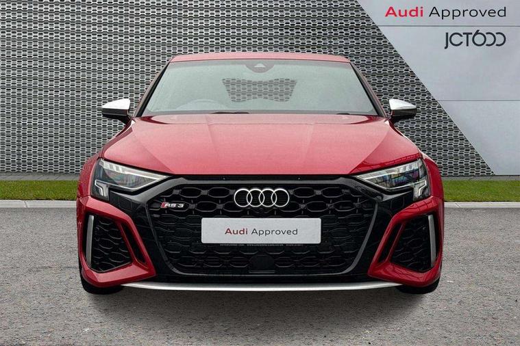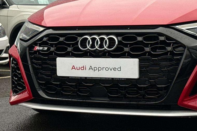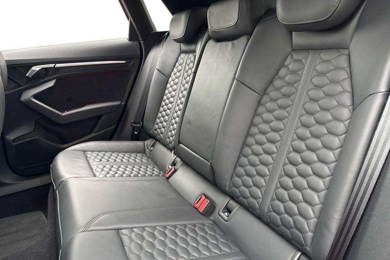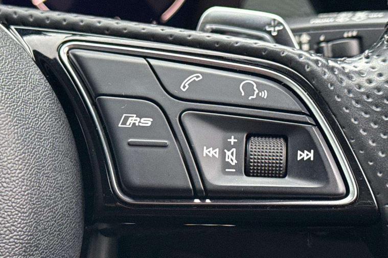 Audi connect emergency call and service, Audi smartphone interface, Audi virtual cockpit with RS specific display 12.3" full colour digital instrument cluster, Automatic start/stop system with recuperation, Bluetooth interface, Collision avoidance assistant, Lane departure warning system, Legal emergency call, Manual boot opening, Parking assist with parking system plus, Progressive power assisted steering, Quattro permanent four wheel drive, Rear suspension, Audi sound system impressive sound with 10 loudspeakers including centre speaker and subwoofer, 6-channel amplifier with a total output of 180 watts, DAB Digital radio, 3rd brake light, Acoustic glass windscreen, Audi beam uses LEDs to project the Audi sport logo onto the ground as you exit your RS 3, Auto dimming rear view mirror, Black side skirts, Body colour roof, Door mirrors - electrically adjustable, heated, folding and auto dimming on both sides, Headlight washers, LED headlights with LED rear lights + dynamic rear indicators, Light and rain sensors, Matt aluminium door mirrors, Matt aluminium window trims, Privacy glass - dark tinted rear and rear side windows from B-pillar backwards, Rear window wiper and washer system, 40/20/40 split folding rear seat bench, Black cloth headlining, Dual zone electronic climate control, Front and rear headrests, Front centre armrest, Front sports seats RS embossed logo, Front/rear floor mats, Heated front seats, Honeycomb stitching and RS embossing, Illuminated door sill trims inlays in aluminium with RS 3 logo, Manually adjustable front seats, RS emblems, Stainless steel pedals and front footrest in black, Tool kit, Aluminium interior elements pack - RS3, Ambient lighting pack - RS3, MMI navigation plus with MMI touch - RS3, RS bodystyling - RS3, Storage Pack - RS3, 3x3 point rear seat belts, ABS/EBD, ASR, Audi pre sense front, Driver/Front Passenger airbags, EDL, ESC - Electronic Stability Control + traction control, Front passenger airbag deactivation, Front side airbags with head airbags and interaction airbag, Hill hold assist, Seat belt reminder with passenger presence detection in rear, Tyre pressure loss indicator, Warning triangle and first aid kit, Anti theft alarm, Anti-theft wheel bolts, Electronically operated child lock, Remote control central locking, Carbon inlays, accent surfaces in the dashboard and centre console in platinum grey silk effect paint finish, 19" 10 Y spoke platinum grey, gloss turned finish alloy wheels, Tyre repair kit,
