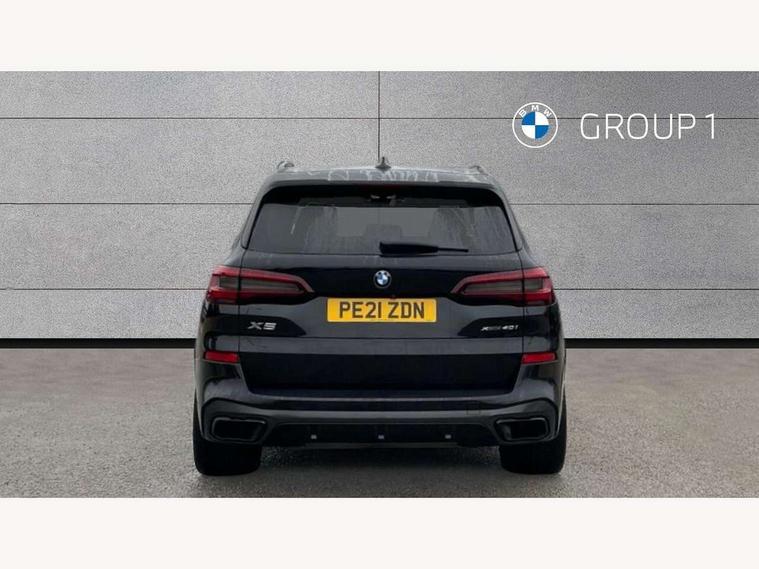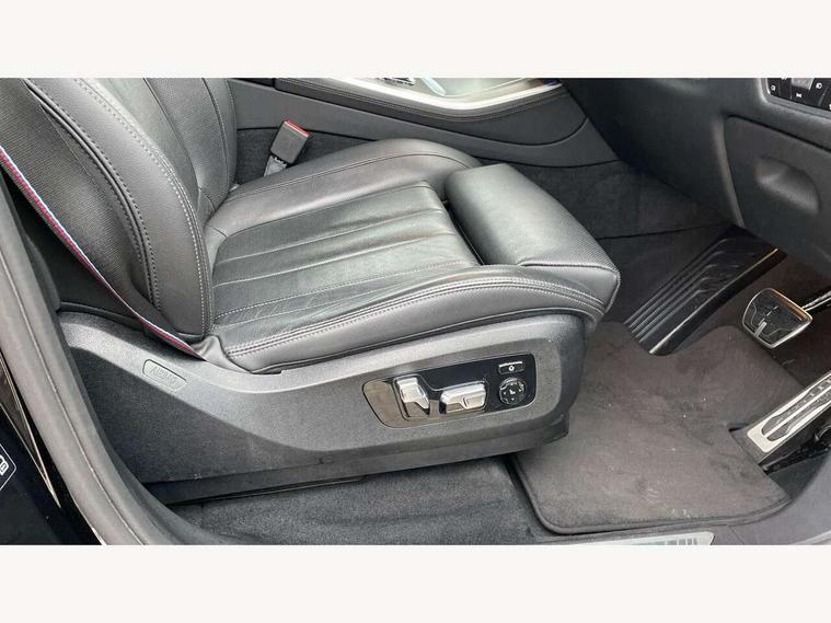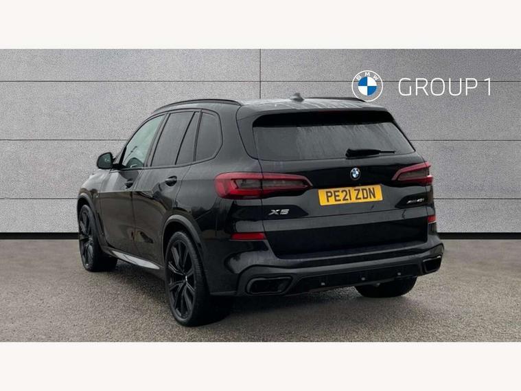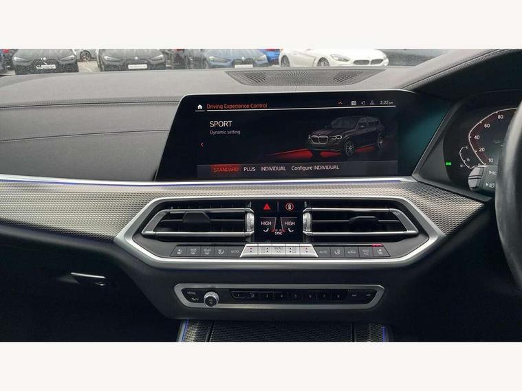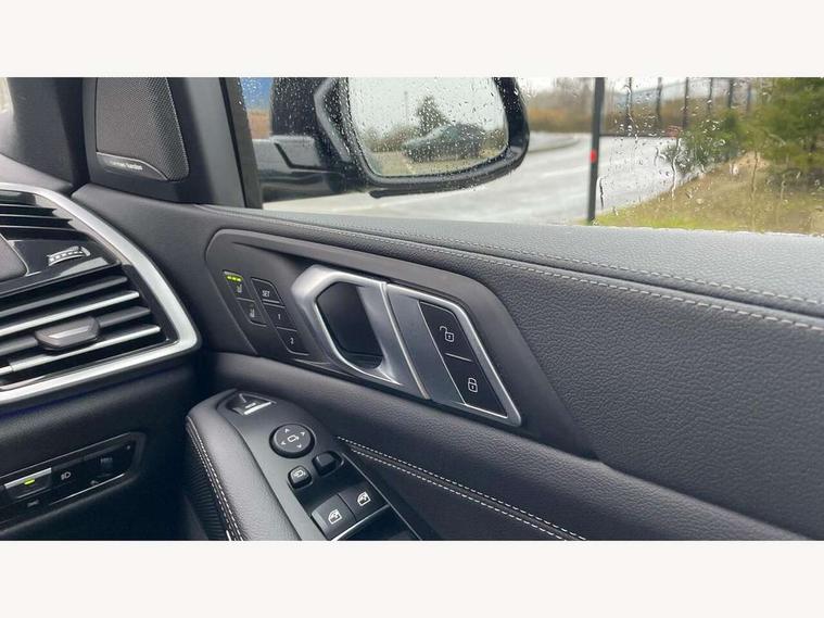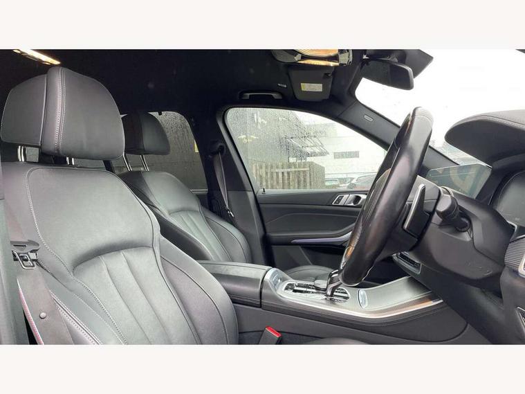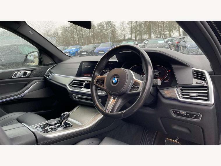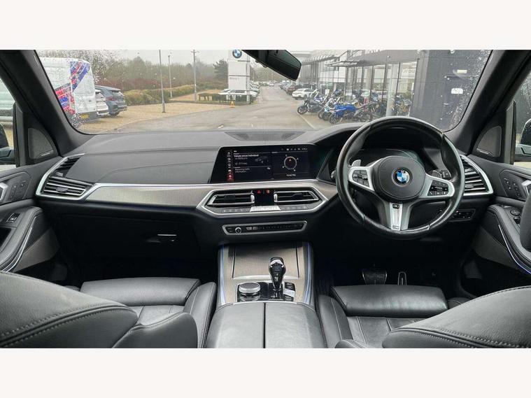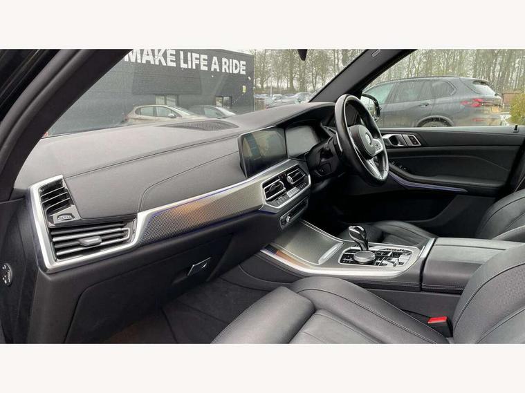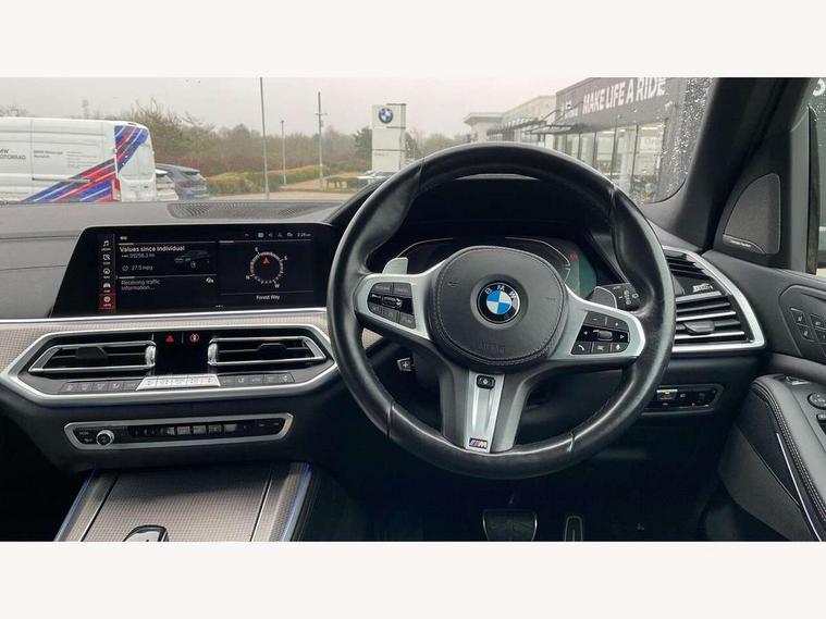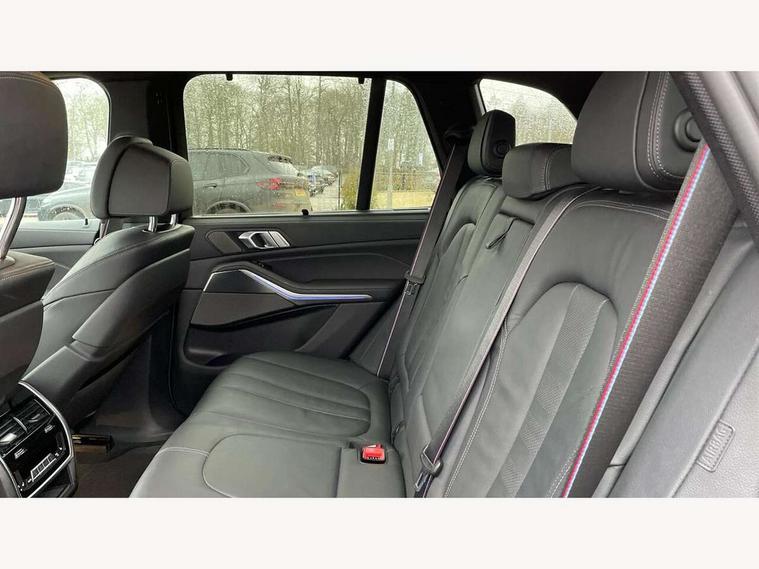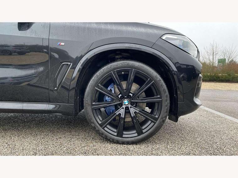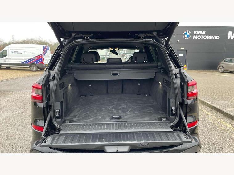 20GB hard disc drive (HDD) memory, Active guard plus, Attentiveness assist, Automatic tailgate with top hinged section open and manual bottom hinged section, BMW ConnectedDrive online services, BMW digital live cockpit professional - 12.3" digital instrument panel and 12.3" CID, with touch/voice command, BMW legal emergency call, BMW Teleservices, Brake force display, Brake pad wear indicator warning light, Enhanced bluetooth hands free facility with Telephony wireless charging, Front/rear park distance control, Galvanised plastic keyfob, iDrive touch controller with shortcut buttons, Infinity symbol with line graphic on reset of average consumption, Lights on warning, Oil sensor for level and grade, On board computer inc. average speed, fuel consumption, liquid crystal Info display, journey computer, outside temperature display, personal profile, Service interval indicator, Speed limit info display, Wi-Fi hotspot, 48V Mild hybrid technology, Adaptive 2-axle air suspension, Double VANOS, Double wishbone front axle, Drive performance control with ECO PRO comfort + sport mode, Eight speed steptronic sport automatic transmission and gearshift paddles on the steering wheel, High precision injection, Petrol Particulate Filter, Safety battery terminal clamp, Turbocharger with Valvetronic, DAB Tuner enables digital radio reception, Favourite buttons, USB connection, USB type A 1.5A in cupholder, USB Type C 3A in centre armrest, Active Air Stream kidney grille with high-gloss chrome, Adaptive air flap control bar in high-gloss black, Automatically dimming rear view mirror, BMW Individual high gloss black shadow line roof rails, Body colour bumpers, Body colour door handles, Dynamic brake lights with LED technology, Exhaust tailpipes - single, left and right with Chrome finisher, Follow me home headlight function, Front and rear electric windows with open and close fingertip control, anti trap facility and comfort closing, Heated windscreen washer jets, High beam assistant, High gloss black outer and central air intakes on front bumper with pearlescent chrome finish, High gloss black Side elements, LED daytime running lights, LED fog lights, LED rear lights, M aerodynamic body styling, M designation on left and right front side panels, Pearlescent chrome front grille bars, Rain sensor with automatic headlight activation and windscreen wiper control, Satin aluminium side window graphic, Third brake light in rear spoiler, Variable intermittent rear wash/wipe, Welcome light carpet, X5 on left tailgate, xDrive designation on right tailgate, 12V - Power sockets with 2x centre console and 1x luggage compartment, 40:20:40 split folding rear seats, Ambient interior lighting with 6 pre-designed selectable lights including dynamic function, Centre and rear interior light, Child seat ISOFIX attachment with rear outer seats includes top tether, Electric front seat adjustment with driver and front passenger memory function, Electrical steering column with adjustable height and length with activation and control on the steering column, Foldable rear centre armrest with 2 cupholders and storage compartment, Front and rear cupholders x 2, Front and rear door pockets, Front and rear door sill inlays with illuminated BMW M designation, Front and rear side armrest integrated into door trim, Front footwell lights, Front reading lights, Light inside glove compartment, Lockable glove compartment, Luggage compartment floor panel with integral storage tray, Luggage compartment lighting, M leather steering wheel, M specific key, M specific pedals, M specific steering wheel, M specific velour floor mats, Make-up mirror lights, Multifunction controls for leather steering wheel, Multifunctional hooks, Rear head restraints, Seat back with flap pocket, Securing rings in luggage compartment, Storage bins on all doors, Storage tray and compartment with cover in centre console, Sunvisors with illuminated vanity mirrors, Toolkit located in luggage compartment, Connected Package Professional - X5, Expanded exterior mirror pack - X5/X5 M, Non-smokers pack - X5, Airbags - driver/front passenger, rear and side, first and second row seats head airbags, front passenger seat airbag deactivation + knee airbag, Anti-lock braking system (ABS), Automatic Stability Control (ASC), Brake drying, Brake energy regeneration, Brake fade compensation, Braking pre-tensioning, Cornering brake control (CBC), Crash sensor activating central locking release, hazard warning lights, fuel cut off, interior lighting + activation of safety battery terminal clamp, Deformation zones - front and rear with door reinforcements and bumpers up to 2.5 mph, DSC - Dynamic Stability Control, Dynamic brake control, Dynamic Traction Control - DTC, Electromechanical parking brake with automatic drive away release and auto hold function, Electronic brake force distribution, Front and rear seatbelts with seatbelt stopper, seatbelt tensioner for front and outer rear seats and belt force limiter, Front head restraints with anti-whiplash, Height adjustable front seatbelts, Hill start assistant, Integrated brake system, M Sport braking system in blue high gloss + blue painted brake calipers with M designation, Mechanical child proof lock on rear doors, Passive protection for pedestrians, Seat occupancy detection for driver and passenger side, Side impact protection, Three 3 point inertia reel seatbelts, Two tone horn, Tyre pressure monitoring system, Ventilated front and rear disc brakes, Warning triangle and first aid kit, Closing system with central locking, Driver and front passenger door centre lock switch, Locking wheel bolts, Thatcham 1 alarm system with remote control and engine immobiliser, Start/stop toggle diamond shaped trim finisher in pearl chrome,