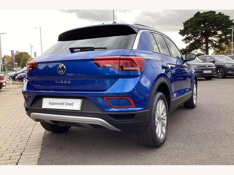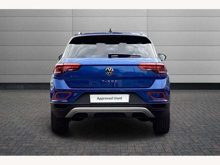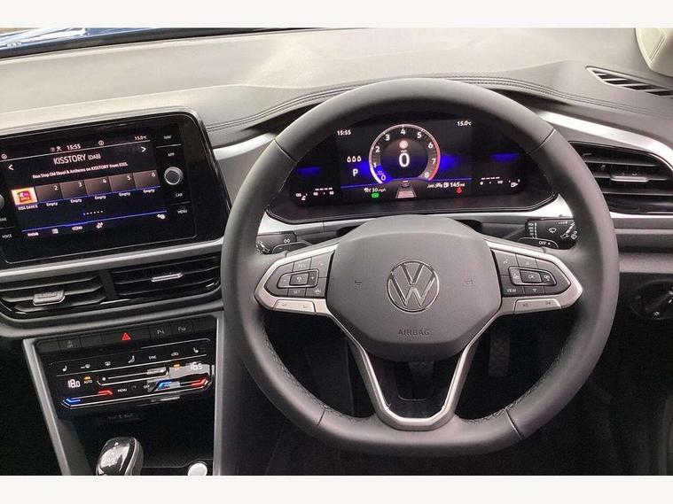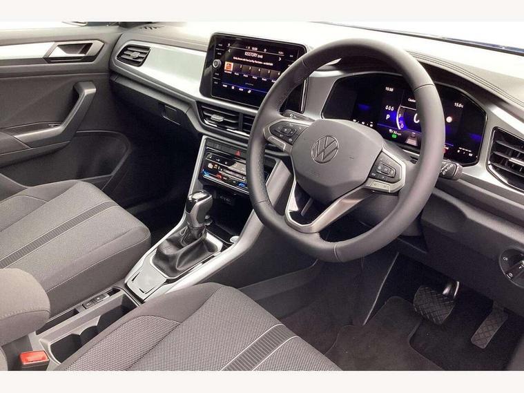 Advanced driver attention and drowsiness monitor, Dynamic road sign display, Emergency call service, Lane keeping system Lane Assist, Mobile phone interface, Modified key software - reduce switch off time for key status change to Long no motion, Online services, Park assist including front and rear parking sensors, Power assisted speed sensitive steering, Rear view camera, Service interval indicator, Tailgate/trunk lid release from outside, Think blue trainer driver tips and journey analysis, Warning sound and light for front seatbelts unfastened, Wireless app connect, Battery regeneration during braking, Front shock absorption, Rear shock absorption chassis with increased ride height, Start/stop function with battery regeneration, DAB Digital radio, Diversity antenna for FM reception, Music playback - MP3, WMA and AAC files, SD card slot, Simultaneous pairing of 2 compatible mobile devices, Title and cover art display, We Connect and We Connect Plus functionality, Auto dimming interior rear view mirror, Automatic hazard lights activation under emergency braking, Automatic headlight control with LED separate daytime running lights with coming/leaving home function, Black roof rails, Body coloured bumpers and radiator grille with chrome trim and front fog lamps with chrome bezel, Body coloured exterior mirror housings and door handles, Electrically adjustable and heated door mirrors, Extended roof spoiler, Exterior mirrors aspherical on driver side, convex on front passenger side, External USB type C socket and charging sockets, Front windscreen wiper with intermittent wipe and 4 position delay, Heated rear window, LED 3rd brake light, LED rear combination lamps, LED rear number plate lights, Power windows with comfort operation and circuit breaker, Privacy glass for rear side windows and rear window, Rain sensor, Rear exhaust tailpipe, Rear fog light on one side and reversing lights on both sides, Rear side wing doors, Rear wash/wipe with intermittent wipe setting, Remote electrically foldable door mirrors, puddle lights and reverse activated passenger's door mirror, 12V power socket in centre console, 3 rear head restraints, 3 seat bench in 2nd row, 4 load lashing points in luggage compartment, Air care climatronic air conditoning system with active combination filter and 2-zone temperature control, Black stitching for floor mats, Ceramique roof liner, Cloth upholstery, Door and side trim panel in cloth, Drawer under drivers seat, Driver/front passenger seat height adjustment, Front centre armrest, Front comfort sports seats, Front cupholders x 2, Front reading light, Front seat back storage pockets, Glove compartment door with light, Instrument lighting, white adjustable panel illumination, Interior ambient lighting and surround lighting, Interior light delay, Isofix child seat preparation, Leather gearshift handle, Load-through provision with cup holder when folded down ('Unsplit rear seat bench, split folding backrest, with centre armrest), Luggage compartment lighting, Lumbar support for driver's and front passengers seat, Non-folding front passenger seat backrest, Single front passenger seat, Storage compartment in left and right luggage area, Storage compartment in rear doors, Storage compartments in driver and front passenger doors, Sunvisors with illuminated vanity mirrors, Variable boot floor, height adjustable and removable, Driver assistance pack without proactive passenger protection - T-Roc Life/Match, 3 point height adj front seatbelts + pretensioners, 3 point seatbelts in outer rear with ECE label, ABS, Child locks on rear doors, City emergency braking and pedestrian monitoring, Driver and front passenger airbag with front passenger airbag deactivation, Driver and front passenger safety-optimised head restraints, Drivers seatbelt reminder, Electronic parking brake, Electronic Stability Control (ESC) inc EDL (Electronic Differential Lock) and ASR (Traction Control), Front and rear passengers curtain airbag system including front side airbags, Front disc brakes, Hill start assist, Predictive pedestrian protection, Rear disc brakes, Two tone horn, Tyre pressure loss indicator, Volkswagen roadside assistance, Alarm with interior protection, Keyless locking and starting system keyless access with safelock, Pewter matt decorative inserts for intrument panel, centre console and door panels at the front, Trims for alloy wheels,
