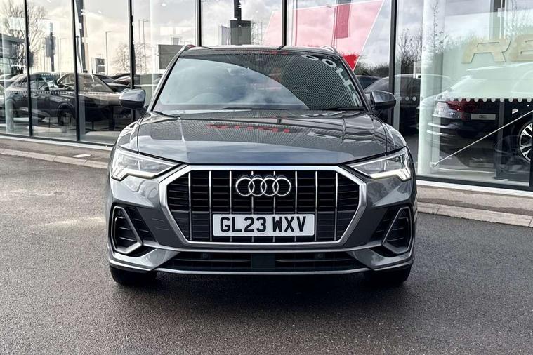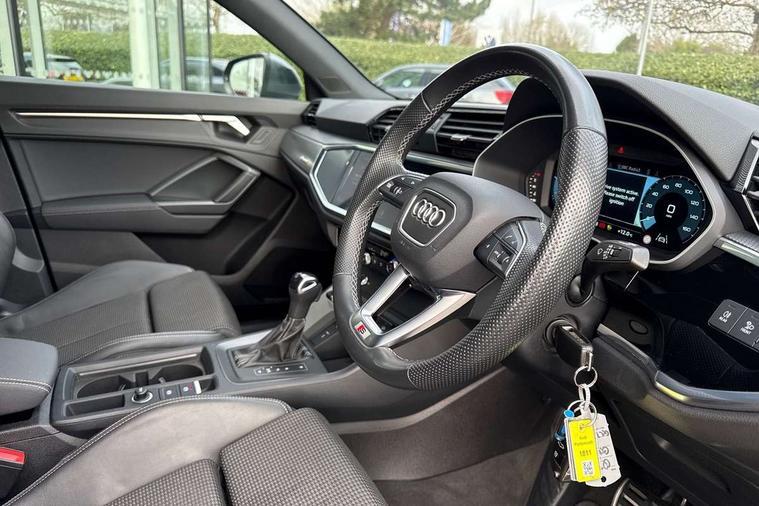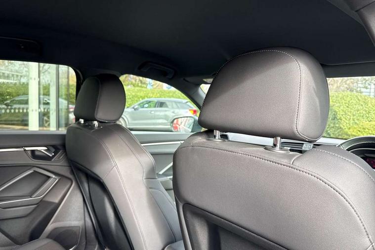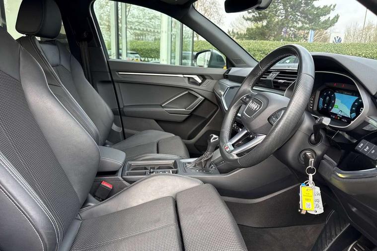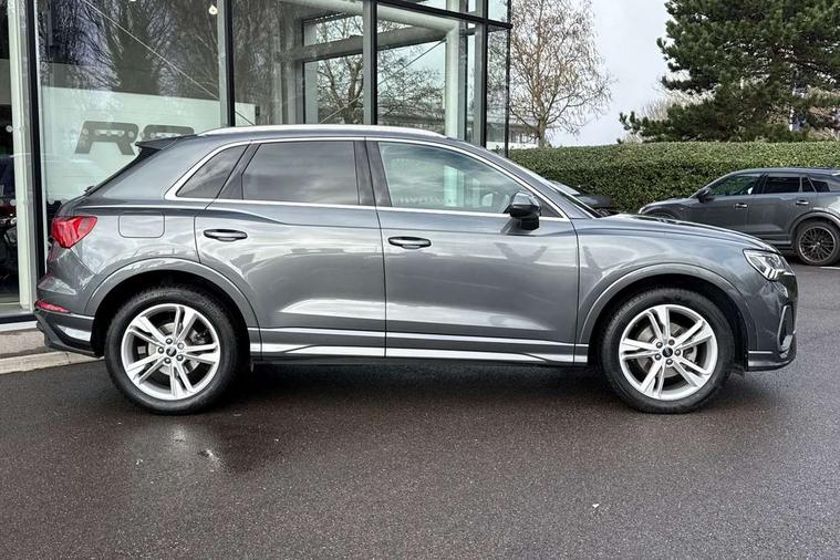 Amazon alexa Integration, Audi drive select, Audi lane departure warning, Audi smartphone interface includes wireless Apple carplay/Android Auto, Audi Virtual Cockpit - 10.25" display, Bluetooth interface, Camera based traffic sign recognition, Legal emergency call, MMI Navigation Plus with high resolution 10.1 inch touchscreen colour display, Power operated tailgate, Progressive steering, Service interval indicator, Start stop system with recuperation, Voice control system with natural language interaction, Diesel particulate filter, Sports suspension, 2 USB-C ports with charge and data functions, 6 passive loudspeakers, DAB digital radio module, Acoustic windscreen, Aluminium roof rails, Aluminium window trim, Anthracite black radiator grille, Auto dimming frameless rear view mirror, Body colour front spoiler blade, Body coloured bumpers, Electrically folding, adjustable and heated door mirrors with integrated LED side indicators and kerb view function for passenger side, Front and rear electric windows, Front fog lights, Front side air inlets in matt platinum grey, Grille vertical bars in aluminium silver/Matt, High gloss black finish B and C pillars, LED Dynamic rear indicators, LED headlights with LED daytime running lights, LED rear lights, LED third brake light, Privacy glass dark tinted rear and rear-side windows (from B-pillar backwards), Rain and light sensors, Rear diffuser grille in grained matt black, Rear diffuser strip in matt anthracite black, Rear side wing doors, Rear wiper, S line badges on front wings, S Line front and rear bumpers, Side skirt insert in matt Platinium grey, Variable front intermittent wipers, 12V socket in rear centre console, 3 seat bench in 2nd row, 3 spoke leather multifunction steering wheel features S badging and grips in perforated leather with contrast stitching, 40:20:40 folding with manual adjustment for 60:40 forwards/backwards position and backrest angle, Adjustable rear seat bench/backrest with centre armrest and cupholder, Black cloth headlining, Dual zone electronic climate control, Front and rear black floor mats with contrast stitching in rock grey, Front and rear headrests, Front and rear roof module including reading lights, Front centre armrest, Glove compartment lighting, Height and reach adjustable steering wheel, Illuminated door sill trims with S logo, ISOFIX child seat mounting for front passenger with airbag deactivation and outer rear seat including top tether attachment point for outer rear seats, Luggage compartment light, Manual front seats with height adjustment, Perforated leather gearknob, Single front passenger seat, Stainless steel luggage compartment sill finisher, Stainless steel pedals, Ambient lighting pack - Q3, Non smoking pack - Q3, 3x3 point rear seatbelts, 6 airbags - Driver, front passenger, curtain and side windows, Audi pre-sense front with pedestrain and cyclist recognition, Electrically operated child locks on rear doors, Electromechanical parking brake, Electronic stabilisation control including ABS, ASR and EDL, Front seatbelt reminder, Hill descent control, Hill hold assist, Pre sense basic, Seatbelt monitoring, Tyre pressure warning, Warning triangle and first aid kit, Anti theft alarm, Anti theft wheel bolts, Immobiliser, Remote central locking, Aluminium look interior elements, Dark matt brushed aluminium inlay, Detail dashboard around MMI touch colour display in glass look, black with surround in aluminium look, Leatherette door armrest,