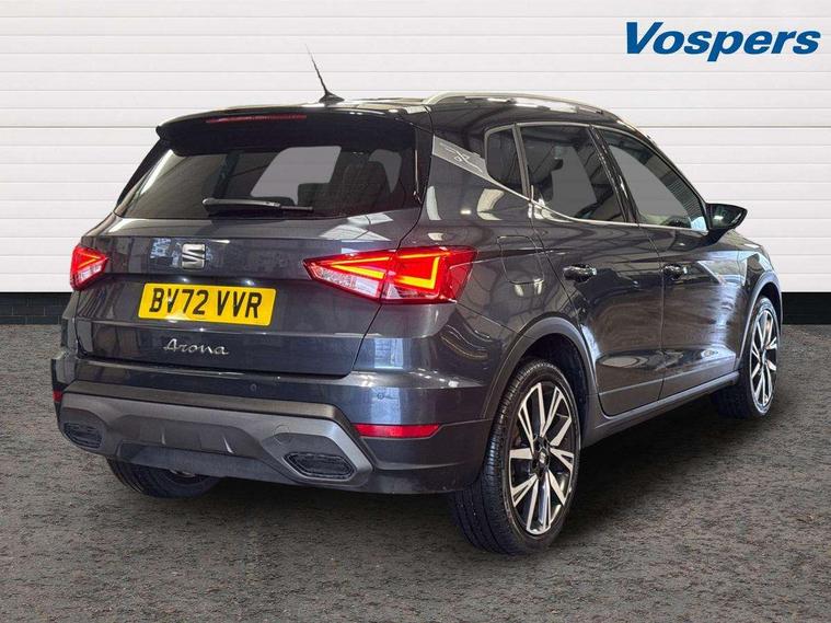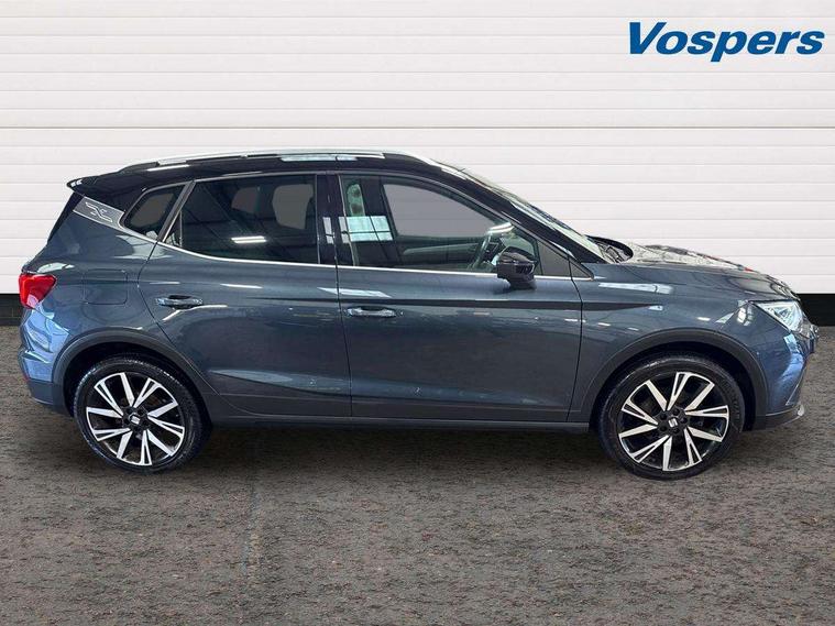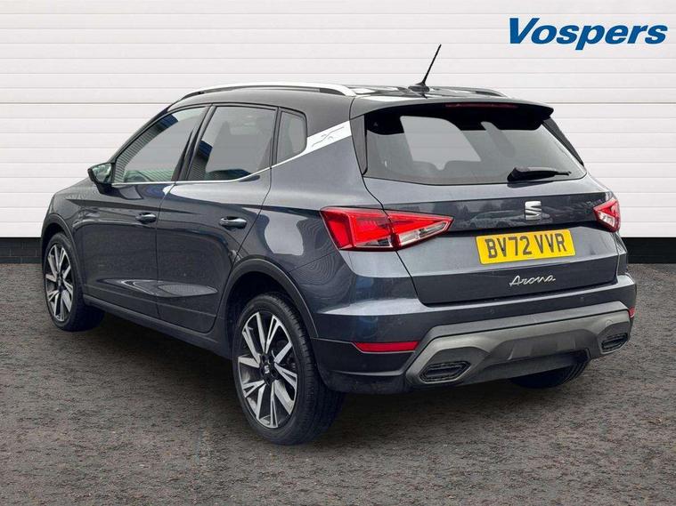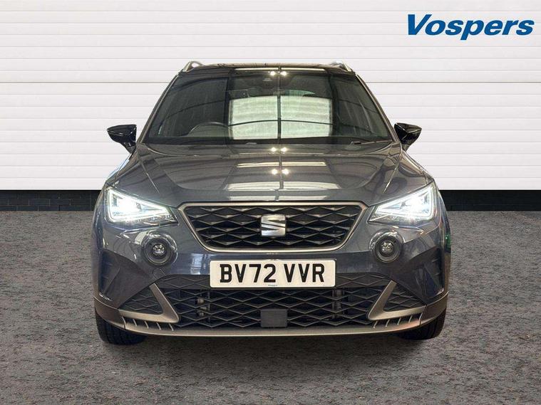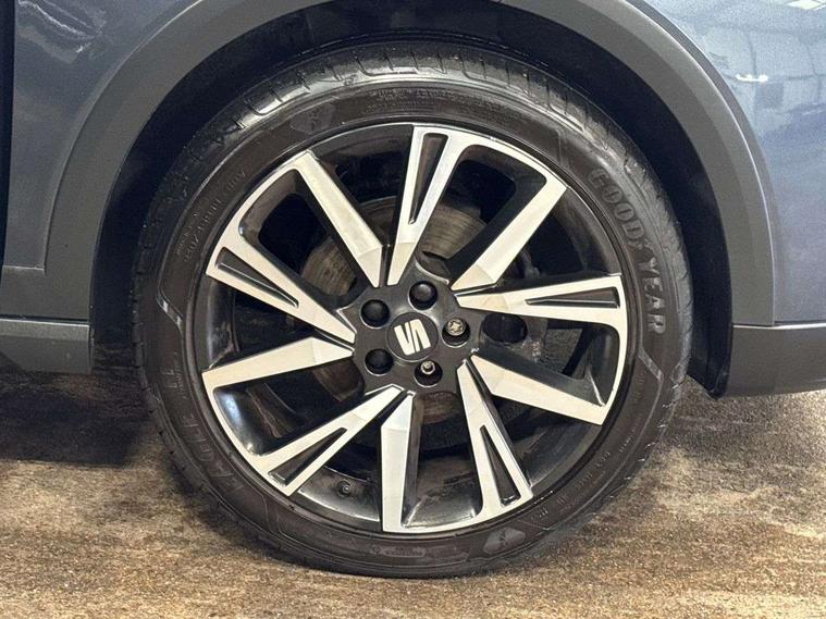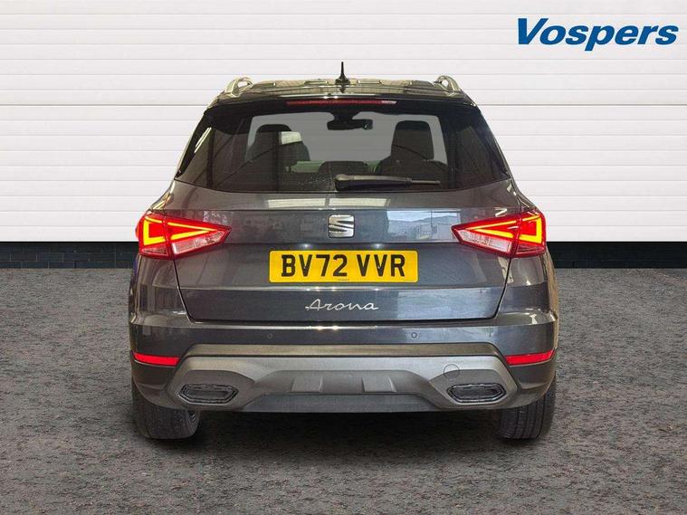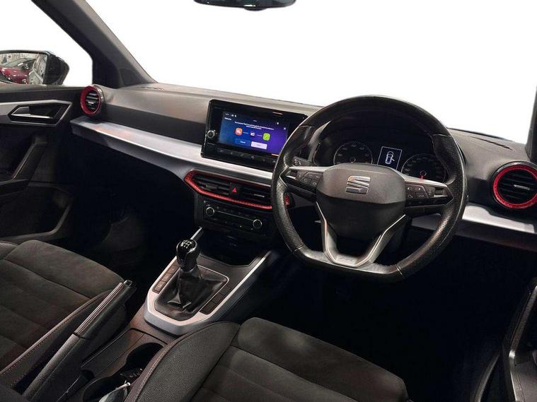 'Lights On' Reminder warning buzzer, Analogue cockpit with physical dials, Digital clock, E-call, Electric speed sensitive power steering, Full Link Smartphone Integration with Mirror Link, Apple Car Play, Google Android Auto with USB Type C cable for Apple and Android compatibility, Lane keeping system, Low fuel warning light, Outside temperature display, Rear parking sensor, RPM counter, Seat connect with safety, service and remote, SEAT Drive profile - Four different models normal-sport-eco-individual, steering response, throttle response, Trip computer, Wireless phone charger, Bluetooth interface for hands free and audio streaming, DAB digital radio and AM/FM radio, Media system with 8.25" colour touchscreen with USB port (type c), Steering wheel mounted audio controls, Anti theft roof antenna, Automatic activation of hazard warning lights, Body coloured bumpers, Body coloured door handle inserts, Chrome roof rails and window surrounds, Dark tinted rear windows, Dimming rear view mirror, Electric front/rear windows, Electrically adjustable and heated door mirrors, Front fog lights with cornering function and rear fog light, FULL LED automatic headlights with dynamic headlight range control, coming and leaving home, LED daytime running lights, LED rear tail lights and licence plate lights, Protective side mouldings, Rear side wing doors, Rear spoiler, Rear window wash/wipe, Roof colour door mirrors, Third brake light, Twin exhaust pipe styling hidden exhaust pipe, Visible VIN plate, Windshield wiper with intermittent control and potentiometer, 2 cupholders, 3 seat bench in 2nd row, 60/40 split folding rear seat, Aircare filter, Black interior roof, Double boot floor, Driver sunvisor with covered mirror + card holder, Dual zone climate control, Front comfort seats, Front courtesy light with 2x front and 2x rear reading lights, Gear shift indicator, Height adjustable front seats, Height/reach adjustable steering column, Illuminated boot, Instrument lighting with brightness control, Interior ambient lighting, Interior light in footwell, central console and door panel, ISOFIX points in outer rear seats with top tether anchorage points, Microsuede cloth upholstery, Passenger sunvisor with vanity mirror, Perforated flat bottomed leather steering wheel/gear knob/handbrake with red stitching and FR logo, Single front passenger seat, Two front and three rear height adjustable headrests, Interior chrome pack - Arona, 3 point seatbelts on all rear seats, ABS, Active front headrests, Child locks on rear doors, Driver and front passenger airbags with front passenger airbag de activation, front side and curtain airbags, Electronic stability control, Emergency Brake Assist (EBA) and front assist, Front and rear seatbelt reminder, Hill hold control, Multi-Collision braking, Tiredness recognition system, Traction control, Tyre pressure monitoring system, Alarm with back-up horn, Electronic engine immobiliser, KESSY Keyless entry and go, Locking wheel bolts, Remote central locking + deadlocks, Tow away protection, Titan black dashboard,