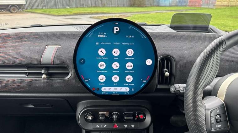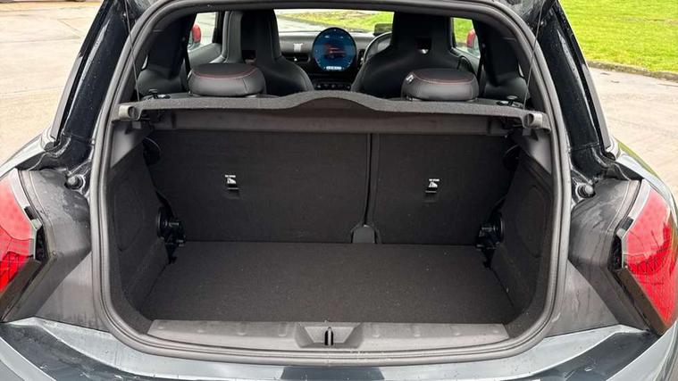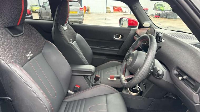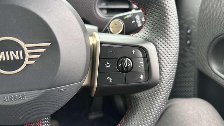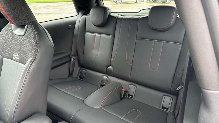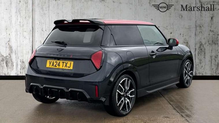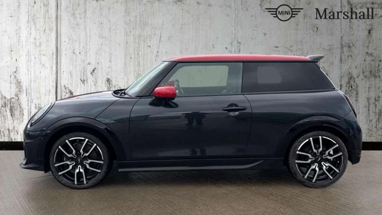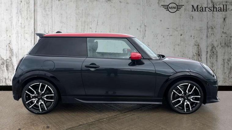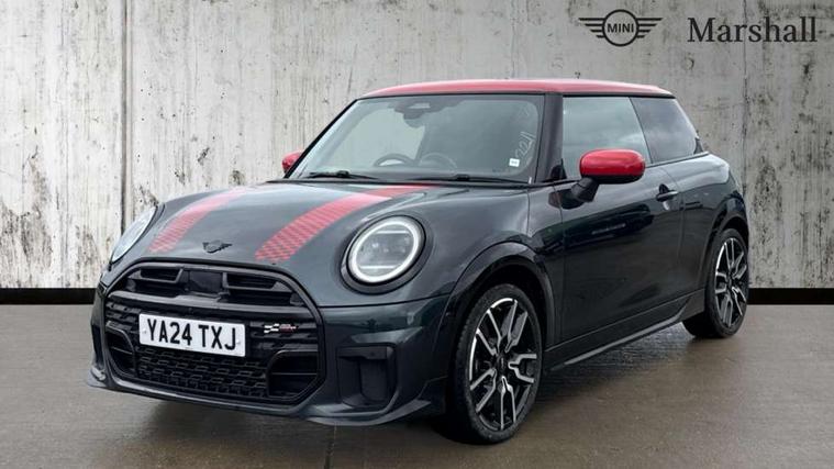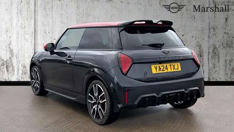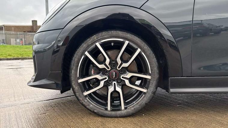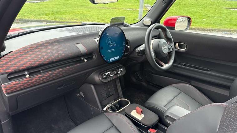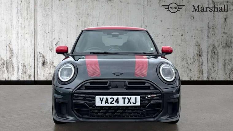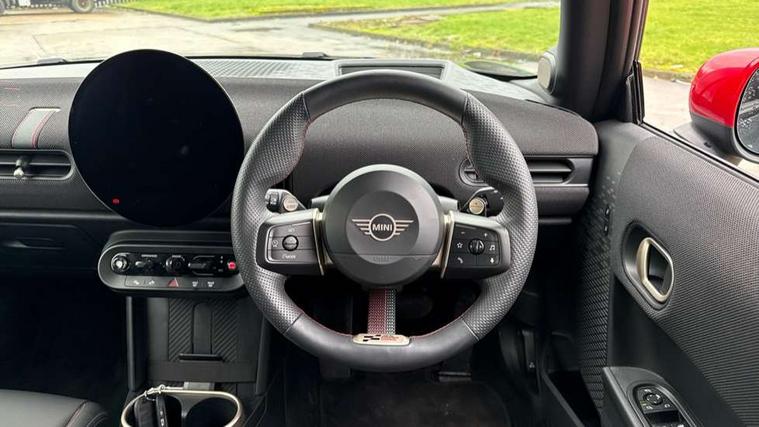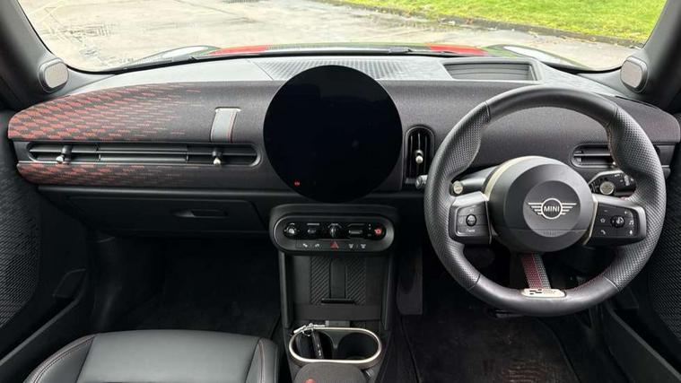 Central toggle bar, Circular OLED Screen, Compatible mobile phone bluetooth with audio streaming, Cruise control, Digital instrument cluster, Electro-mechanical speed dependant steering assistance, Emergency call service, MINI Experience Modes, Mini navigation system, On board computer, Service interval indicator, 7 speed steptronic sport transmission with double clutch, Adaptive suspension, DAB Digital radio, Personal eSim, Auto headlights, Electric adjustable heated door mirrors, Electric front windows, Front and rear apron, Heated rear window, Heated windscreen washer jets, High gloss black wheel arches, High gloss hexagonal patterned grille surround, JCW body kit, LED daytime running lights, LED indicator lights, LED rear lights, Rain sensor window wipers, Rear fog lights, Rear roof spoiler with airblades, Rear window wiper, 2 seat bench in second row, 2 zone automatic air conditioning, 60/40 rear seat bench, Ambient lighting, Cupholders, Dark headliner, Floor mats, Front and rear head restraints, Front compact armrest, Heated steering wheel, Height adjustable passenger seat, Lidded storage box in Black/Red knit, Luggage compartment lighting, Perforated Vescin steering wheel, Single front passenger seat, Steering wheel paddle shift, Sunvisors with vanity mirrors, Vescin/Cord upholstery, Driving assistant pack - Cooper Hatchback, Level 1 pack - Mini Hatchback, Park assistant pack - Cooper Hatchback, 3 point seatbelts on all four seats, 6 Airbags - front, side, head and seat belt tensioners, Acoustic pedestrian protection, Anti-lock braking system (ABS), Brake caliper in Black with JCW badge, DSC - Dynamic Stability Control, Electronic parking brake, Front and rear disc brakes, Front ISOFIX (iSize), Front passenger airbag deactivation, JCW Sport Brakes, Traction control, Tyre pressure monitoring system, Alarm, Immobiliser, Remote central locking, Black/Red decorative dash strap, JCW Black/Red dashboard knit, 18" JCW Lap spoke 2-tone alloy wheels, Tyre repair kit,