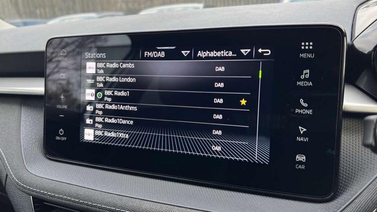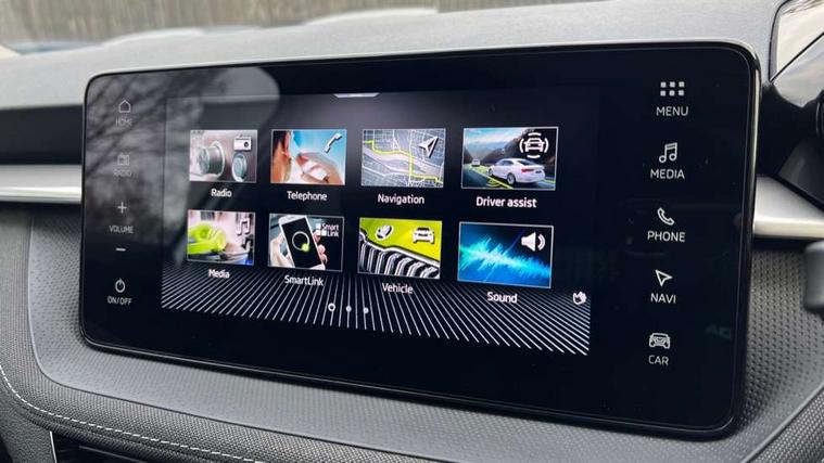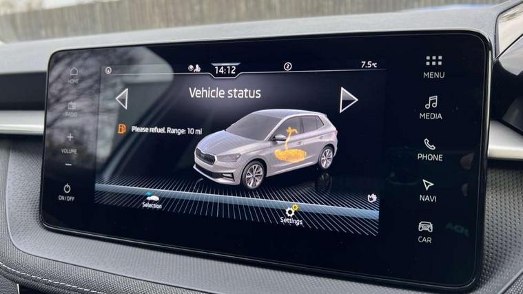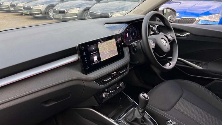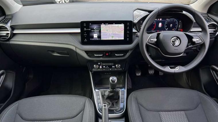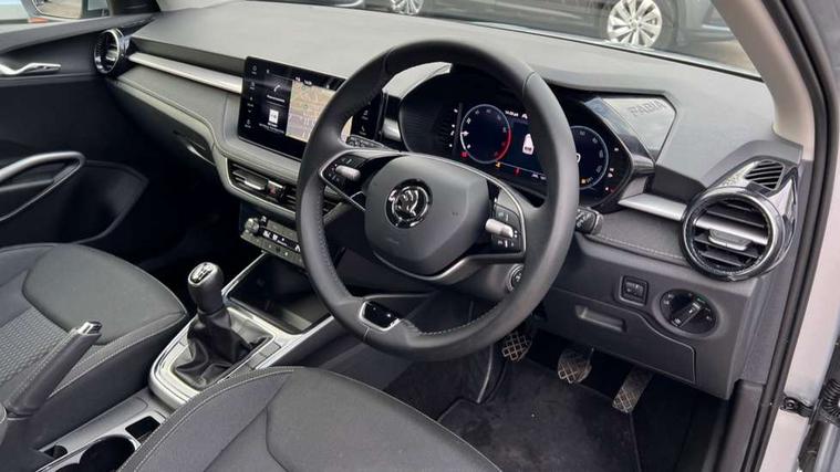 Advanced driver attention and drowsiness monitor, Bluetooth connection, Electromechanical power steering, Exterior temperature gauge, Service interval indicator, Traffic sign recognition, Virtual cockpit with 10.25" colour display, Wireless SmartLink for Apple CarPlay and Android Auto, 6 Speakers (4 in front and 2 in rear), 9.2" colour display skoda navigation system with voice control and web radio, Auxiliary socket for external MP3 player, DAB digital radio reception, Auto dimming rear view mirror, Body colour door mirrors, Body coloured bumpers, Chrome window surround, Door mirror integrated indicators, Front and rear electric windows, Front window wiper intermittent control, Headlight range control - Automatic, Ice scraper in fuel cap, LED 3rd brake light, LED daytime running lights with coming and leaving home feature, LED rear lights, Privacy glass, Rear LED fog light, Rear side wing doors, Rear window wiper with washing nozzles, Roof mounted spoiler, SKODA tailgate lettering in chrome, Unique dark chrome design logo on alloy wheels, 2 LED reading lights in front and rear, 3 rear headrests, Backrest split and folding, Central console with removable cup holder and storage box, Chrome handbrake release button, Comfort seats, Door sills with fabia badging, Dual zone air conditioning with climatronic electronic control, Fabric upholstery, Front centre armrest, Gearshift knob/handle in leather, Hand brake lever handle in leather, Height adjustable front headrests, Height adjustable front seats, Height adjustable steering wheel, ISOFIX and TopTether anchorage points to the outer rear seats, ISOFIX and TopTether on the front passenger seat, Luggage compartment lighting, Manually adjustable lumbar support in front seats, Metallic grey interior door handles, Pollen filter, Rear seat bench unsplit, Single front passenger seat, Skoda lettering on steering wheel, Storm grey headlining, Sun visors with mirror and airbag label on passenger side, Textile floor mats, Ticket holder, Umbrella in drivers door, 3-point height adjustable front seats belts with pretensioner and force limiter, Automatic warning lights in case of crash, Driver and passengers airbag with switch off function, e-Call+, ESC including ABS, MSR, ASR, EDS, HBA and XDS, Front and rear seat belt warning, FRONT ASSIST (AEB City and AEB Inter Urban), Front side airbags, Head airbags, One tone horn, Pedestrian protection, Three rear 3-points safety seat belts with pretensioner and force limiter including stop function for outer rear seat belts, Tyre pressure monitoring system, Anti-theft alarm system including immobiliser, interior monitoring, backup horn, and towing protection, Central locking with radio remote control, interior controls, SAFE function and 2 foldable keys, Black painted air vents, Metallic grey central console cover, Metallic grey upper decorative trim, Satin black door and side trim panel in front, Textile microsuede grey lower decorative trim with art grey stitching, Anti-theft wheel bolts protection, Super-low rolling resistance tyres,