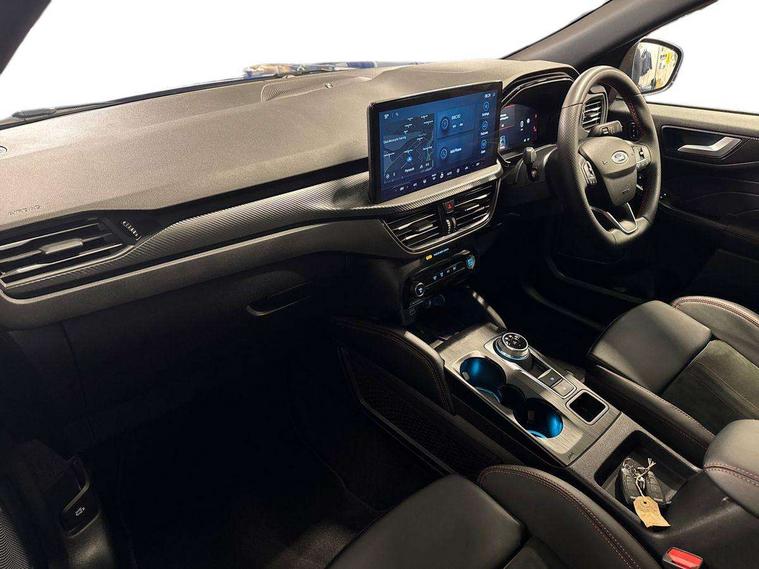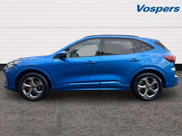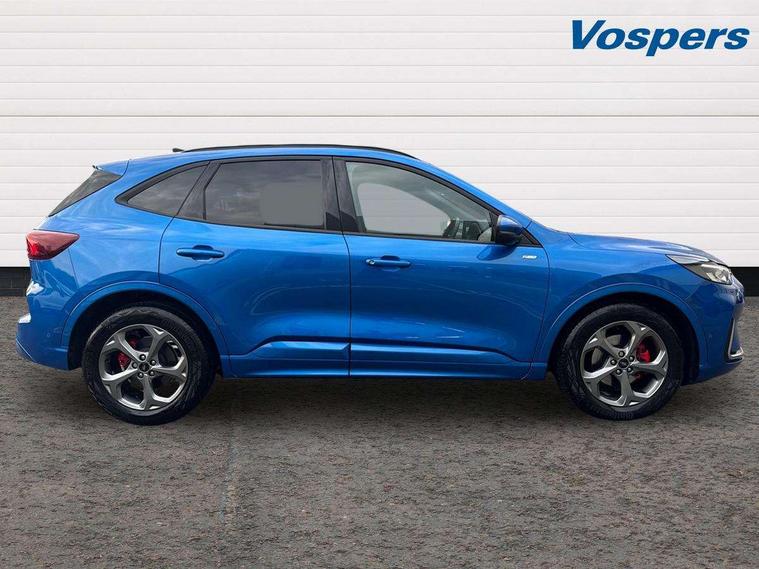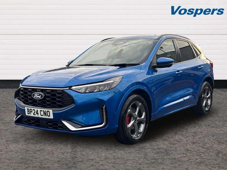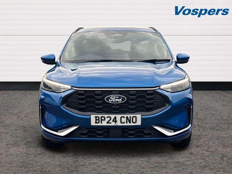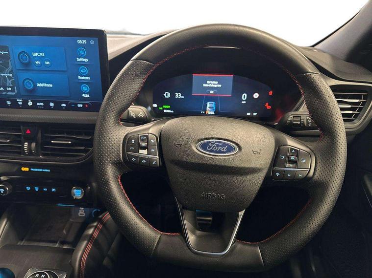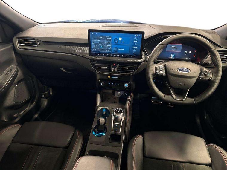 12.3" digital colour instrument cluster, 360 degree view camera, e-Call (emergency call), Ford easy fuel, Ford SYNC 4 Navigation with 13" touchscreen, DAB radio, emergency assistance, Andriod Auto/Apple CarPlay, 5G modem & Ford Pass connect, Front and rear parking sensors, Hands free power tailgate, Lane centering assist, Lane keeping aid with lane departure warning, Power assist steering, Selectable drive modes, Service interval indicator, Sports suspension, Twist beam rear suspension, B&O premium audio system with 10 speakers, subwoofer and 2 USB ports, Auto headlamps with high and low beam, Black roof rails, Body colour bumpers, Front LED fog lamps, Large rear spoiler, LED daytime running lights, LED rear lights, Pop out door edge protectors, Power front/rear windows with global close, Power heated folding door mirrors with puddle lights, memory function and camera, Quickclear heated windscreen, Rain sensing wipers, Rear privacy glass, Rear side wing doors, Rear wiper, ST-Line body styling kit, Third brake light, 12 way ergonomic power adjust driver's seat with memory (AGR certified), 12 way ergonomic power adjust passenger seat (AGR certified), 2nd row sliding seats, Electronic automatic temperature control (EATC), Front and rear head restraints, Partial premium touch sensico upholstery, Rear centre head restraint, Single front passenger seat, Sports seats, Driver assistance pack with intelligent adaptive cruise control - Kuga FHEV/PHEV, 3x3 point rear seatbelts, Airbags - front driver/passenger, front and rear curtain, Drivers knee airbag, Dynamic brake support, Electronic stability control (ESC) and ABS, Evasive steering assist, Ford MyKey Gen 2 safety system, Manual child proof rear door locks, Pre collision assist with autonomous emergency braking, Rear seat Occupancy alert, Red brake calipers, Tyre pressure monitoring system, Engine immobiliser, Keyless entry and Ford power start button (Keyless start), Locking wheel nuts, Remote powered central double locking doors, Thatcham category 1 alarm,