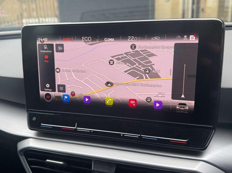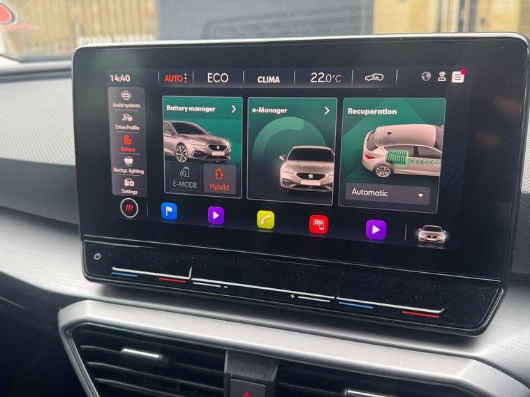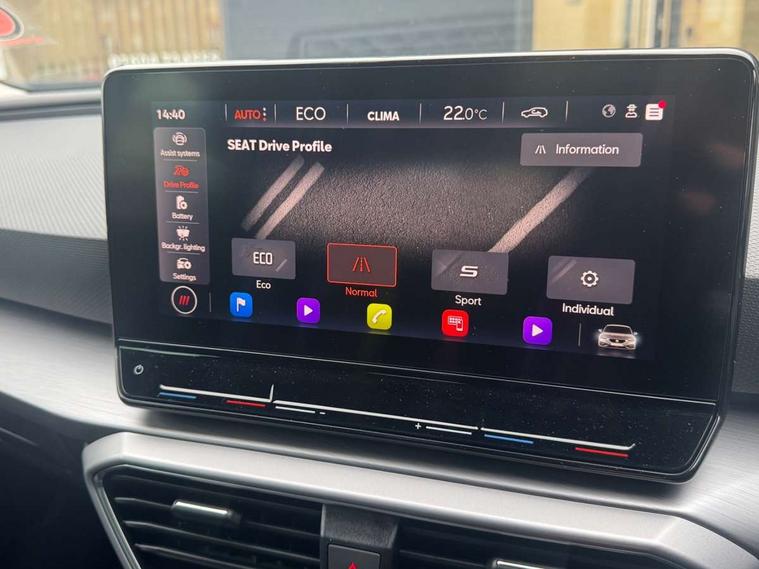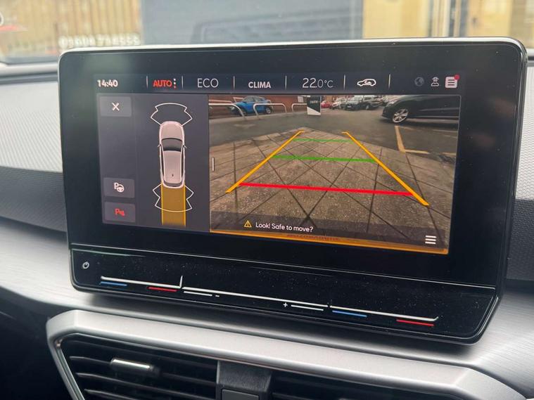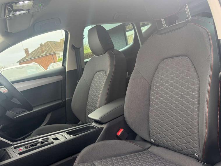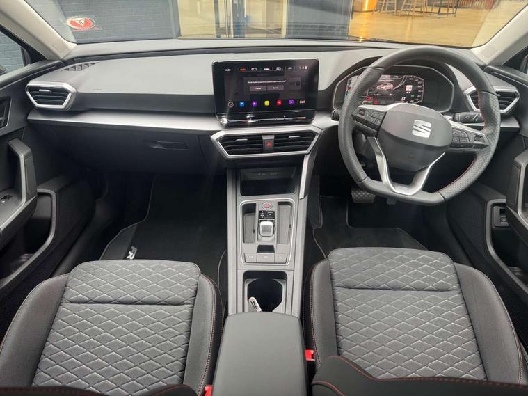 Digital cockpit, E-call, Front assist with forward collision warning braking reaction to vehicles, pedestrians and cyclists, Full link smartphone integration with Mirror Link, wireless Apple CarPlay and wired Google Android Auto, Lane assist, Lockable tailgate, Park assist (inc front/rear parking sensors), Power assisted speed sensitive electro-mechanical steering, Rear view camera, RPM, trip computer, outside temp gauge, instrument light brightness, low fuel warning light, lights on reminder, gearshift indicator, SEAT drive profile with 4 modes (Eco/Normal/Sport/Individual), throttle response and gearshift mode, Service interval indicator, Start/stop system with regenerative braking, 10 amp mode 2 charging cable, 16 amp mode 3 charging cable, Sports suspension, XDS electronic differential lock and dynamic traction support, 7 speakers, Auxiliary input socket, Auto dimming rear view mirror, Body colour door handles, Body coloured bumpers, Cosmo grey exterior mirrors with integrated LED indicators, Dark tinted rear windows, Dynamic headlight range control, Electric front/rear windows, Electrically adjustable, heated and folding door mirrors, FR sports bumper, Illuminated front door sill, LED front fog lamps, LED Headlights with dynamic turn signals, LED tail lights and rear fog lights with rear coast to coast lighting, Rear side wing doors, Rear wash/wipe, Separate daytime running light with automatic headlight control and coming home feature, Third brake light, Welcome light silhouette from exterior mirrors, Windshield wiper intermittent control with light/rain sensor, 12v power point in centre console, 3 seat bench in 2nd row, 60/40 split rear bench seat with armrest, Ambient lighting with glovebox, footwell and single monocolour, Cloth upholstery, Driver/passenger manual seat height adjustment, Dust/pollen filter, Folding boot cover, Four x USB Type C ports, Front and rear height adjustable headrests, Front and rear reading lights X 4, Front centre armrest, Front seatback storage pockets, Grey headlining, Height/reach adjust steering wheel, ISOFIX points in outer rear seats with top tether anchorage points, Luggage tie-down hooks, Lumbar adjustment for front seats, Single front passenger seat, Sunvisors with covered illuminated mirror, Three zone climate control, Media system plus with navigation - Leon, 3 point seatbelts on all rear seats, ABS, Brake control system - ESC and brake booster, Child proof door locks, Driver and front passenger airbags with front passenger airbag de-activation, front side and curtain airbags, Electronic parking brake, Extended safety system - seat belt tensioner, window closure and hazard lights, Hill hold control, Rear disc brakes, Seat belt reminder for front and rear seats, Tiredness recognition system, driver alert system, Tyre pressure monitoring system, Anti theft alarm system with interior monitoring in cab, backup horn and towing protection, KESSY Go (Keyless start), Locking wheel bolts, Wireless phone charging, Chrome interior detailing, 17" Dynamic Bi-spoke alloy wheels with 91W tyres, Emergency tyre repair kit, Tool kit,