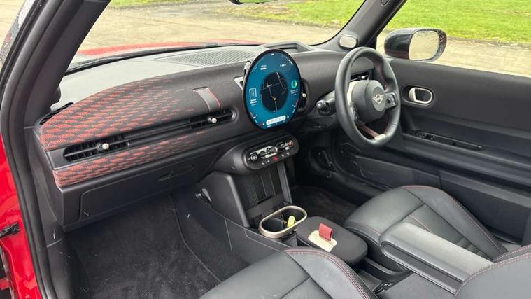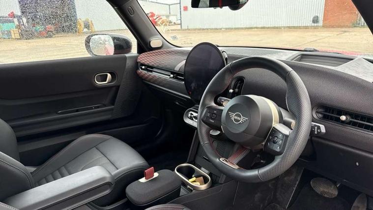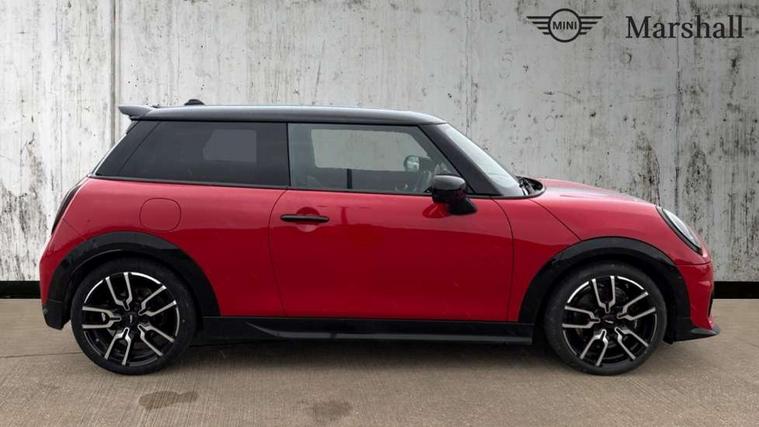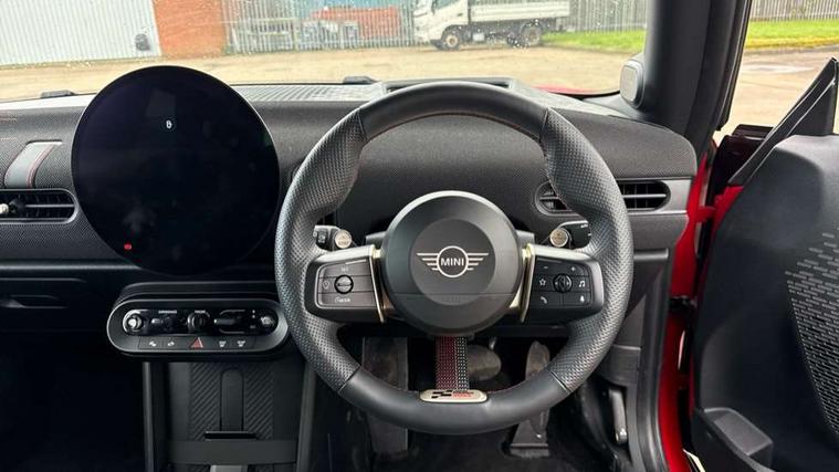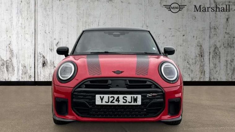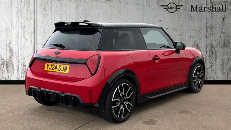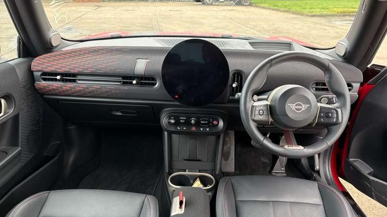 Central toggle bar, Circular OLED Screen, Compatible mobile phone bluetooth with audio streaming, Cruise control, Digital instrument cluster, Electro-mechanical speed dependant steering assistance, Emergency call service, MINI Experience Modes, Mini navigation system, On board computer, Service interval indicator, 7 speed steptronic sport transmission with double clutch, Adaptive suspension, DAB Digital radio, Personal eSim, Auto headlights, Electric adjustable heated door mirrors, Electric front windows, Front and rear apron, Heated rear window, Heated windscreen washer jets, High gloss black wheel arches, High gloss hexagonal patterned grille surround, JCW body kit, LED daytime running lights, LED indicator lights, LED rear lights, Rain sensor window wipers, Rear fog lights, Rear roof spoiler with airblades, Rear window wiper, 2 seat bench in second row, 2 zone automatic air conditioning, 60/40 rear seat bench, Ambient lighting, Cupholders, Dark headliner, Floor mats, Front and rear head restraints, Front compact armrest, Heated steering wheel, Height adjustable passenger seat, Lidded storage box in Black/Red knit, Luggage compartment lighting, Perforated Vescin steering wheel, Single front passenger seat, Steering wheel paddle shift, Sunvisors with vanity mirrors, Vescin/Cord upholstery, Driving assistant pack - Cooper Hatchback, Level 1 pack - Mini Hatchback, Park assistant pack - Cooper Hatchback, 3 point seatbelts on all four seats, 6 Airbags - front, side, head and seat belt tensioners, Acoustic pedestrian protection, Anti-lock braking system (ABS), Brake caliper in Black with JCW badge, DSC - Dynamic Stability Control, Electronic parking brake, Front and rear disc brakes, Front ISOFIX (iSize), Front passenger airbag deactivation, JCW Sport Brakes, Traction control, Tyre pressure monitoring system, Alarm, Immobiliser, Remote central locking, Black/Red decorative dash strap, JCW Black/Red dashboard knit, 18" JCW Lap spoke 2-tone alloy wheels, Tyre repair kit,