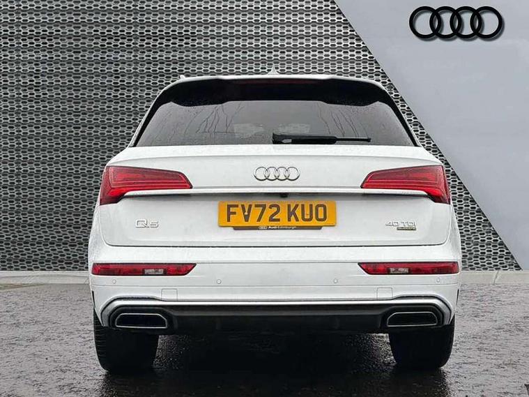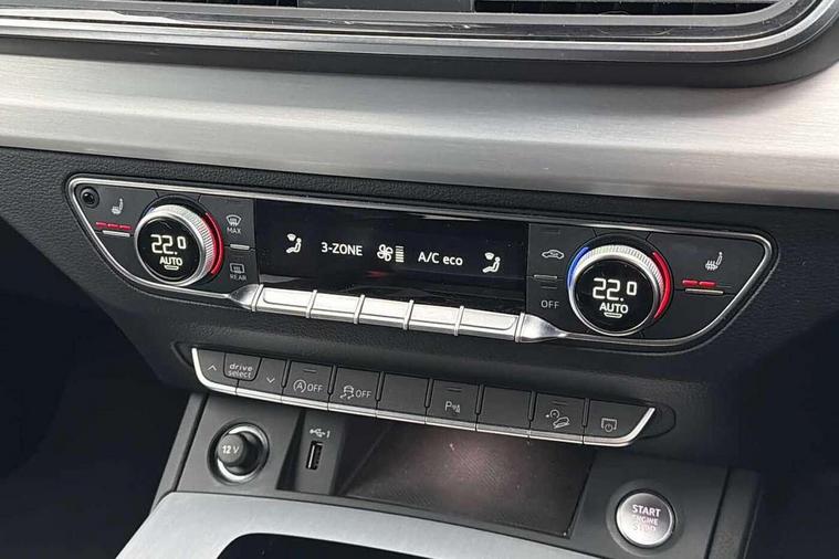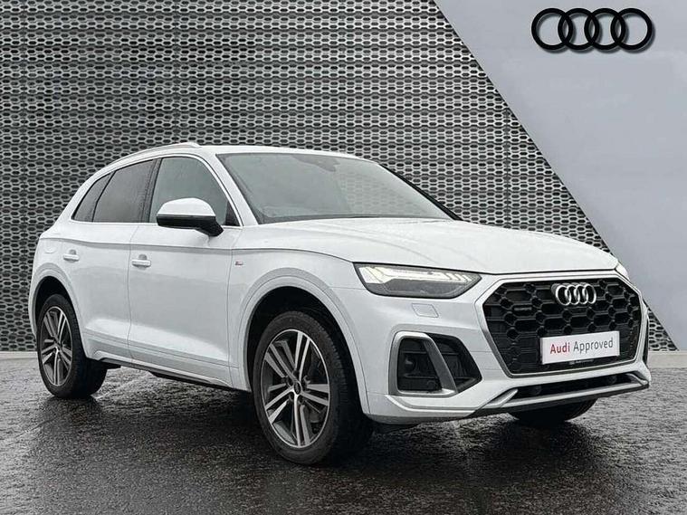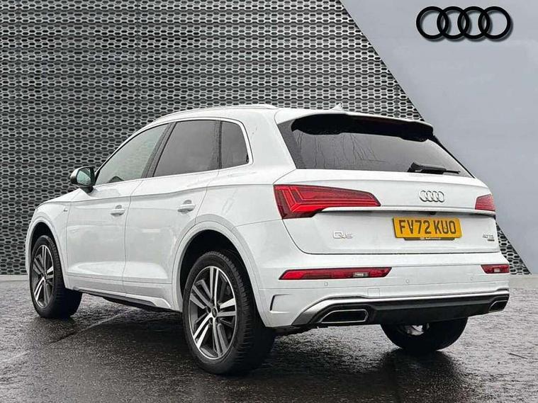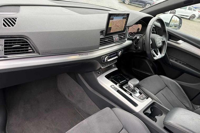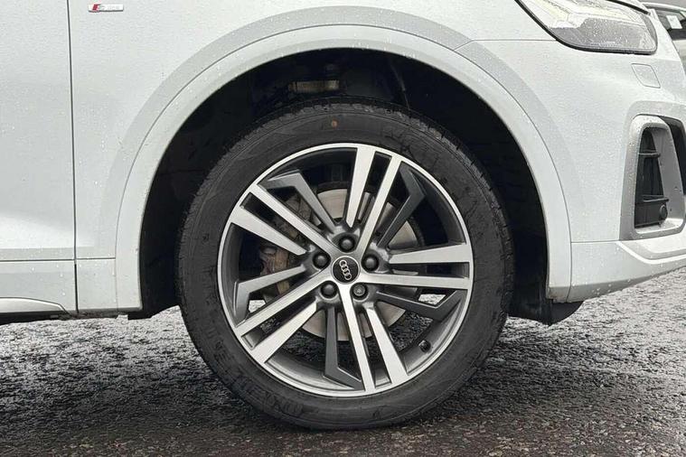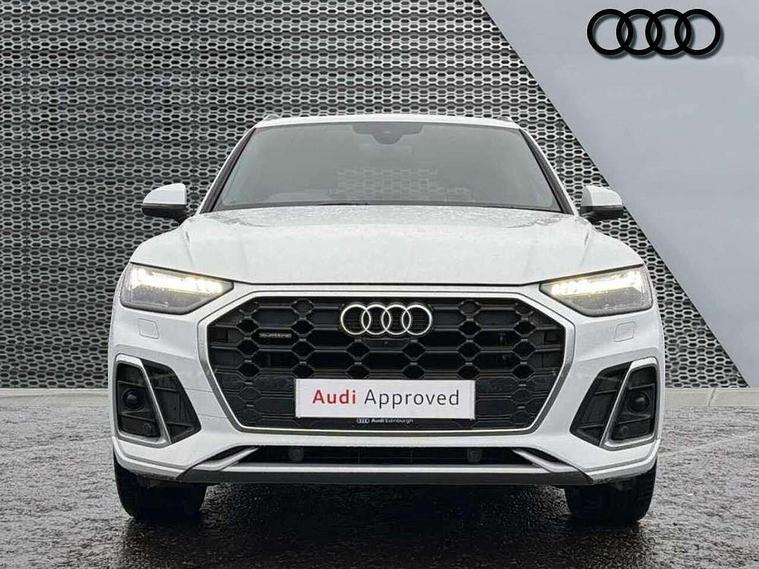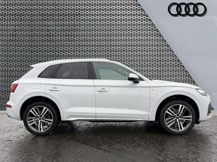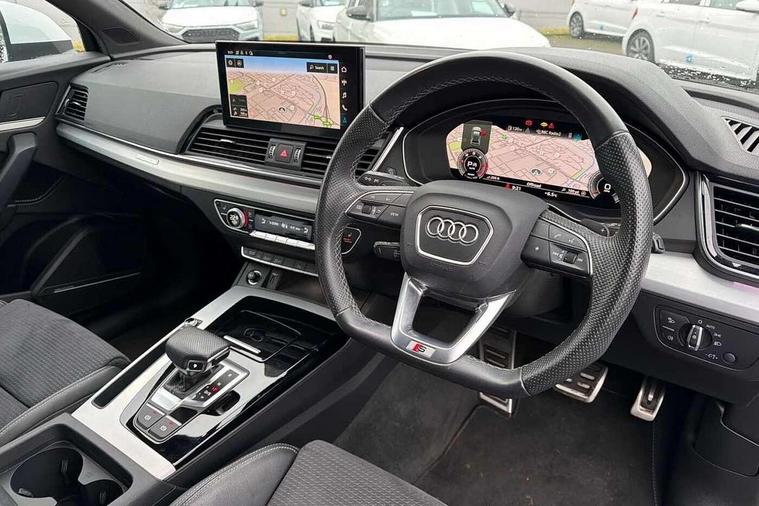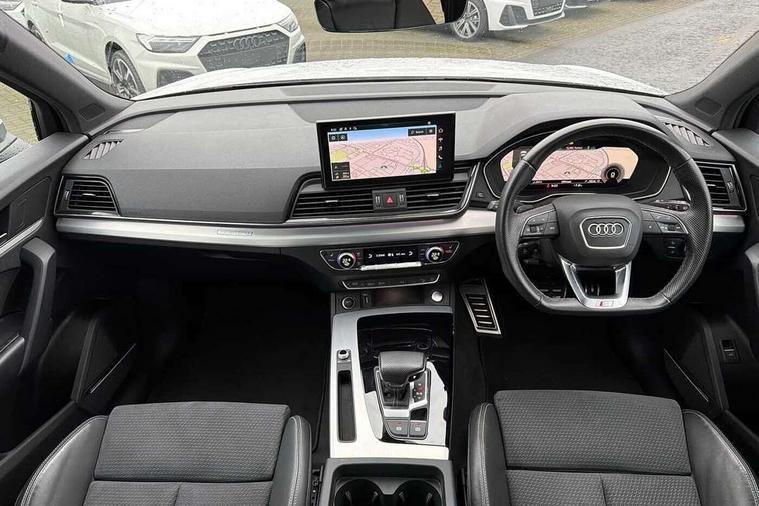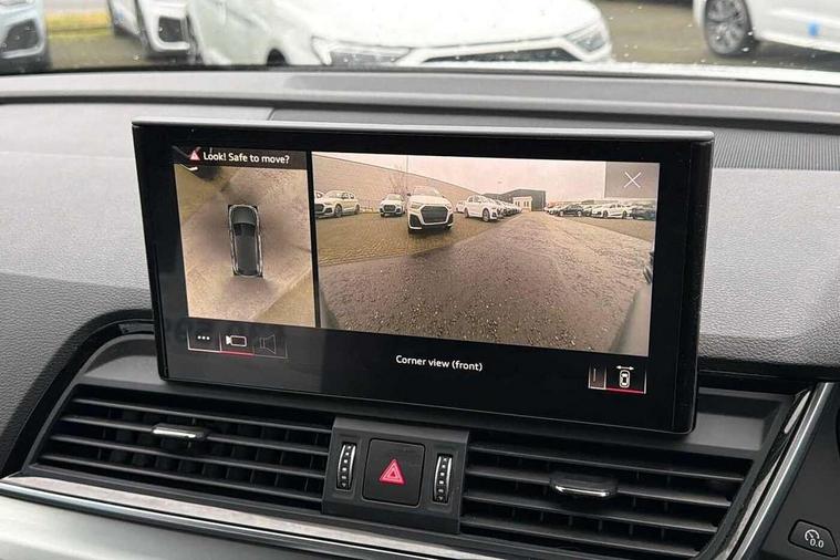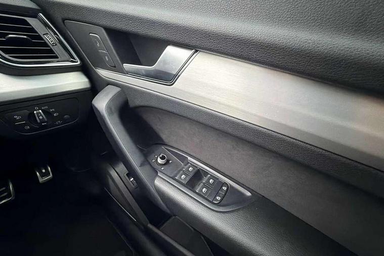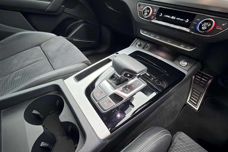 Audi connect safety and service (e-call), Audi connect with Amazon Alexa Integration, Audi drive select, Audi virtual cockpit plus with 12.3" screen and three different layout designs, Audi wireless smartphone interface, Automatic start-stop system with coasting functionality and efficiency programme, Bluetooth interface, Electro - mechanical power assisted steering, MMI navigation plus with 10.1" touch screen, Power tailgate, Reversing camera, Service interval indicator, Voice control system with Audi hotword activation "Hey Audi", Diesel particulate filter, Quattro on demand, S line sports suspension, DAB Digital radio, Acoustic windscreen, Aluminium roof rails, Audi matrix LED headlights with dynamic front and rear indicators, Auto dimming door mirrors, Auto dimming rear view mirror, Automatic headlight adjustment, Automatic headlights and windscreen wipers, Body colour bumpers, Body colour door mirrors, Body colour rear diffuser with matt aluminium silver surrounds, Body colour underbody protection, Chrome plated exhaust trims, Daytime running lights, Door sills in Selenite silver, Electric adjustable/heated/folding door mirrors, Front air inlet surrounds in aluminium, Front and rear electric windows, Front radiator grille in honeycomb design, Headlight washers, High level LED brake light, Lower bumpers painted in contrast Manhattan grey, Rear chrome trim strip below lights, Rear privacy glass and rear side windows, Rear side wing doors, Rear wiper, Roof bars, S Line badges on the front wings, S Line front and rear bumpers, S Line rear spoiler, S Line side skirts, 2 x USB charging port with aux input socket, 3 rear headrests, 40:20:40 split folding 3 rear bench seat in 2nd row with rear centre armrest, Black cloth headlining, Comfort front centre armrest, Contrast stitching on seats, steering wheel and gear lever gaiter, Deluxe 3 zone electronic climate control, Front/rear floor mats, Gear lever in black leather, Heated front seats, Height adjustable front head restraints, Height/reach adjustable steering column, Illuminated door sill trims with S logo, ISOFIX child seat mounting and top tether, Luggage compartment cover, Manual seat adjustment with 4-way electric lumbar support, Removable luggage compartment floor, Single front passenger seat, Stainless steel pedals, Sunvisors with vanity mirrors, High gloss pack - Q5, LED interior light pack - Q5, 3 point seatbelts on all seats, 6 airbags - Driver, front passenger, curtain and side airbags, Electrically operated child locks on rear doors, Electromechanical parking brake, Electronic stabilisation control including ABS, ASR and EDL, Front passenger airbag deactivation, Hill descent control, Hill hold assist, Multi collision brake assist, Pop-up bonnet for pedestrian protection, Pre sense city, Seat belt force limiter, Seatbelt monitoring, Tyre pressure warning, Warning triangle and first aid kit, Anti theft alarm, Anti-theft wheel bolts, Keyless Go access/ignition system, Remote central locking, Matt brushed aluminium inlays,