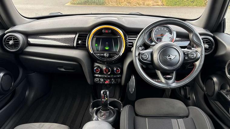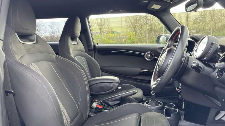 Automatic start/stop function with brake energy recuperation, Compatible mobile phone bluetooth with audio streaming, Electro-mechanical speed dependant steering assistance, Instrument cluster, Mini E-call, MINI TeleServices, On board computer, Service interval indicator, Double Vanos system, Fully variable valve control, High precision injection, Performance Control, Steptronic sport transmission with double clutch and steering wheel paddles, 6.5" touchscreen with LED ring, FM tuner and DAB digital radio, Automatic headlight activation switch, Bonnet scoop, Chrome border honeycomb structure radiator grille with S badge, Chrome plated fuel cap, Dynamic brake lights, Electric front+rear windows, Heated rear window, Heated windscreen washer jets, John Cooper Works - aerodynamic kit (front and rear apron, spoiler), front and rear sport bumpers and part-painted side sills with door sill finishers, John Cooper Works rear spoiler, LED headlight with closed ring and daytime driving lights, Metal door sill strips with Cooper S imprint, Model logo Cooper S on right of tailgate, Rain sensor window wipers, Rear fog lights, Rear LED lights with union jack design, Rear window wiper, Side scuttle panel with integrated indicator, Sun/heat protection glass, Two central exhaust tailpipes with chrome finisher, White indicator lenses, 12V Accessory socket in centre console, 4 lashing eyes in luggage compartment, 60/40 split folding rear seat, Anthracite headlining, Chrome interior highlights, Cupholders, Front and rear head restraints, Front and rear isofix with front passenger airbag deactivation, Glove compartment, Height and length steering column adjustment, Interior lighting with 12 basic colours selectable via toggle switch in roof, John Cooper Works leather steering wheel with contrasting stitching in Chilli Red with John Cooper Works logo, John Cooper Works Logo in seat, Leather gearshift lever and handbrake gaiters, LED reading lights, vanity mirror lights, front foot well light and spotlight on front seats, Manual air conditioning, Mechanical seat adjustment, driver seat height adjust, forward/back and front seats backrest, Mini logo projection on floor from drivers exterior mirror, Multifunction steering wheel, Storage compartments in doors, Storage pocket on back of front seats, Sunvisors with vanity mirrors, 3 point seatbelts on all four seats, 6 Airbags - front, side, head and seat belt tensioners, Anti-lock braking system (ABS), DSC - Dynamic Stability Control, Front and rear disc brakes, Hill start assist, Two tone horn, Tyre pressure monitoring system, Alarm system with tilt sensor, monitoring doors, bonnet interior and tailgate, Electronic vehicle immobiliser, Start/stop toggle with keyless go, Tool kit,